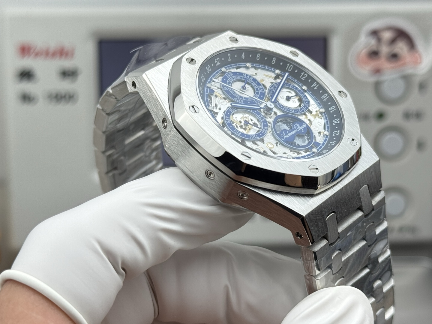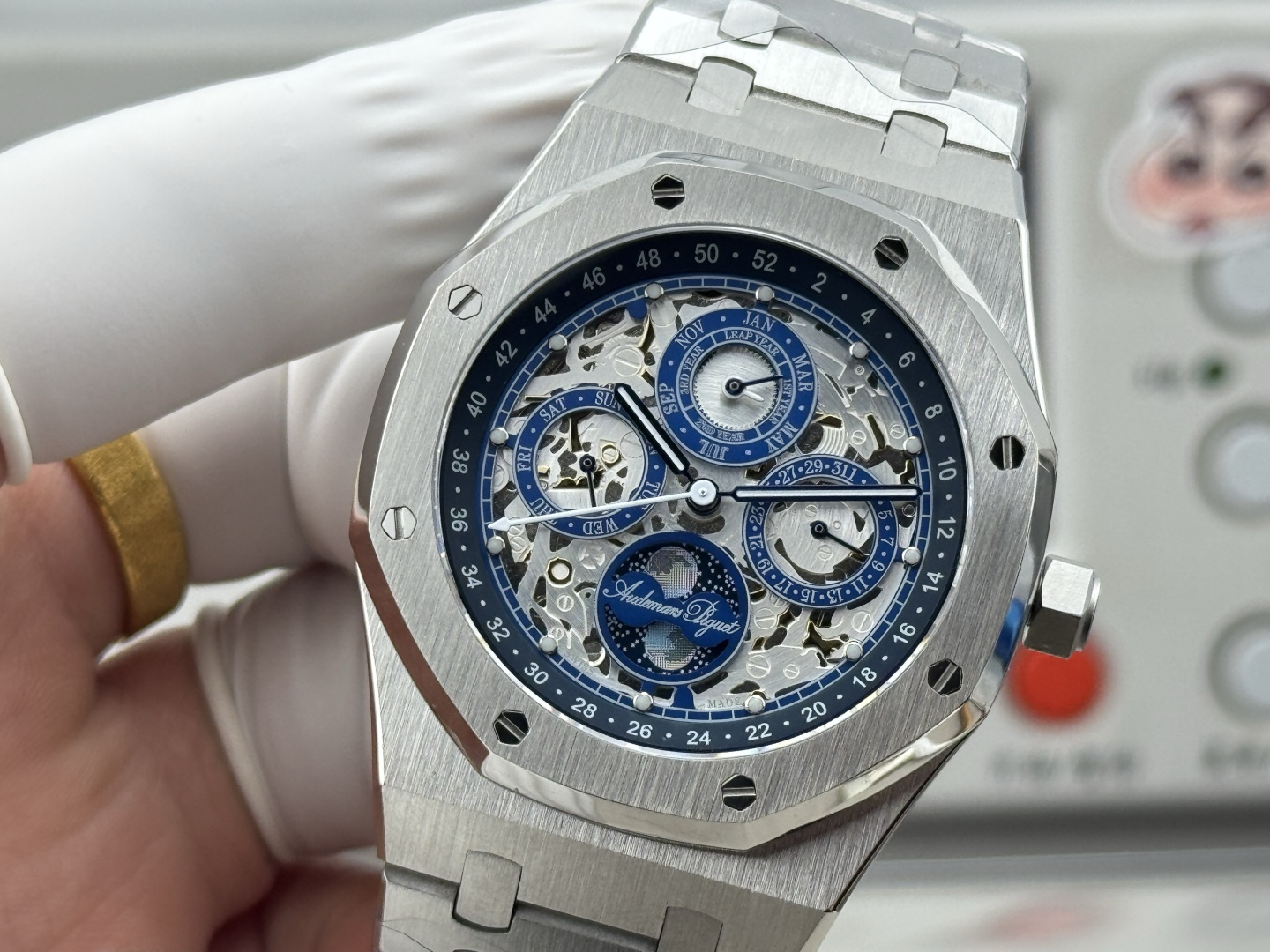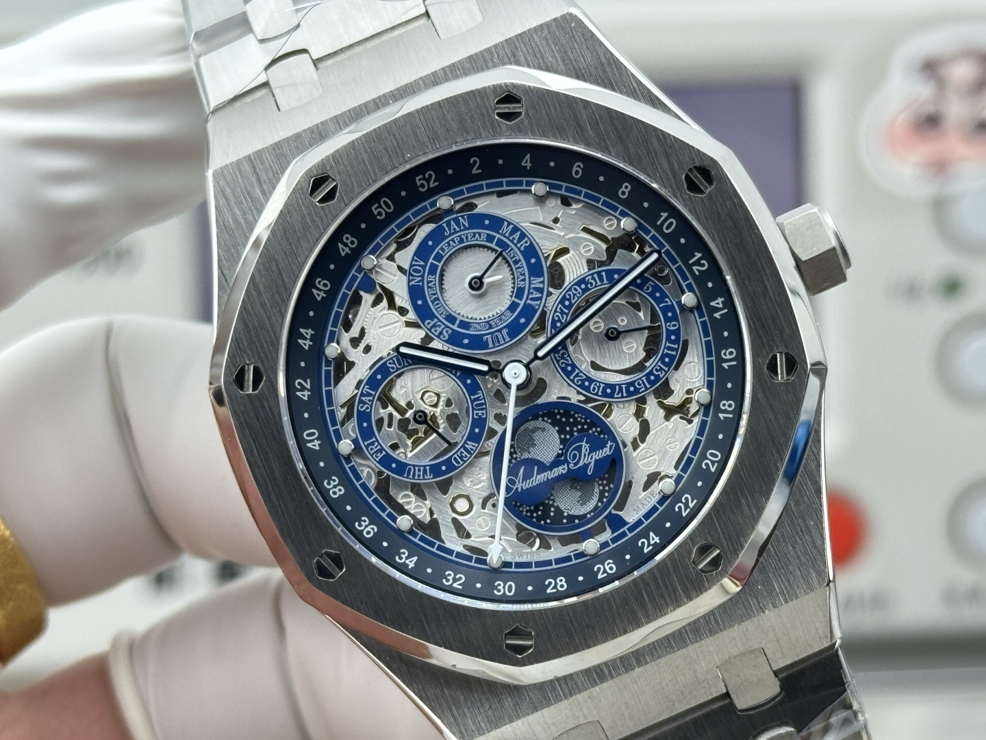 The Royal Oak 26574st boasts a customized Cal. 5134 movement, revered for its precision and complexity. This movement supports a range of genuine functionalities, including a calendar, day, month, and moon phase, all operable and synchronized with the wearer’s lifestyle. Such engineering prowess not only reflects the brand’s commitment to functional excellence but also challenges the perception of luxury watches as mere status symbols, positioning them as practical tools for personal organization.