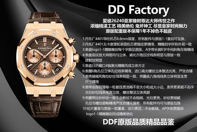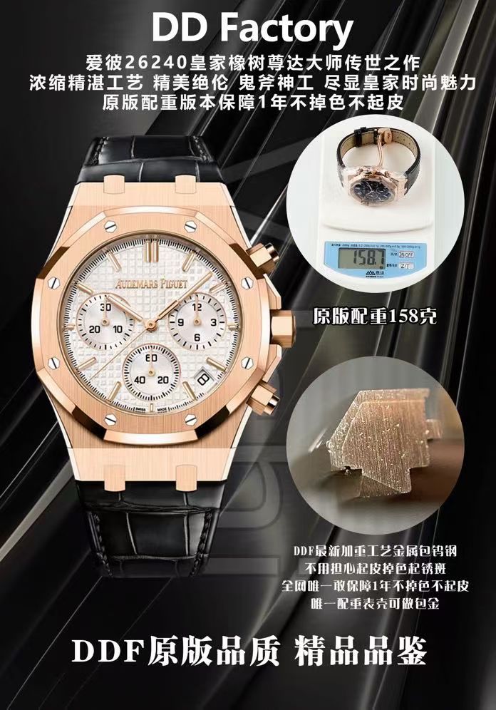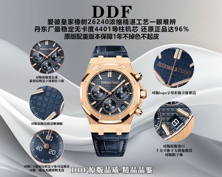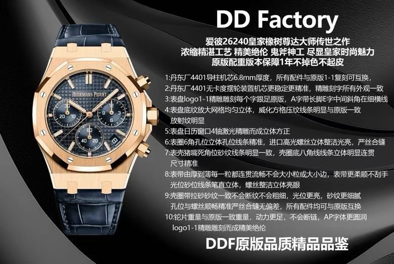The allure of luxury timepieces often transcends the mechanical beauty of their components, drawing attention to the very essence of craftsmanship and elegance. The DDF Audemars Piguet 26240 Royal Oak stands as a testament to this exquisite artistry, encapsulating the opulence and aesthetics associated with the Royal brand. This article explores not only the detailed features of the DDF replica but also the broader implications of choosing replicas within the luxury watch market.