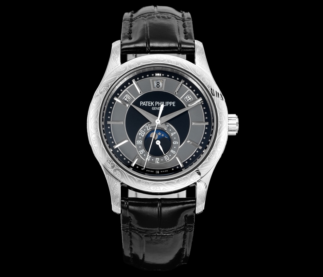 The Patek Philippe 5205G-013 emerges as a paragon of the complex and multifunctional series, marking a significant milestone in the realm of luxury sports watches with its highly intricate craftsmanship. This remarkable piece stands as the first engraved Nautilus watch in the series, showcasing the heights of technological sophistication in a casual sports aesthetic.