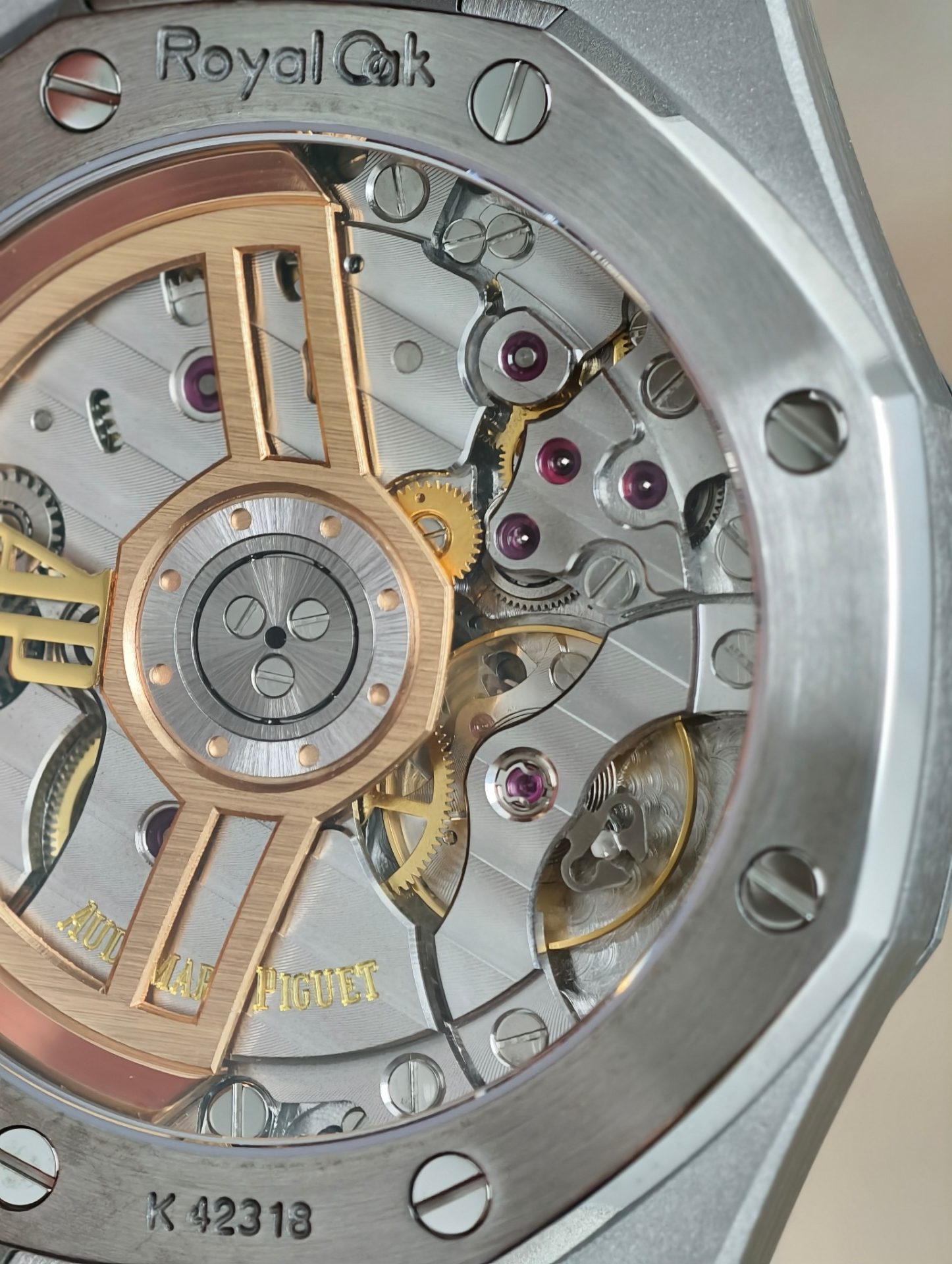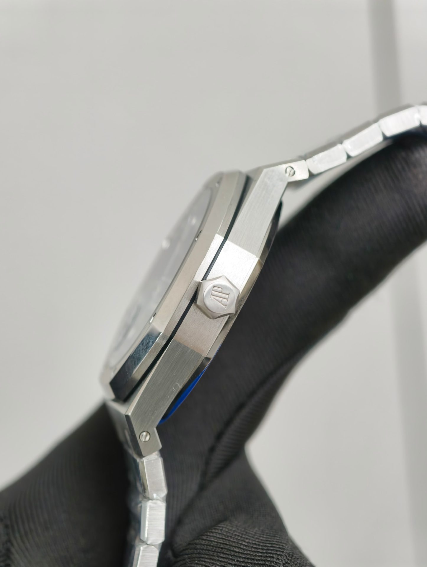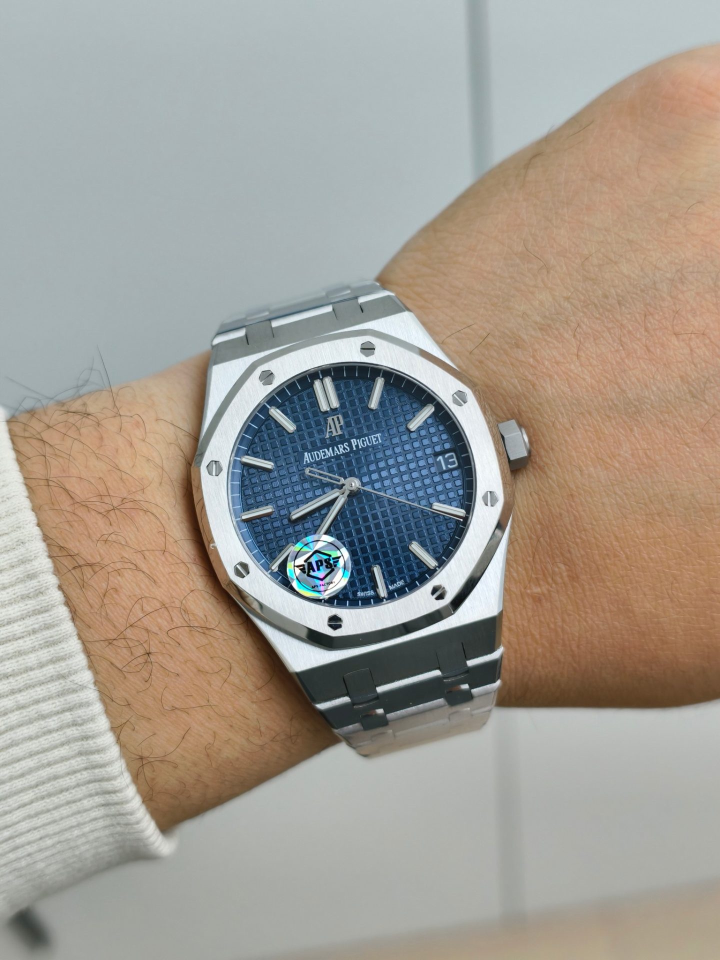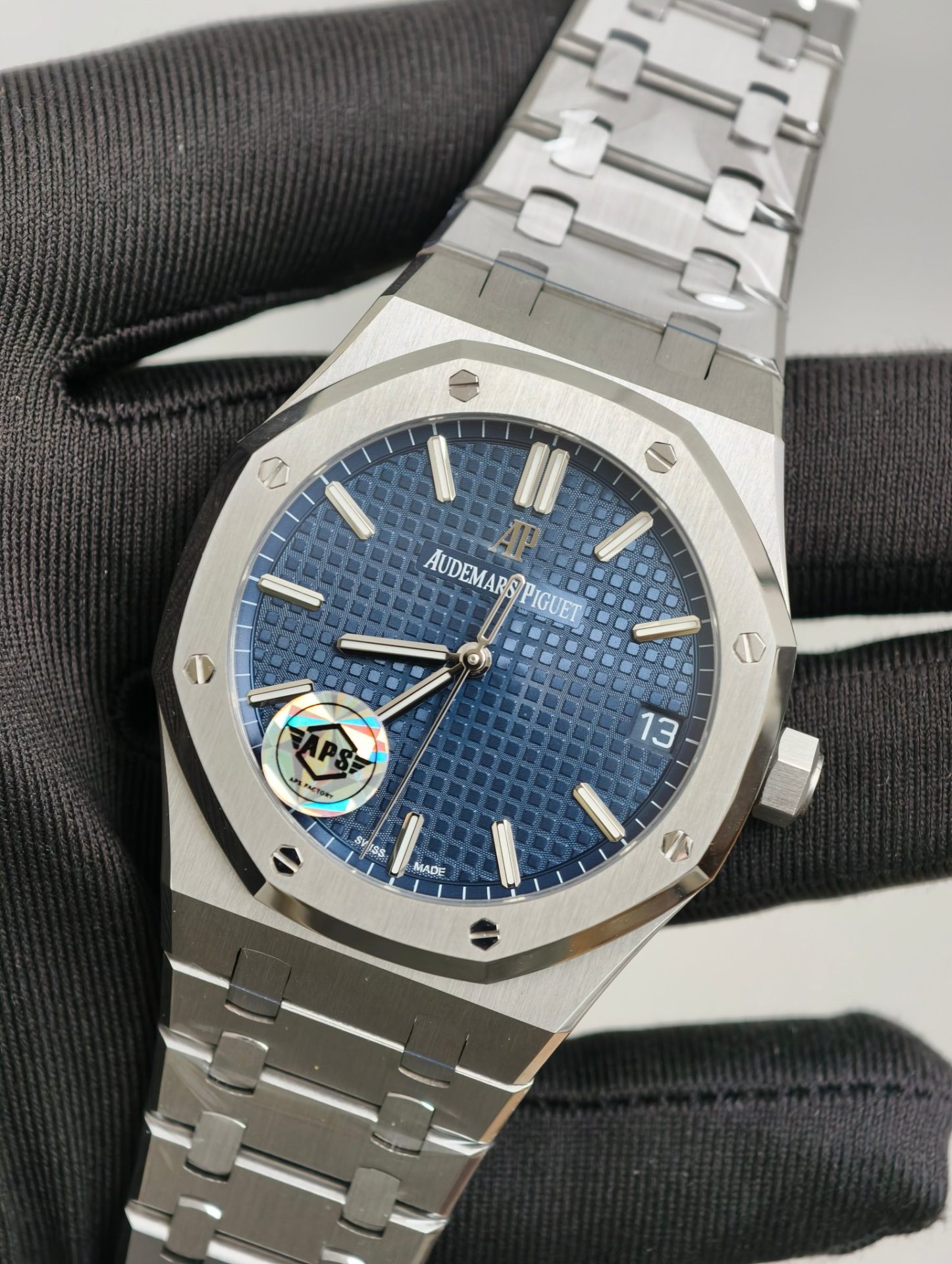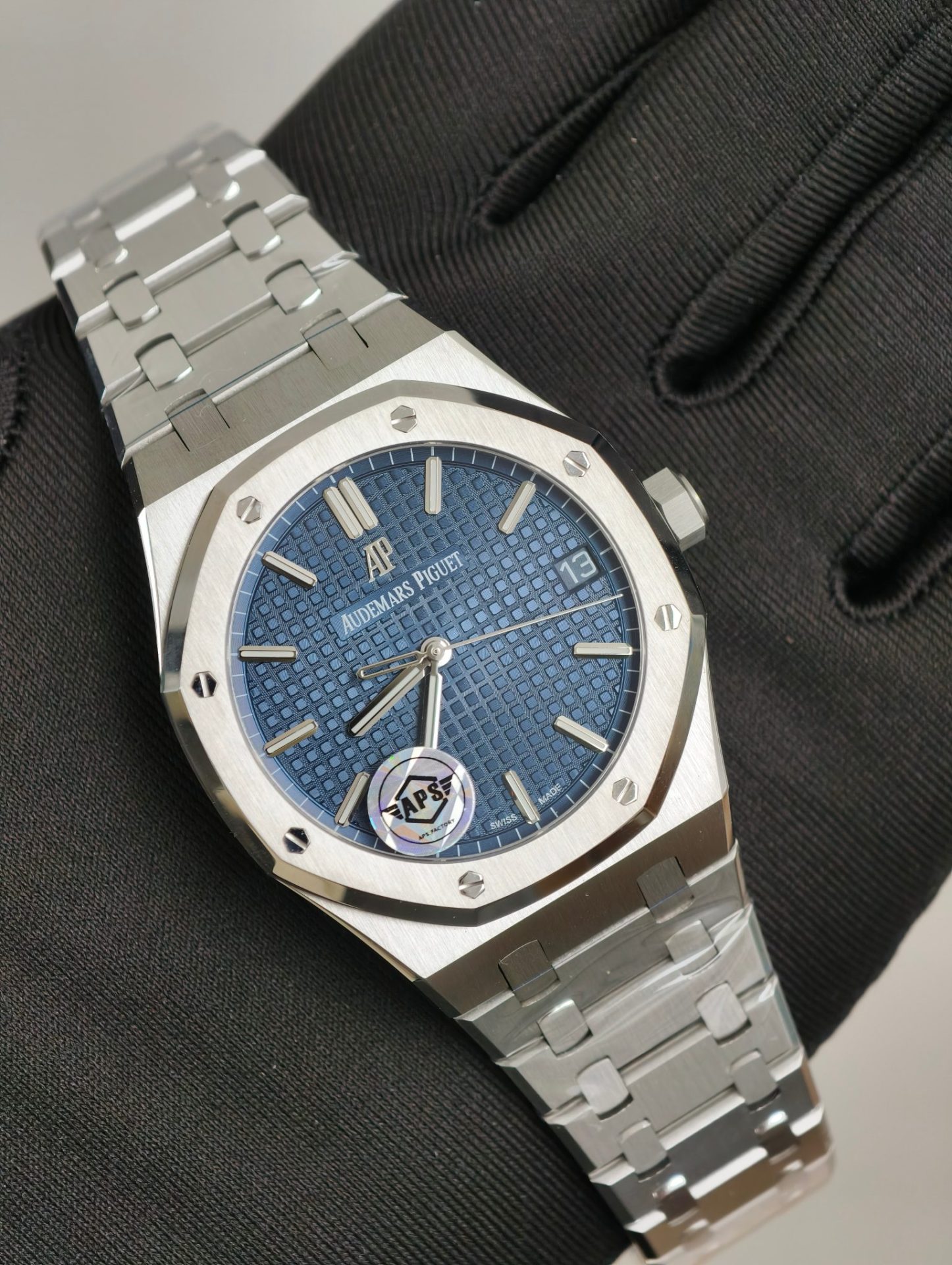 At a glance, the APS replica captures the essence of its Swiss counterpart, particularly through the dial’s sunburst effect. The meticulous craftsmanship of the dial, reminiscent of the original’s tapisserie pattern, invites a discussion on the art of watchmaking that transcends geographical boundaries. The bluish hue, gleaming under light, serves not merely as an aesthetic choice but as a subtle homage to the oceanic themes that inspired the Royal Oak’s original design by Gerald Genta.