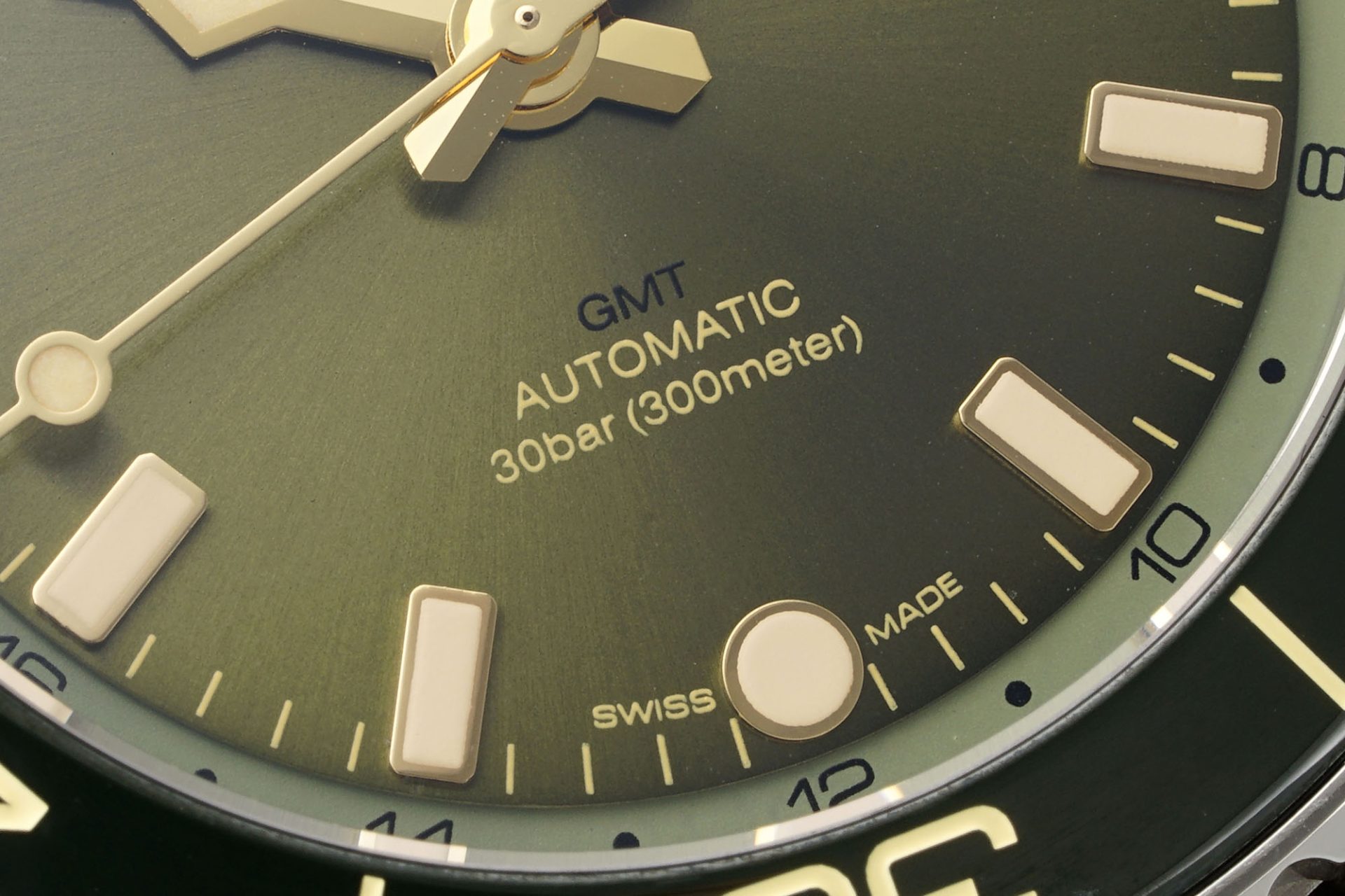 The watch is meticulously crafted from stainless steel, with a finish that skillfully combines polished and brushed textures. This dual treatment not only enhances the watch’s visual appeal but also augments its tactile elegance—demonstrating a commitment to both aesthetics and functionality. Diverging from the standard design seen in other GMT diver watches, the 24-hour GMT scale ingeniously resides at the dial’s periphery, while the bezel retains its quintessential diving timer function. This design innovation ensures that neither the diving nor the GMT functionality is compromised, achieving a harmonious coexistence.