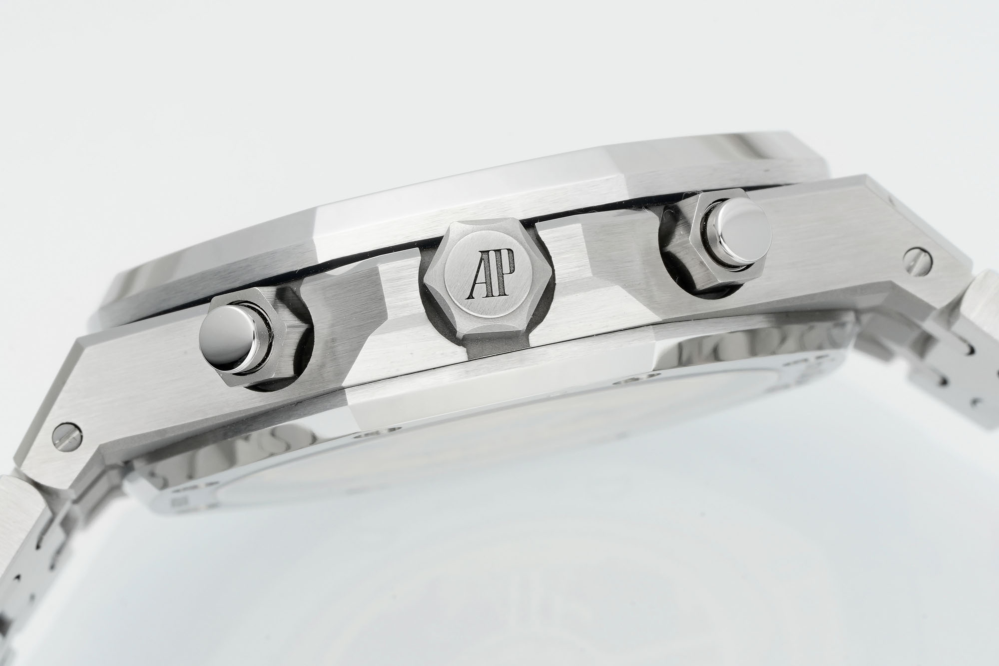 The 26240 is powered by the Dan Dong Factory 4401 column wheel movement, boasting a mere 6.8mm thickness. Its stability and precision are enhanced by a free-sprung balance wheel system, ensuring reliability akin to its authentic counterpart. This precision is further exemplified in the dial’s logo, where meticulous craftsmanship replicates each letter, including the elongation of the ‘A’ and the angled midsection of the ‘E’. Such details underscore the artistry involved and the painstaking effort to match the original design.
