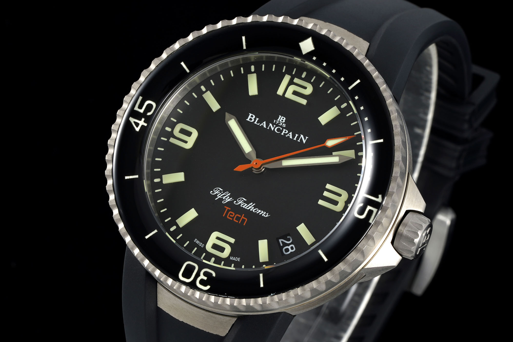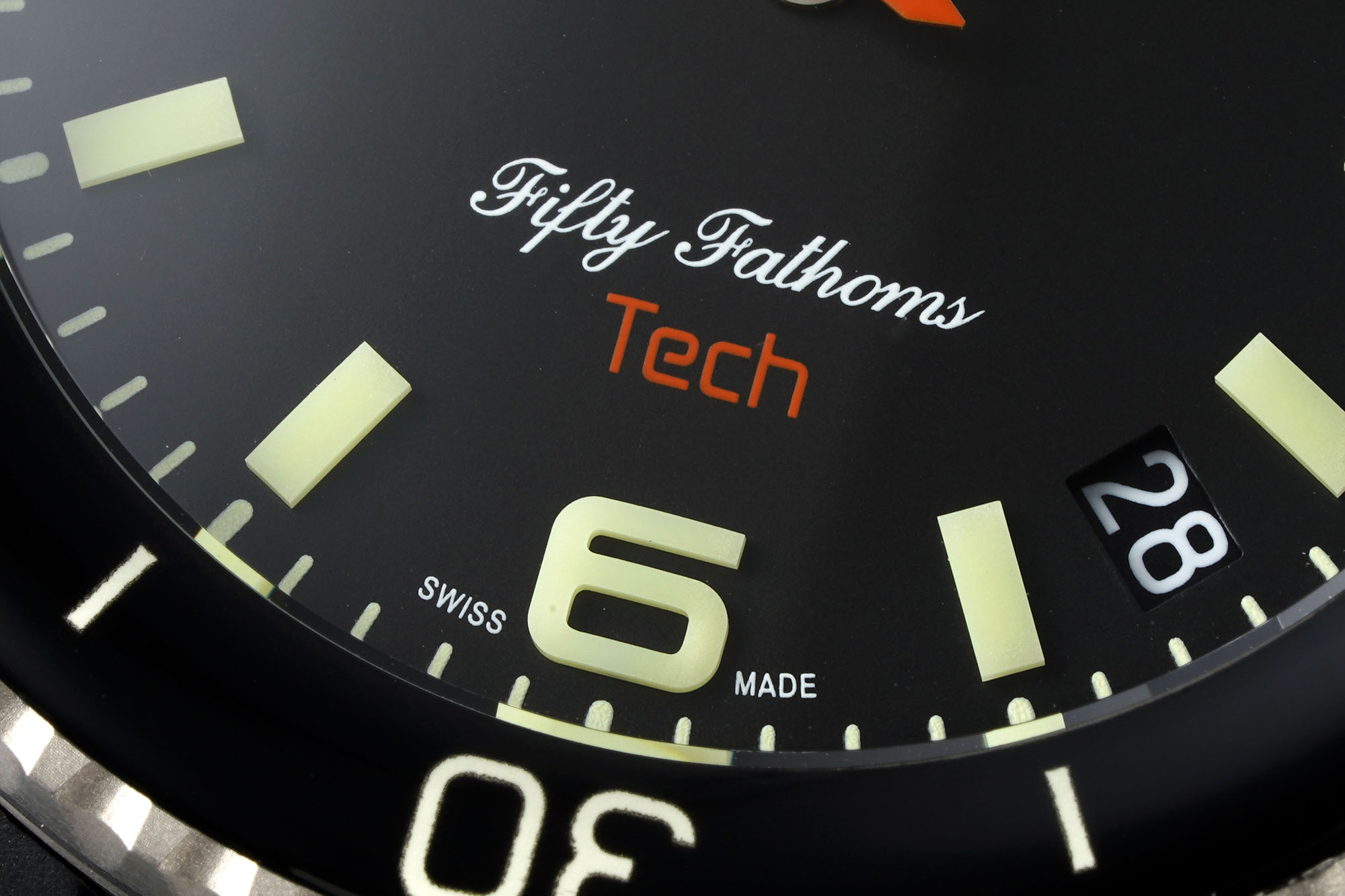 Readability in low-light conditions is a hallmark of effective dive watches. The “Pure Black” dial on the Tech 45 absorbs up to 97% of ambient light, critical for visibility during low-visibility dives. Super-LumiNova-coated large square indices ensure the watch face shines brightly enough to catch the diver’s eye at crucial moments. The central seconds hand pairs with vibrant orange accents, including the “TECH” inscription at six o’clock, adding a functional yet stylish flair. The color choices not only enhance visibility but also resonate with the contemporary aesthetic trends.