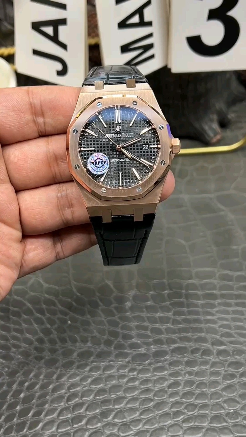 The Audemars Piguet Royal Oak 15400 v3 in rose gold with a leather strap, measuring 41mm by 9.8mm and featuring…