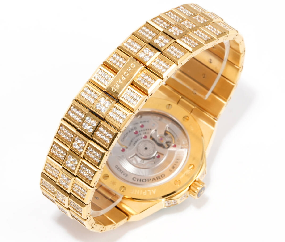 The watch’s bracelet is a standout feature, crafted uniquely to replicate the robust aesthetics of gold brick-type chain links, offering a seamless integration into the world of luxury. This design choice is not merely about style but speaks to a deeper narrative of strength and elegance that Chopard aims to convey.