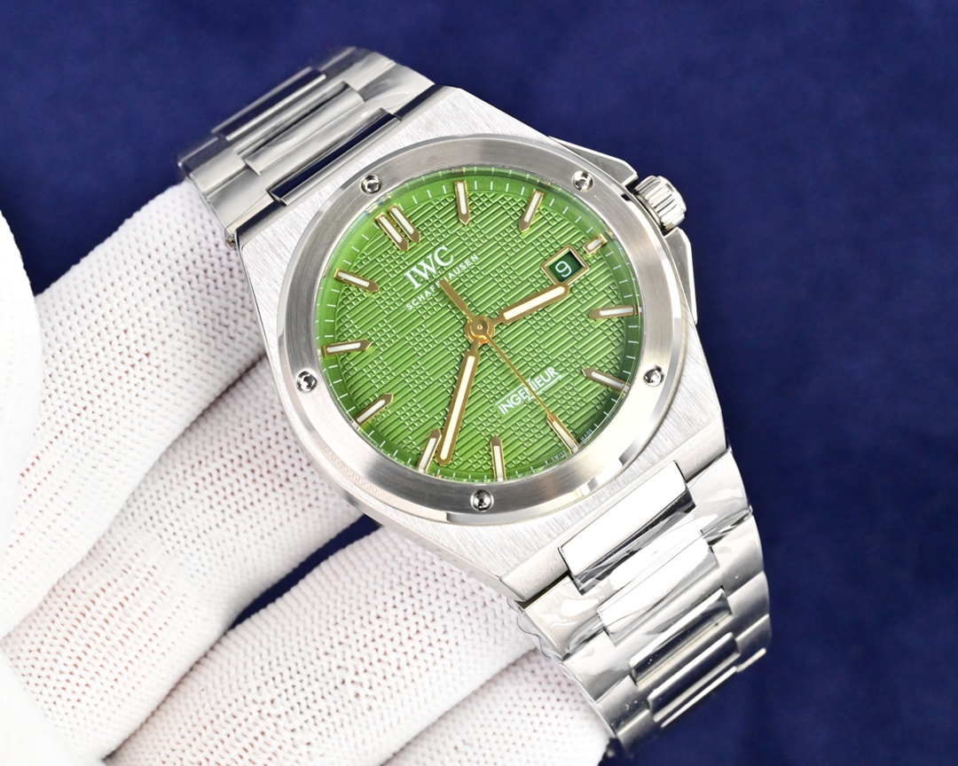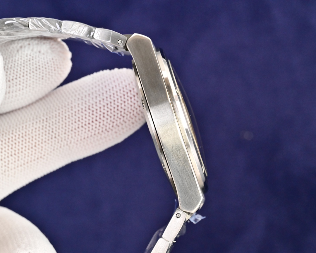 The Ingenieur’s case, crafted from 316L stainless steel, features a smooth, brushed finish that captures light and enhances its sleek lines. With a 40mm diameter and a thickness of 10.8mm, it maintains the proportions of the authentic model, ensuring that wearers experience the true Ingenieur feel. The bezel, studded with five meticulously placed screws, lends an architectural beauty, reminiscent of the watch’s engineering roots. The dial, adorned with luminous-filled indices and a patterned texture, is equally captivating. The glow-in-the-dark blue light showcases the “INGENIEUR” emblem under a sapphire crystal, balancing form and function seamlessly.