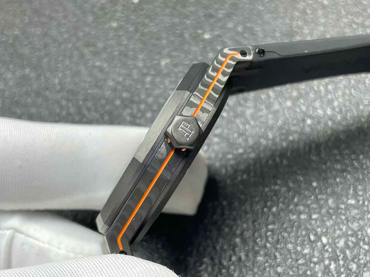 At its core, the VOIDLINE AP series represents a milestone in horological design, with the Royal Oak 15500 model showcasing a carbon fiber case that weighs a mere 85 grams. This avant-garde approach elevates not only the physical properties of the watch but also its aesthetic appeal. The 41mm case, crafted from carbon fiber, aligns with the modern demand for robustness combined with minimal weight, while the black DLC-coated bezel and case back fortify the structure against everyday scratches and wear.