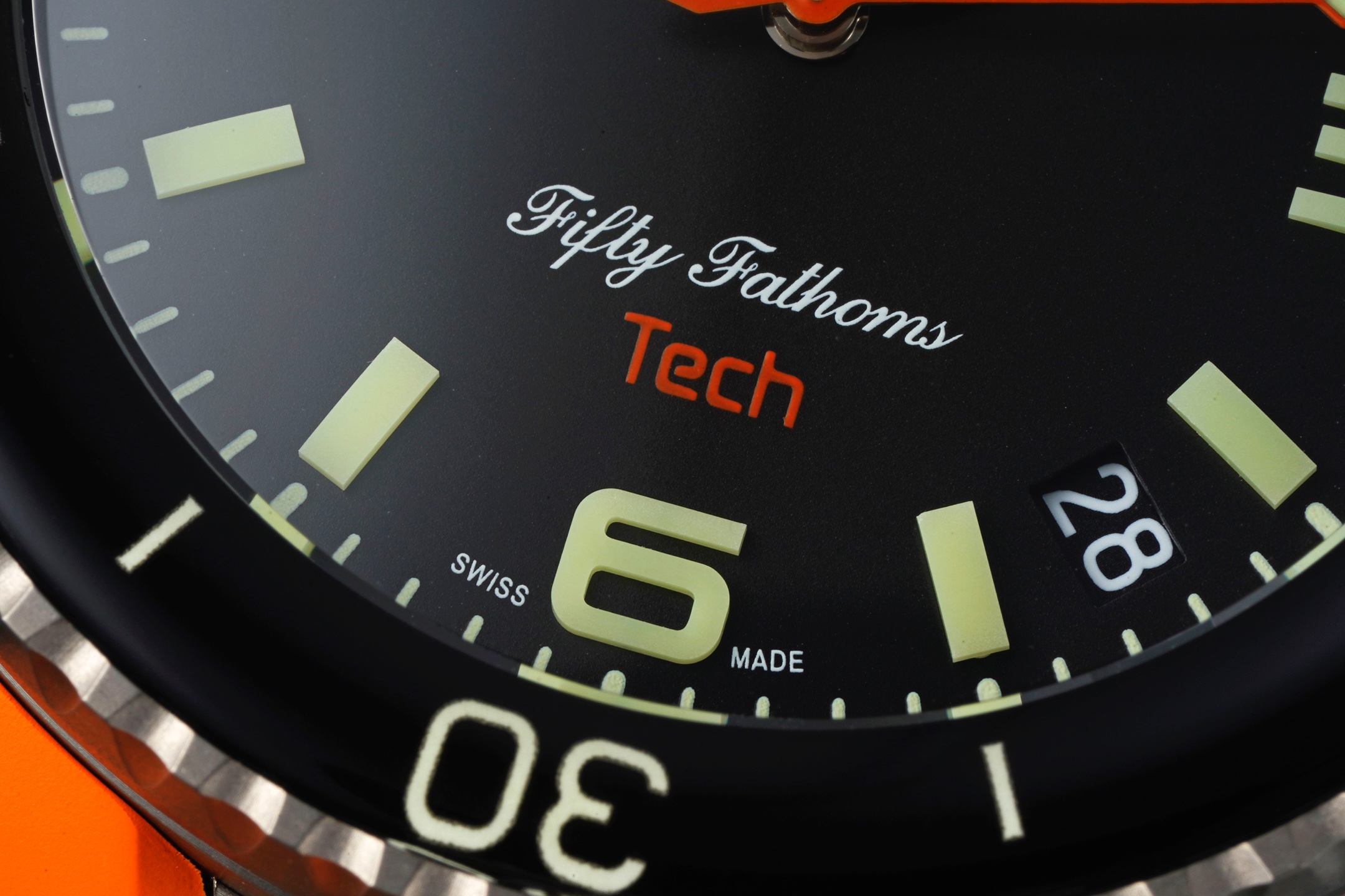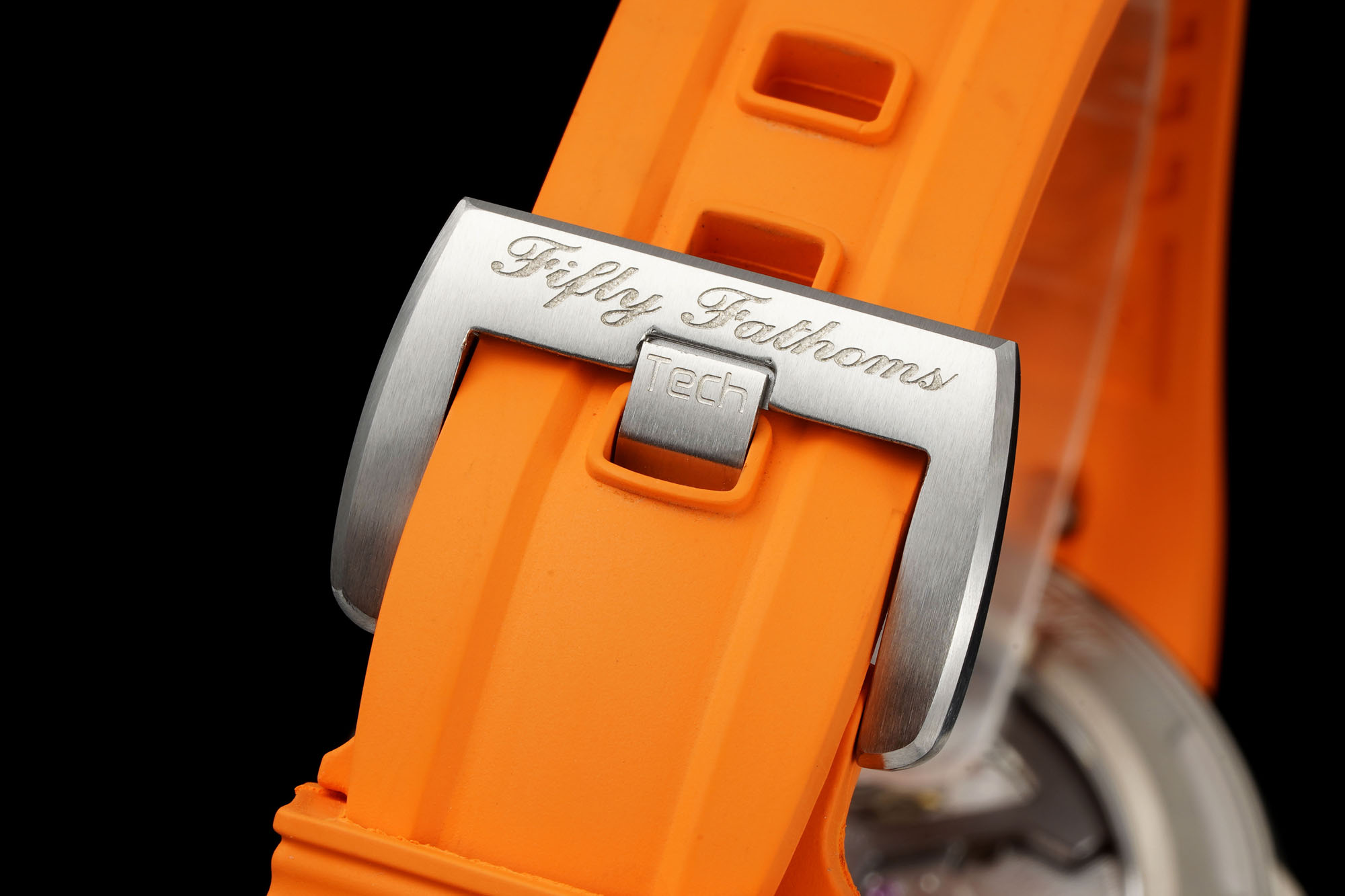 The Tech 45 features a ‘pure black’ dial that absorbs up to 97% of ambient light, a significant advantage when diving in low-visibility conditions. This innovation ensures superior legibility, aided by large, blocky indices coated in Super-LumiNova. The luminous material allows for exceptional readability, even in the depths of the ocean where light is a rare commodity. Noteworthy details include the central seconds hand and ‘TECH’ inscription at the 6 o’clock position, both in bright orange, offering a pop of color that not only enhances visibility but complements the watch’s aesthetic appeal. These features make the Tech 45 not just a functional piece, but a visually striking one as well.