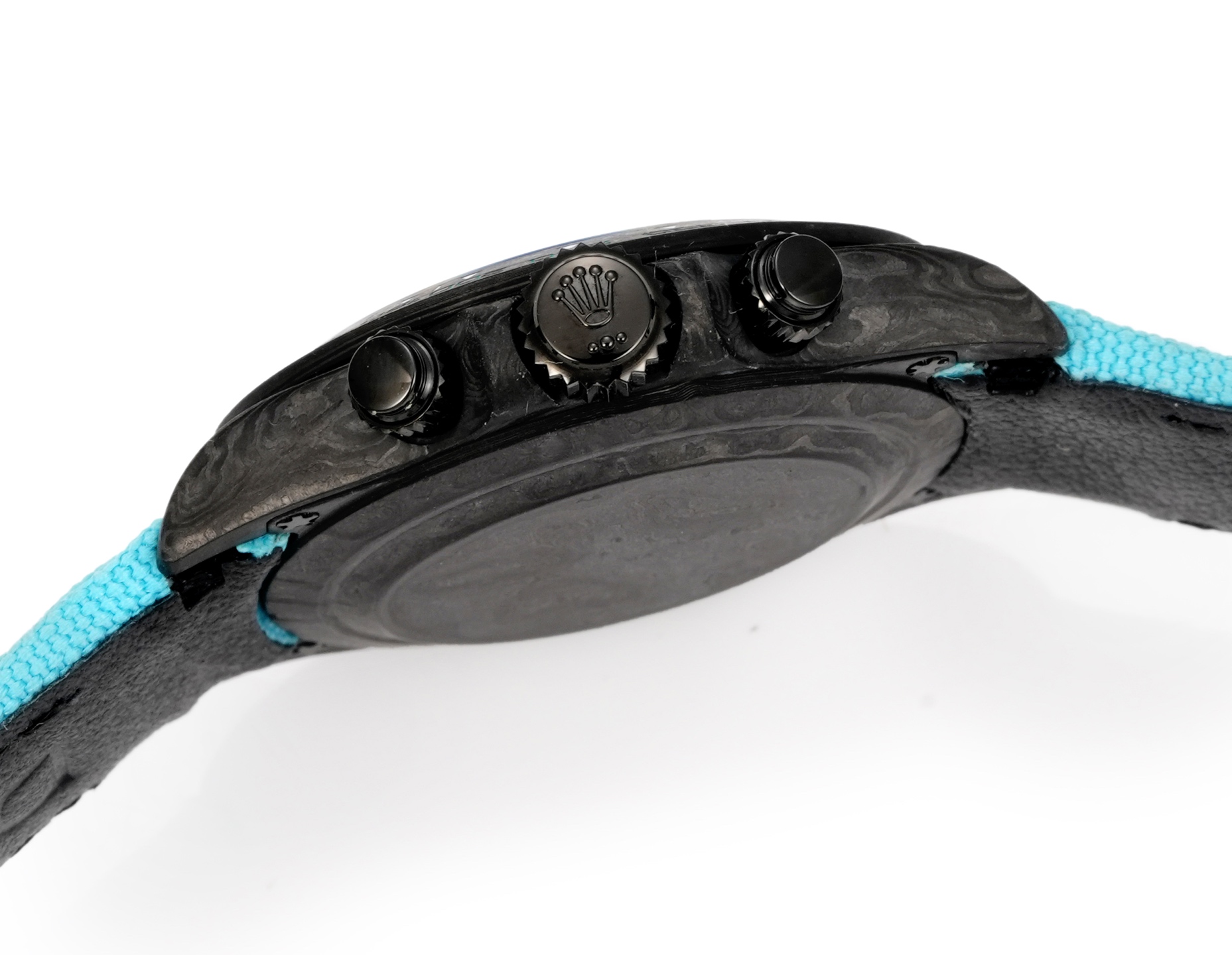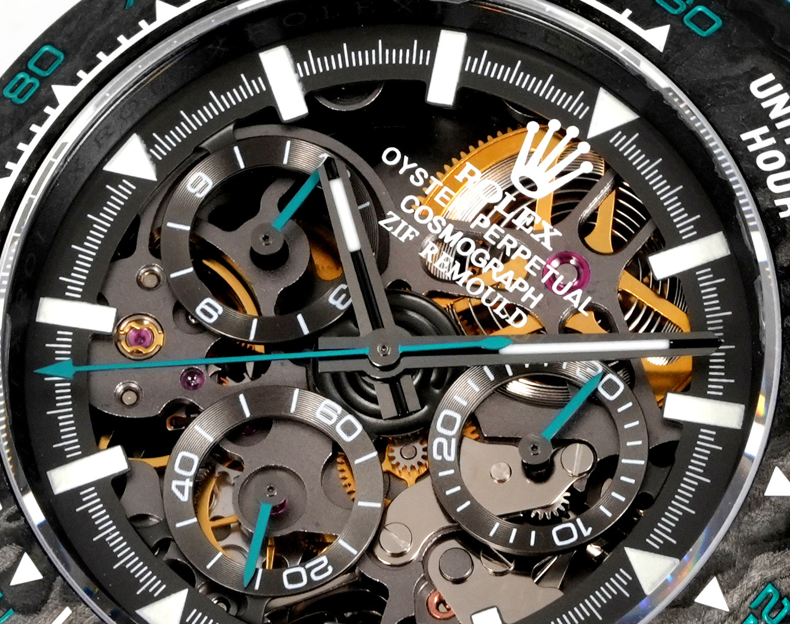 At first glance, the TW Factory’s Rolex Daytona impresses with its dimensions—40mm in diameter and 12.4mm thick—mirroring the original proportions to maintain authenticity in replication. This exclusive model features a case, bezel, and case back crafted entirely from high composite carbon fiber, setting a benchmark for strength and resilience in the replica market. The application of luminous powder ensures visibility even in dim lighting, amplifying practicality. Attention to detail is evident in the manually chamfered and polished finishes that exude a tactile excellence rarely matched in replica watches.