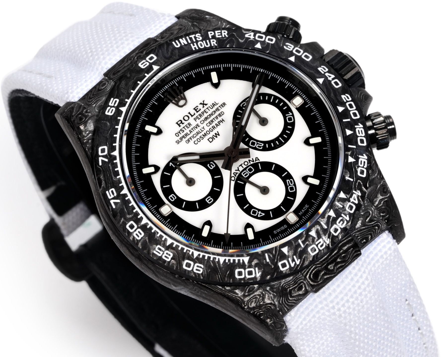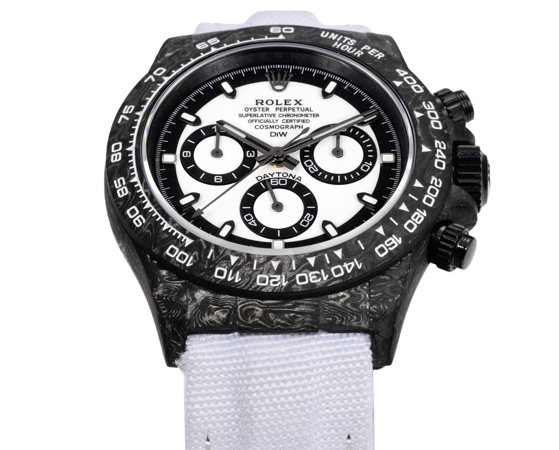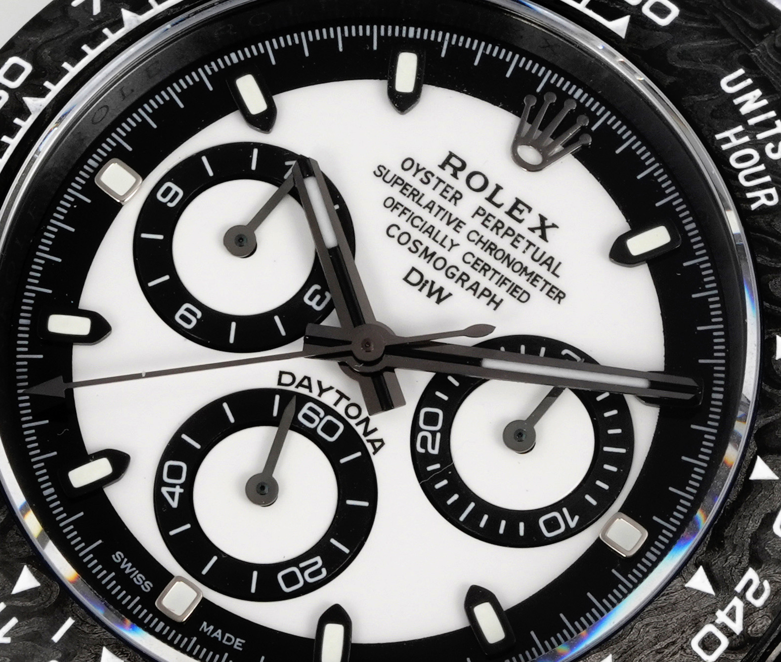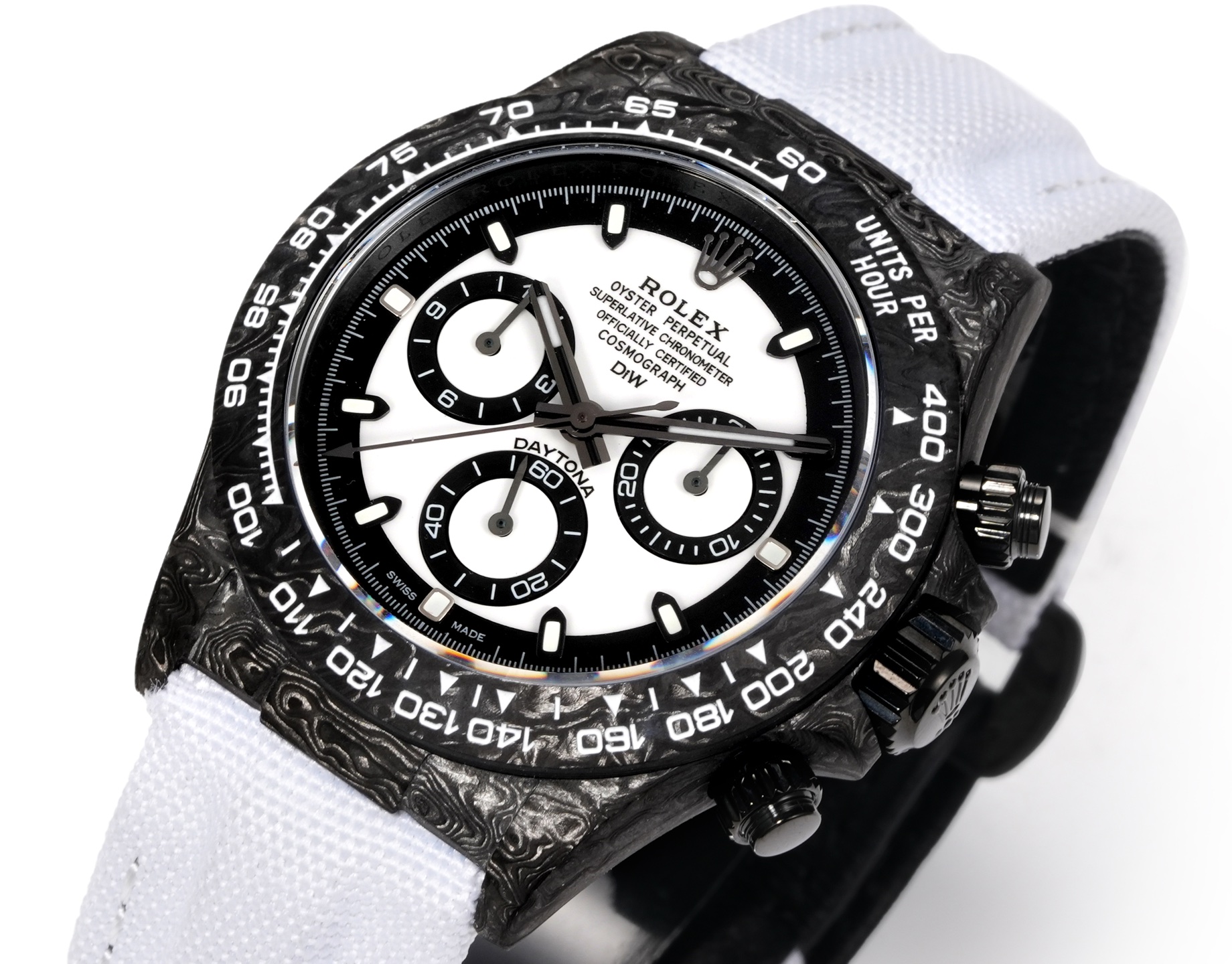 The carbon fiber Daytona from TW Factory stands out primarily due to its unique material composition. Each watch boasts a bespoke carbon fiber pattern, ensuring that no two pieces are identical. Carbon fiber’s appeal lies in its combination of lightweight comfort and robust strength, which is artfully realized in this 40×12.4mm case. TW Factory’s prowess is evident in their ability to craft an exclusive market presence, utilizing high-composite carbon fiber across the case, bezel, and caseback. This material choice is not merely aesthetic; it reflects a broader industry trend towards innovation in watch materials, aiming to enhance both functionality and visual intrigue.