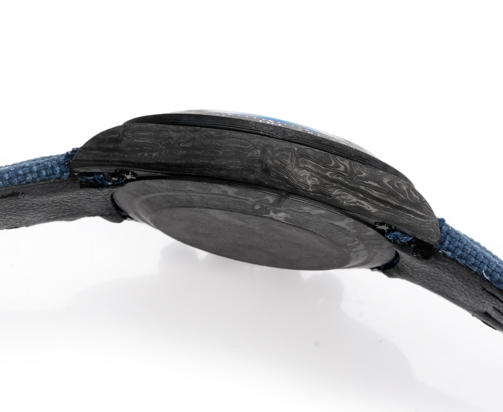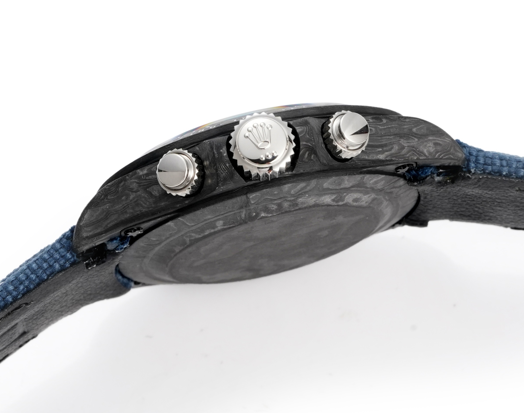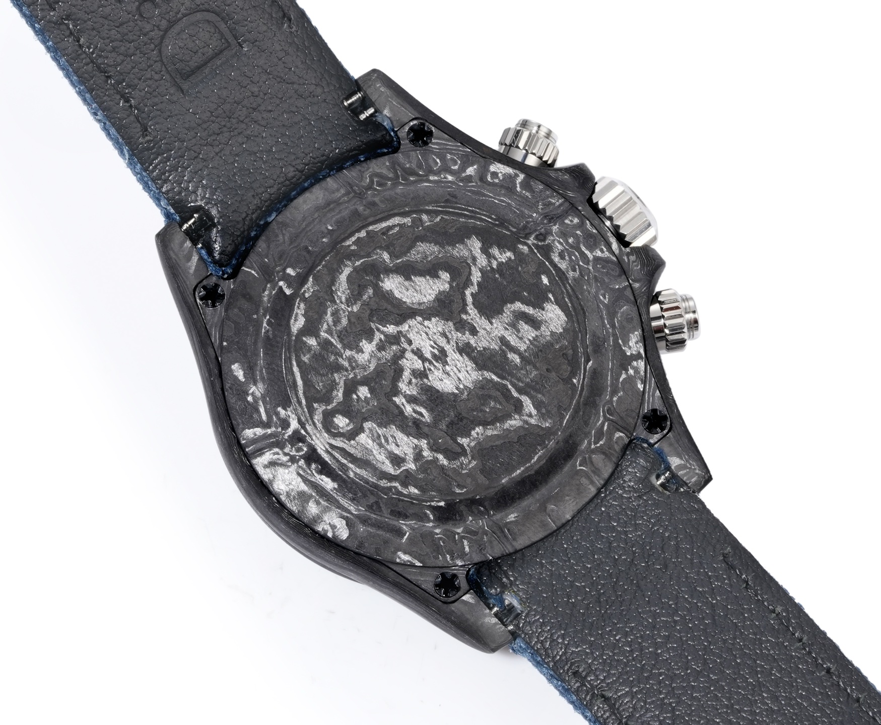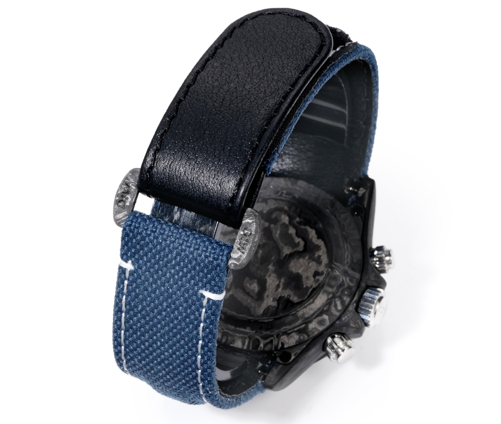 Beyond its stunning appearance, the watch excels in comfort, featuring a strap woven from artificial fibers. This choice ensures breathability and softness, addressing the need for wearability in diverse settings—from active environments to formal engagements. The strap’s design complements the carbon fiber case, reinforcing the watch’s identity as a synthesis of luxury and practicality.