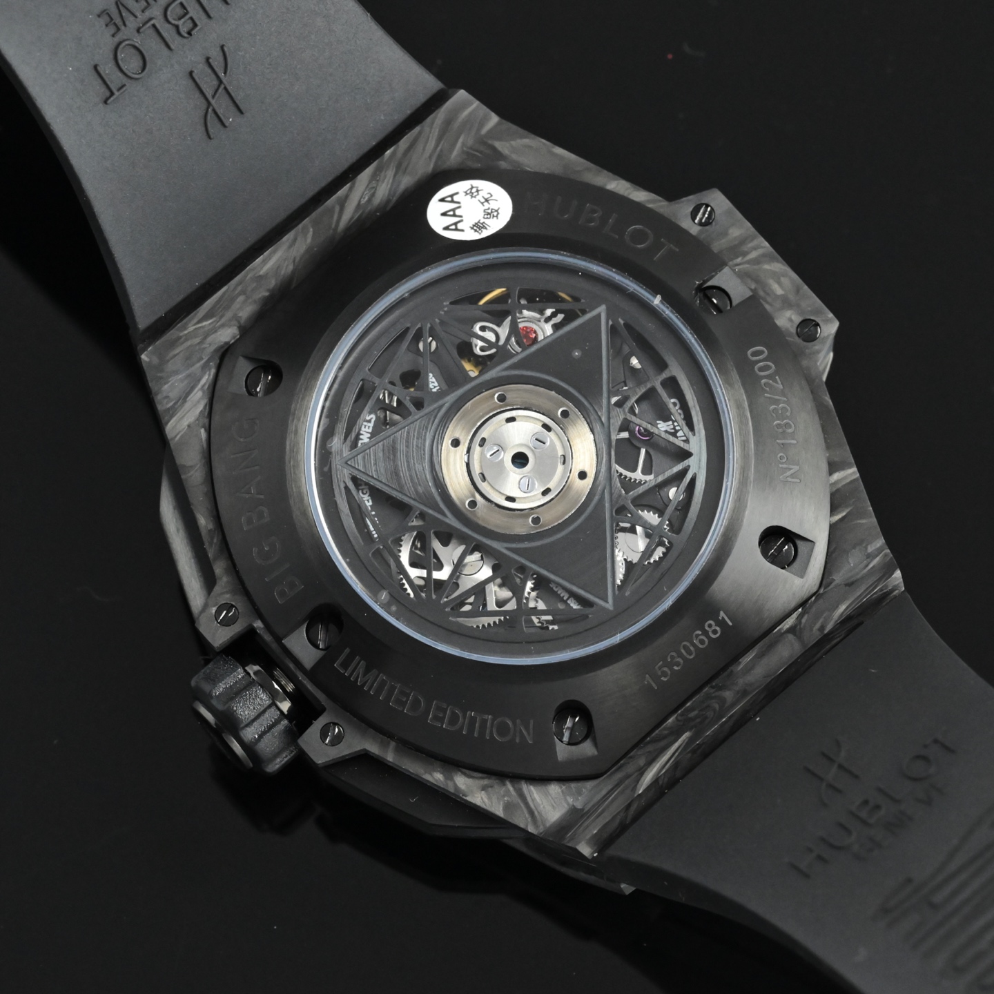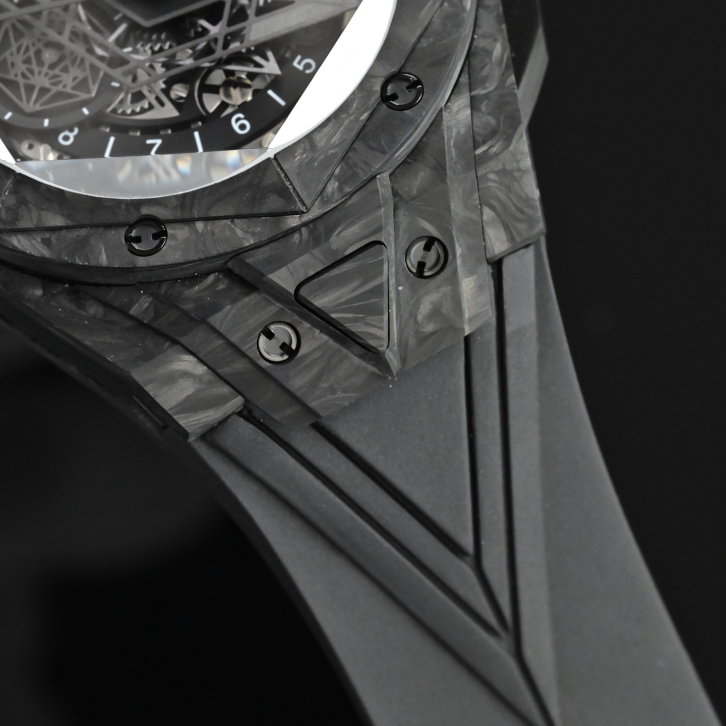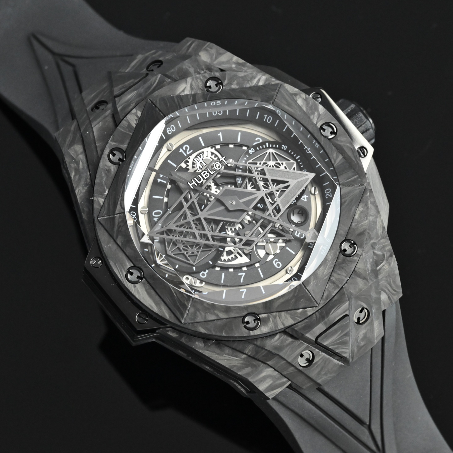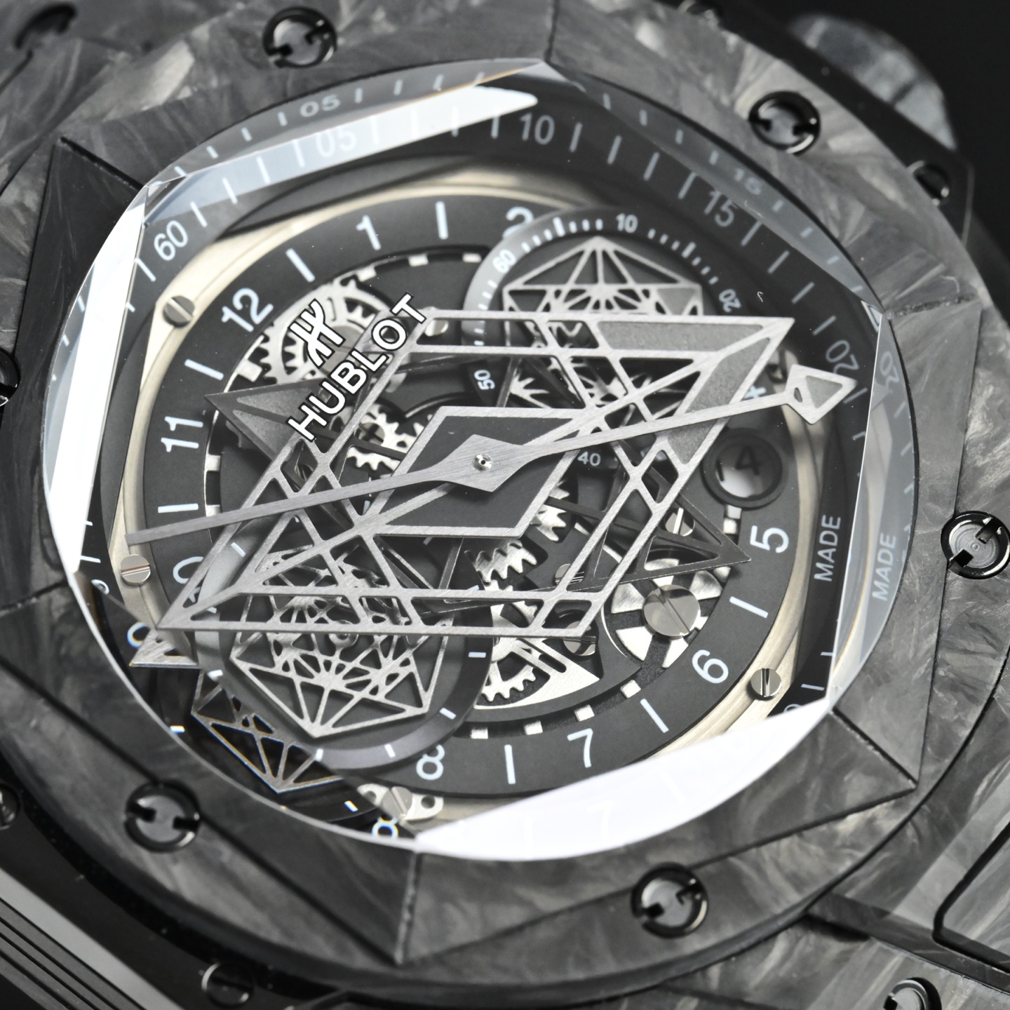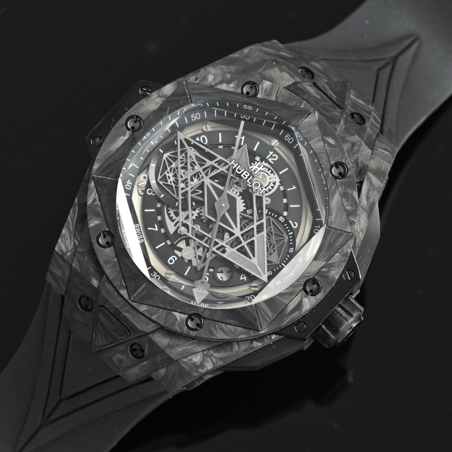 The Big Bang Sang Bleu II continues Hublot’s innovation journey by integrating geometric patterns such as hexagons and diamonds, which have become signature elements of the Sang Bleu collection. The black carbon fiber case—measuring 45mm in diameter—provides a unique matte texture that elegantly contrasts with the intricate geometric designs carved into its hexagonal bezel.