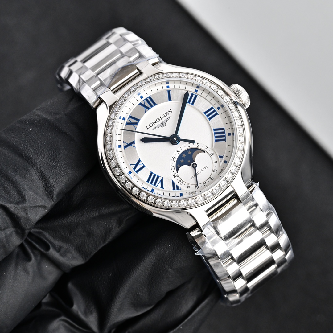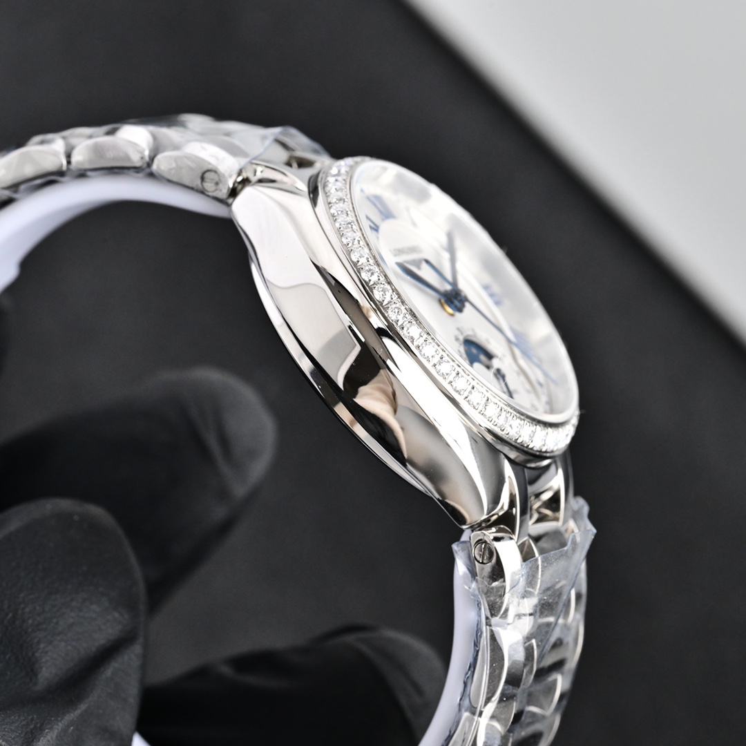 At the heart of the Conquest Moonphase is a dial that embodies the universe’s grandeur, encircled by exquisite diamonds reminiscent of stars glistening in the night sky. The choice of a white and silver combination for the dial creates a multifaceted luminance, akin to the serene glow of moonlight, which fuses subtlety with opulence. Its 34mm case size strikes the perfect balance between elegance and visibility, ensuring it stands out during daily engagements and intimate soirées alike.