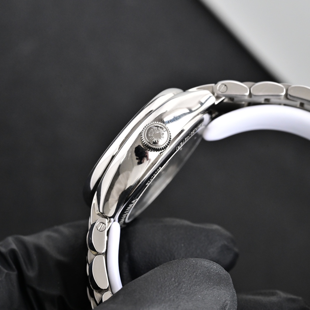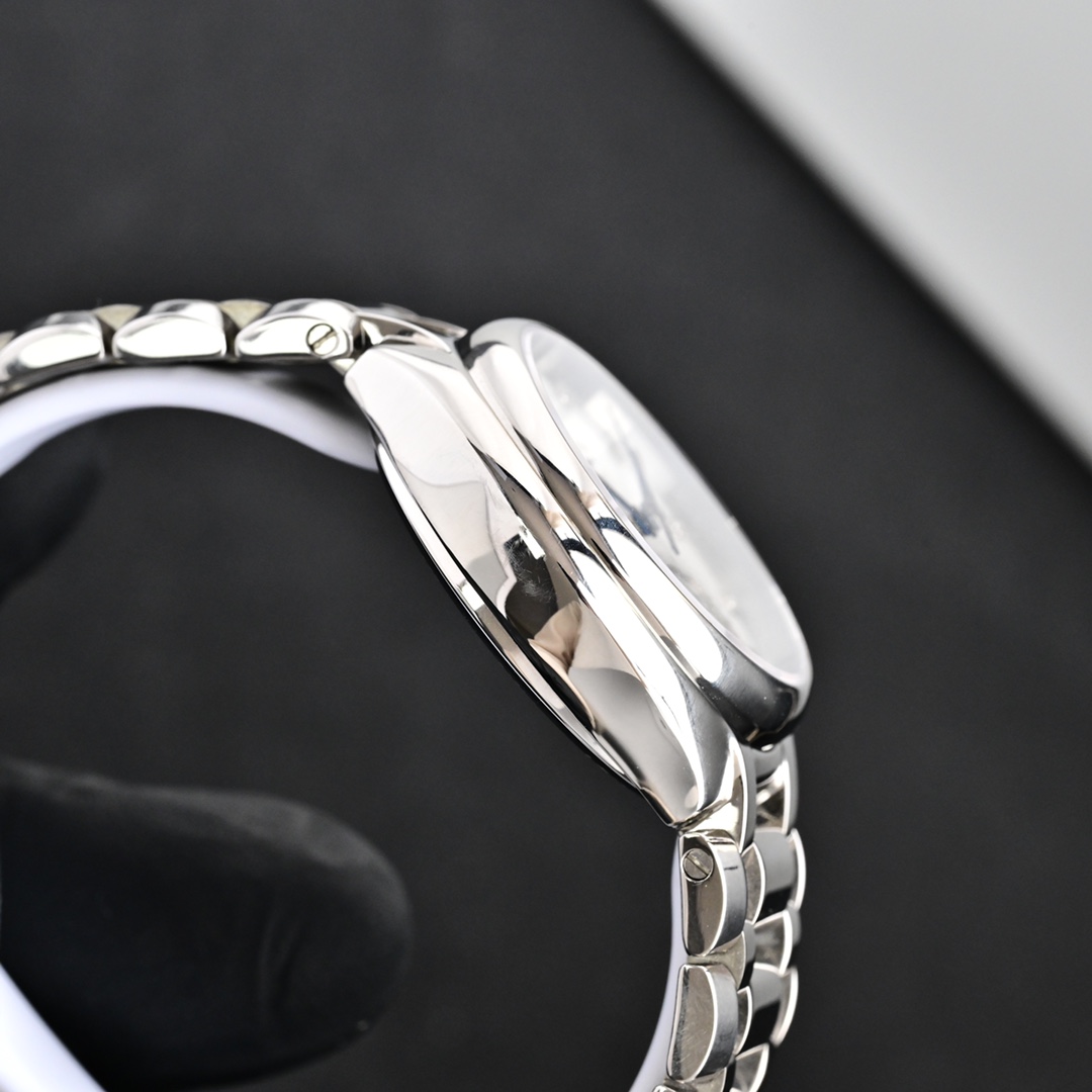 The dial’s white and silver color scheme evokes the gentle glow of moonlight, creating an aura of calm and understated luxury. At 34mm in diameter, the watch strikes a balance between discretion and presence, ensuring it remains a standout piece whether worn for a casual meet-up or a formal affair.