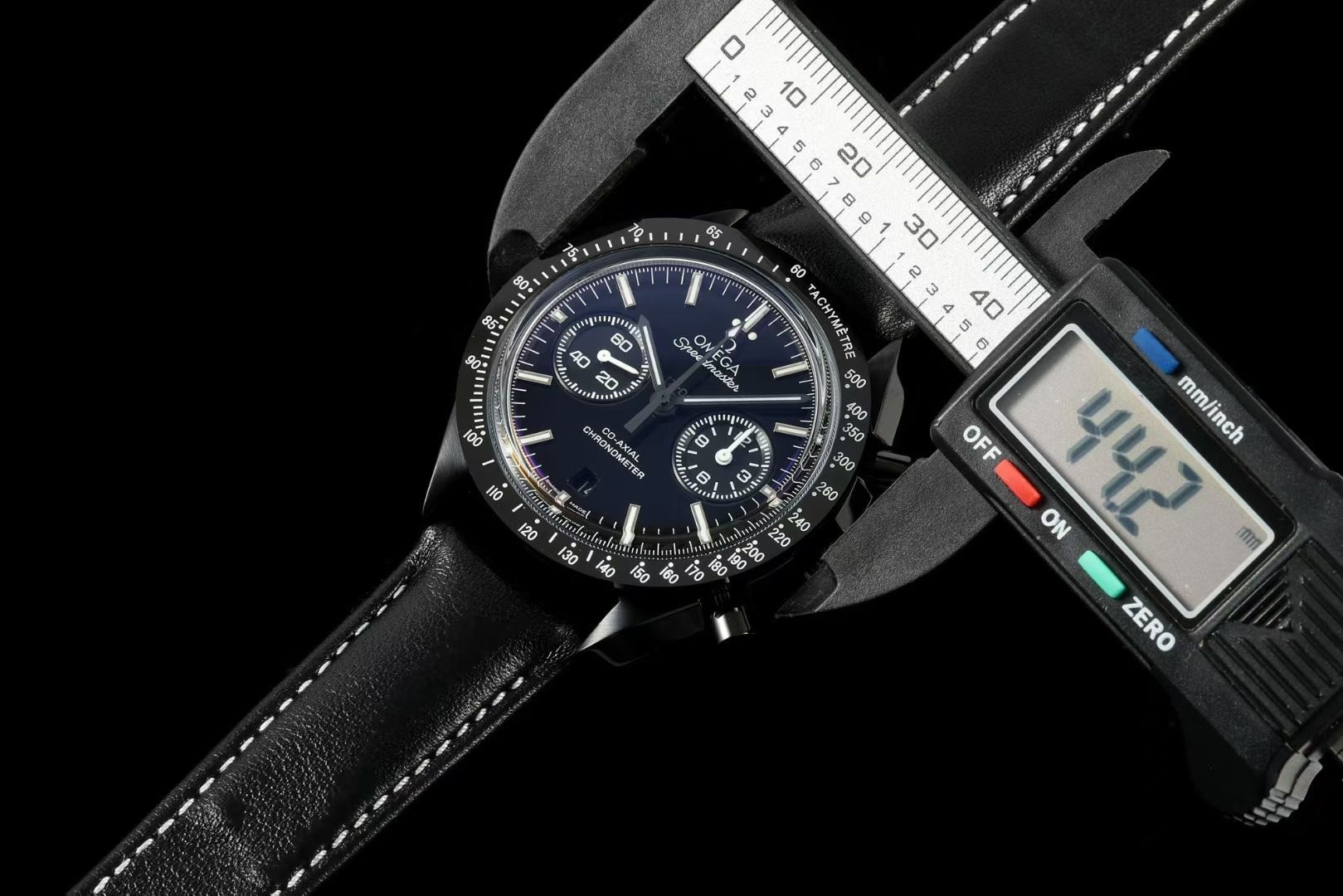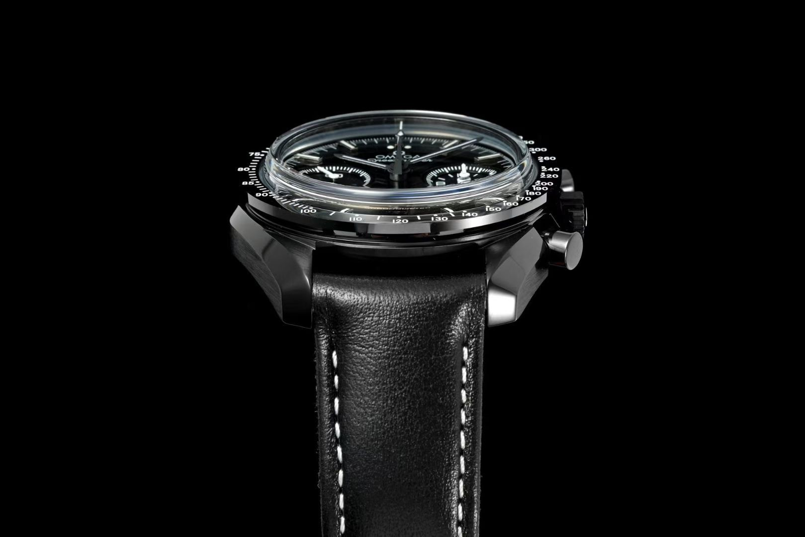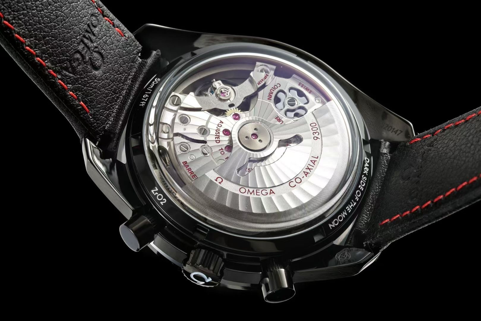 At a substantial 44.25mm, the “Dark Side of the Moon” is a bold statement piece. Its dimensions are complemented by a case crafted entirely from black ceramic, a material choice that speaks volumes about durability and modernism. This material is not merely a design choice but a technical one—the robustness of ceramic is well-documented, offering resistance to scratches and a sleek, matte finish that underscores its futuristic ethos.