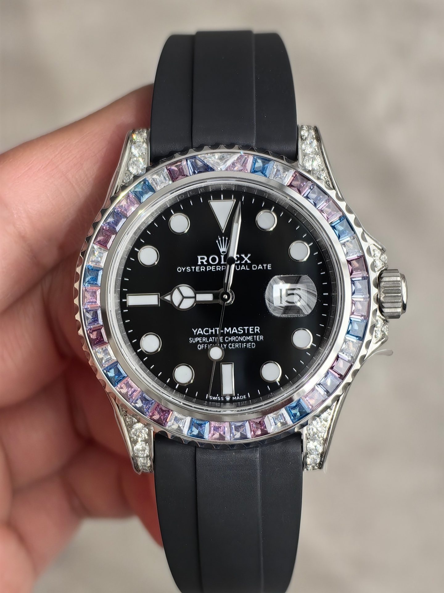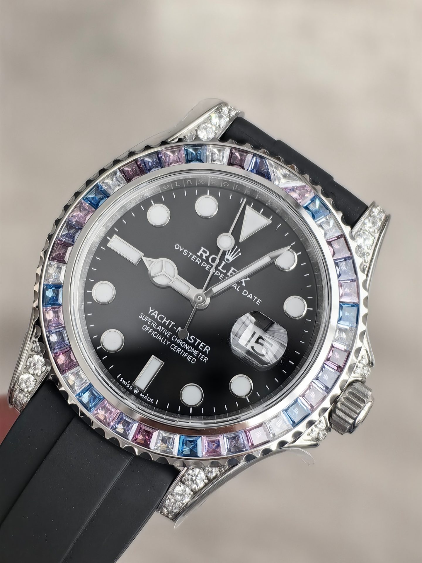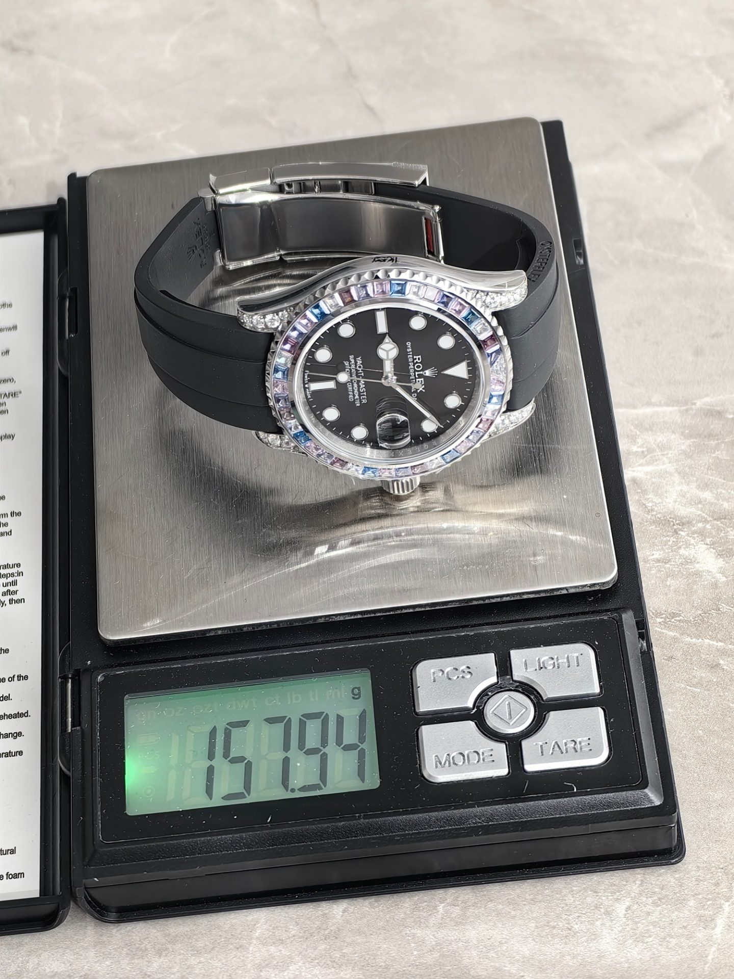 FH Factory’s meticulous approach is evident in its use of 904L stainless steel casing, ensuring a non-tarnishing and non-peeling finish — a significant feat in replica craftsmanship. The watch’s weight at 158 grams mirrors the original Yacht-Master, achieved without resorting to bulky case backs or tungsten steel casings that often compromise the feel and authenticity of replica watches. This synchrony in weight and appearance reinforces a seamless look and functionality that parallels genuine luxury timepieces.