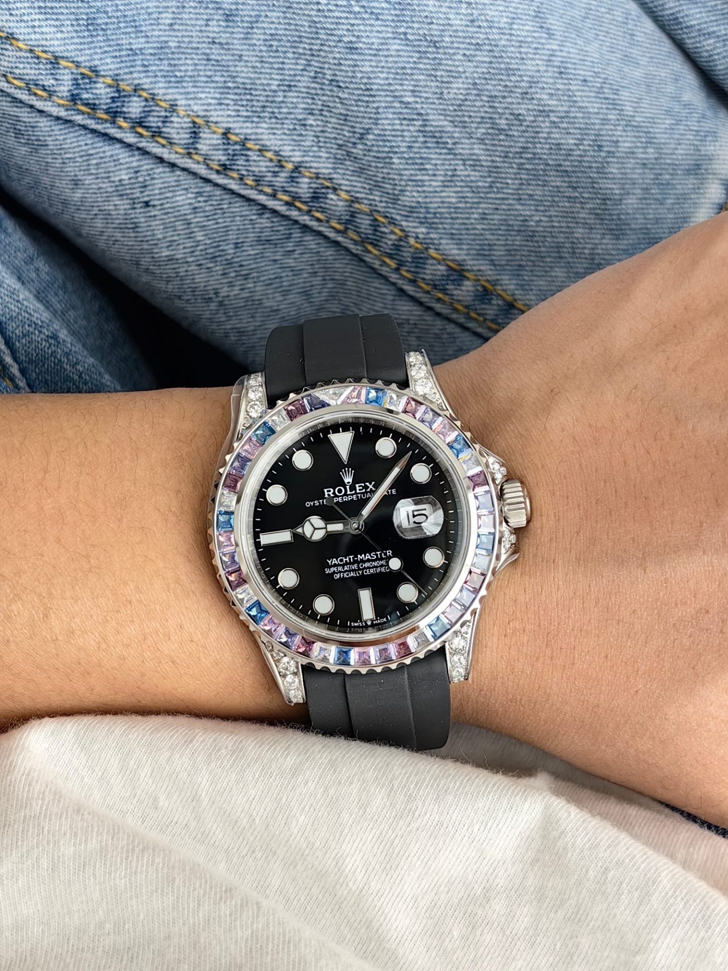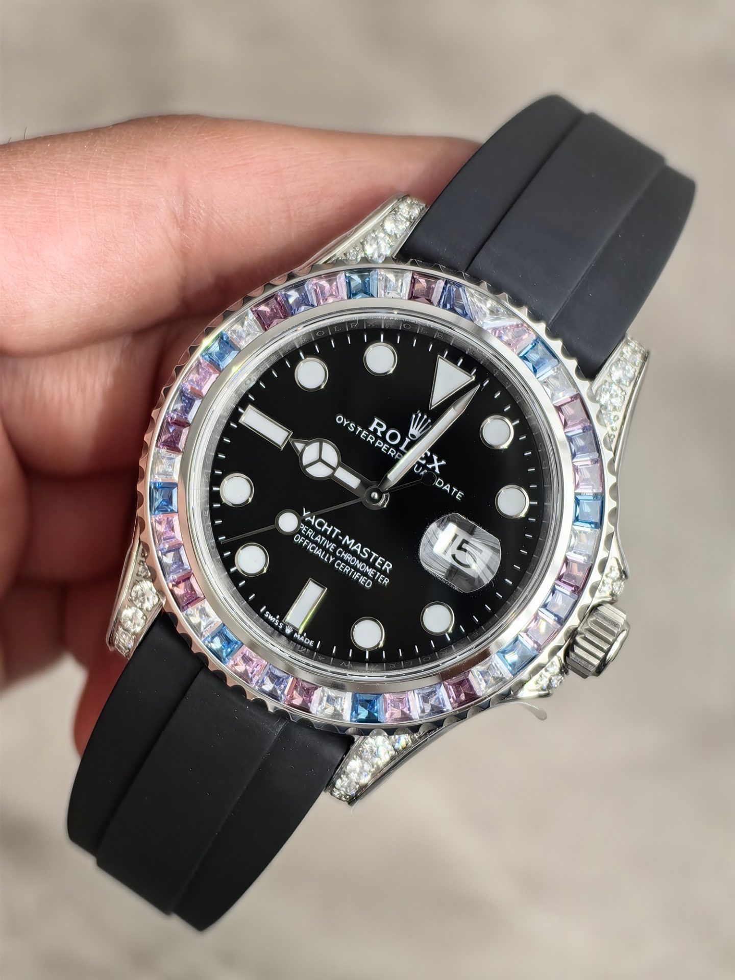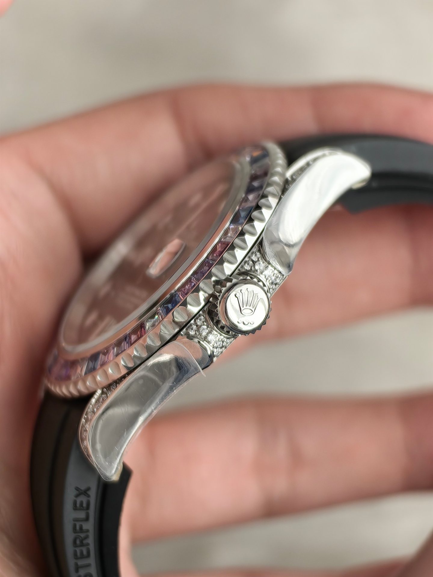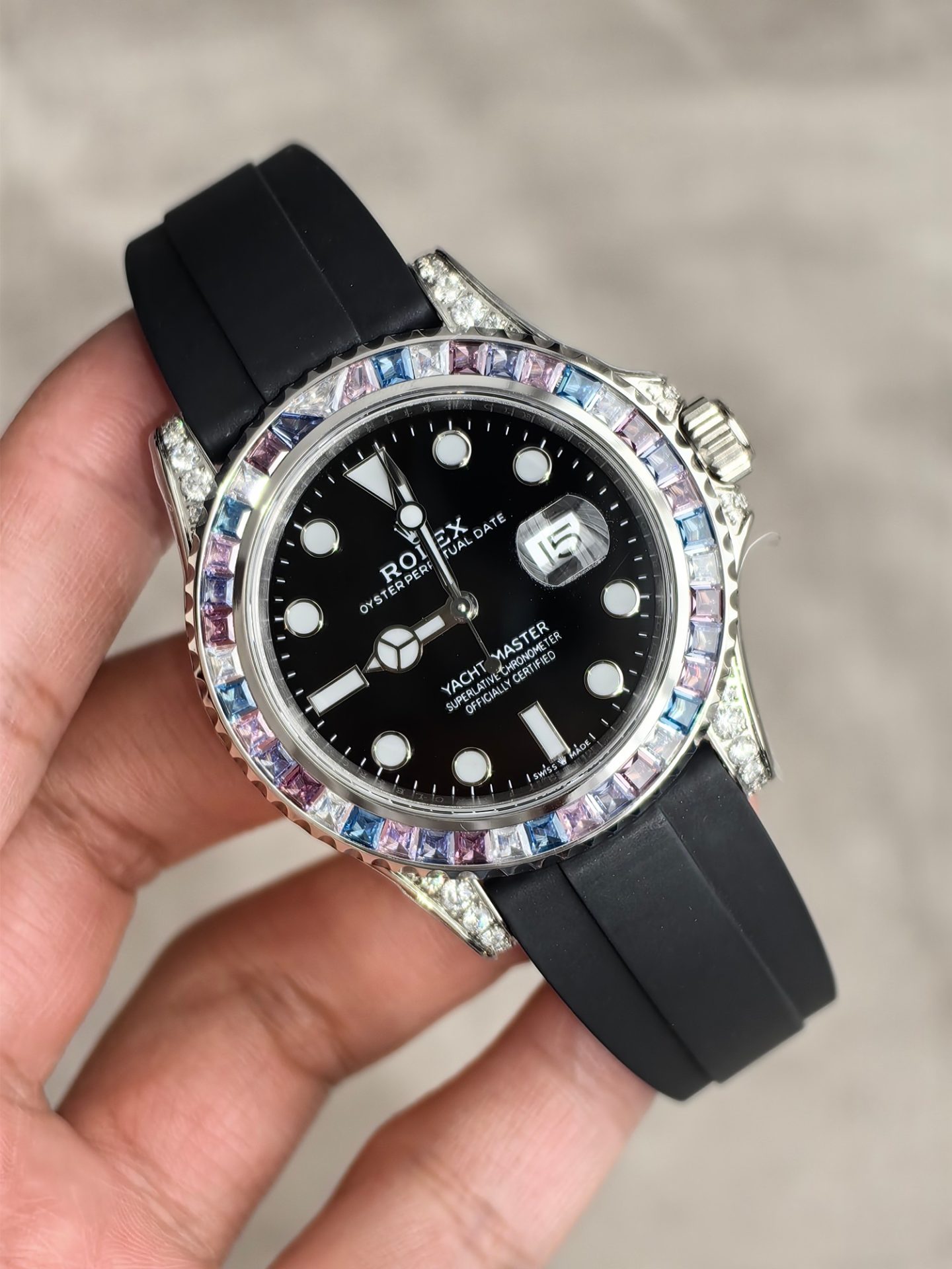 FH Factory’s meticulous approach is evident in its use of 904L stainless steel casing, ensuring a non-tarnishing and non-peeling finish — a significant feat in replica craftsmanship. The watch’s weight at 158 grams mirrors the original Yacht-Master, achieved without resorting to bulky case backs or tungsten steel casings that often compromise the feel and authenticity of replica watches. This synchrony in weight and appearance reinforces a seamless look and functionality that parallels genuine luxury timepieces.