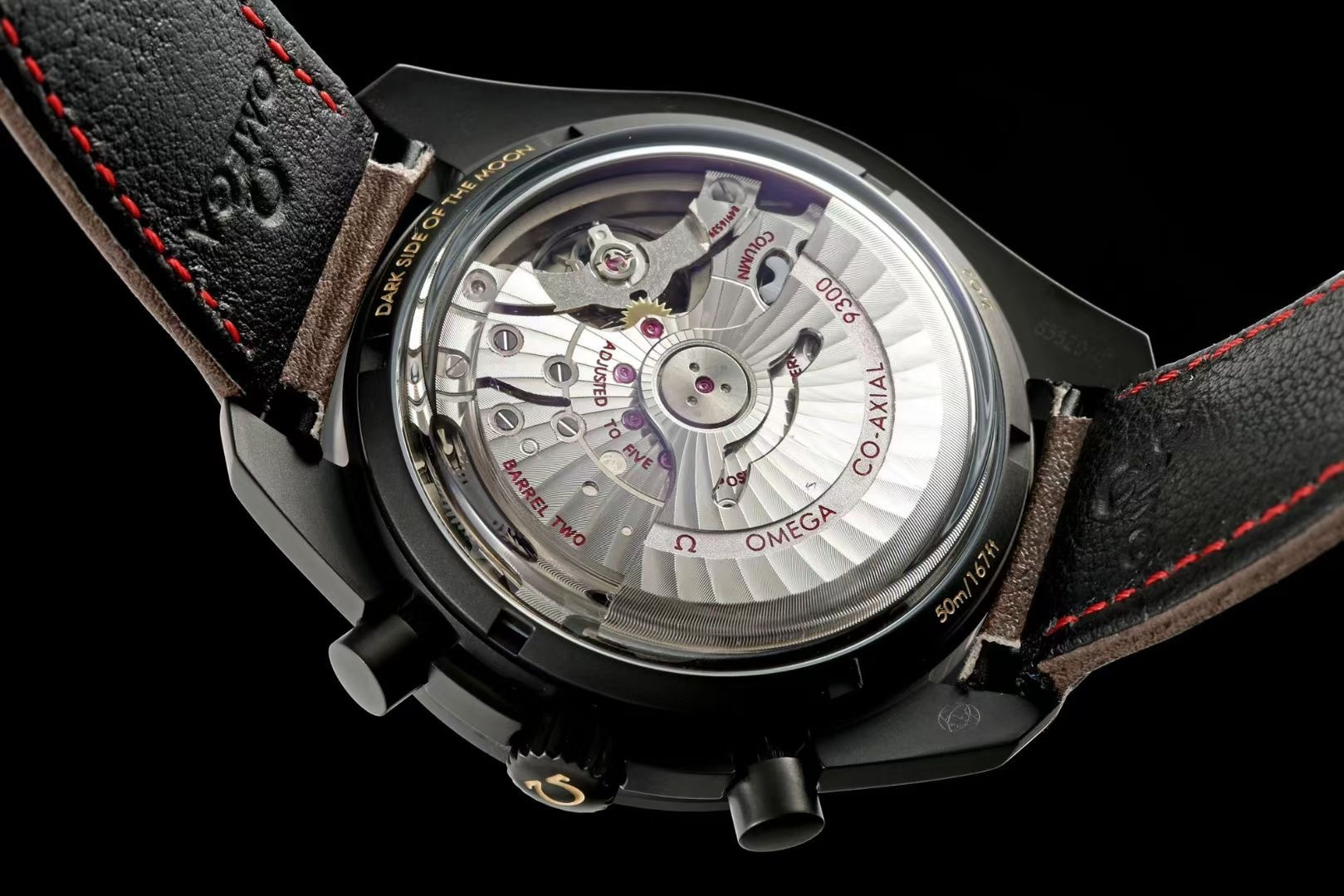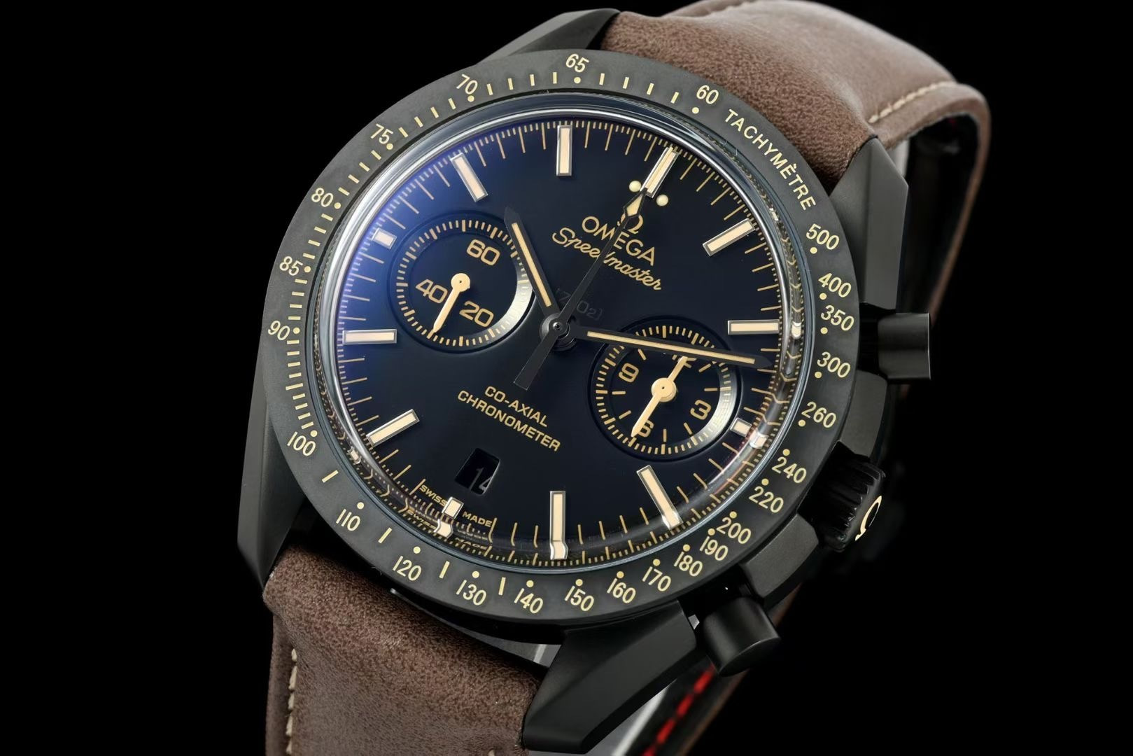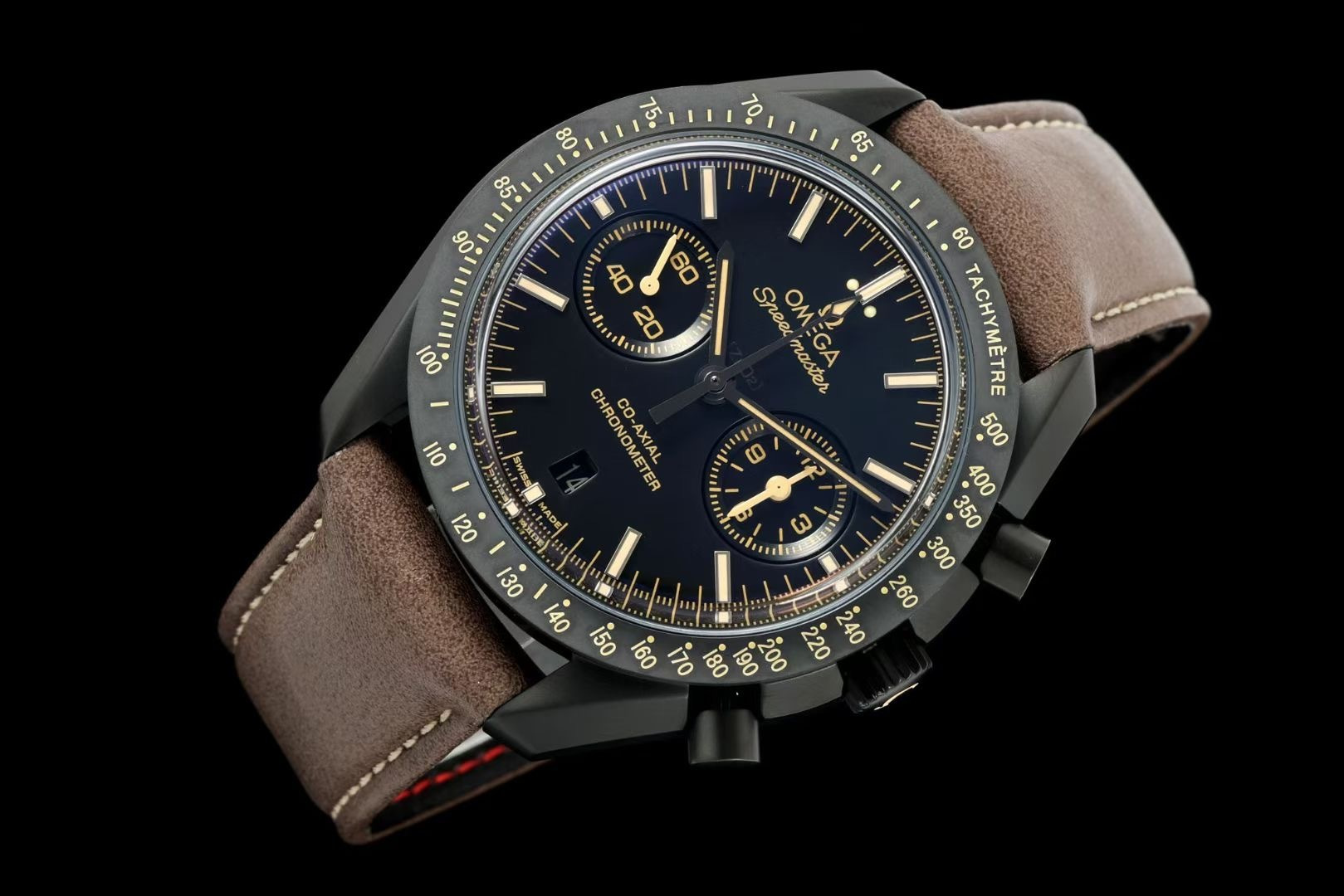 The watch design is a profound celebration of modern materials and craftsmanship. The predominant use of black ceramic not only reinforces the thematic ‘Dark Side’ but also provides exceptional durability and scratch resistance. This ceramic is further enhanced by an intense luminescent bezel, ensuring legibility in low-light conditions—a critical feature inherited from its lunar expedition legacy. The polished ceramic dial proudly hosts blackened sub-dials paired harmoniously with white gold hour markers, offering a sophisticated contrast.