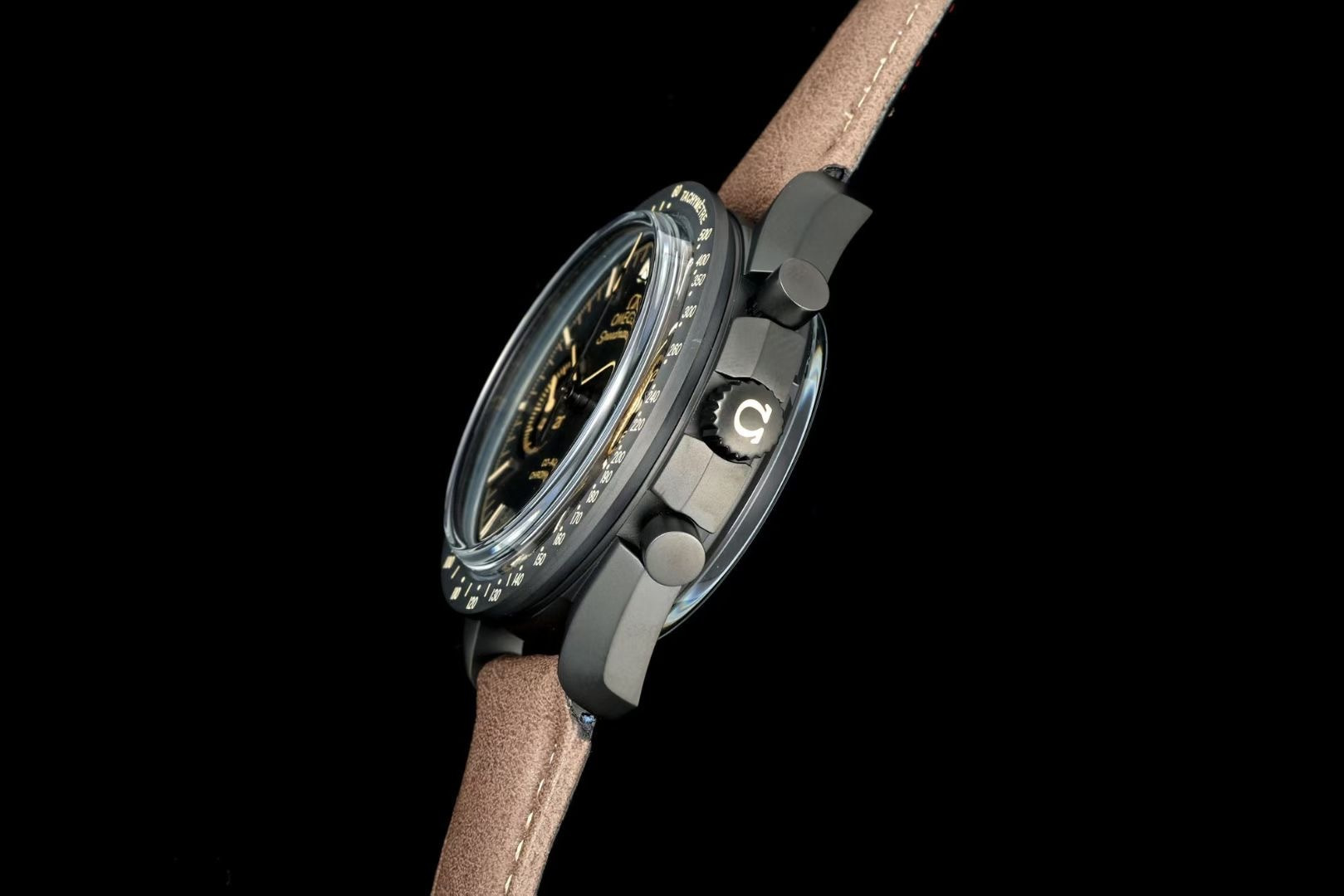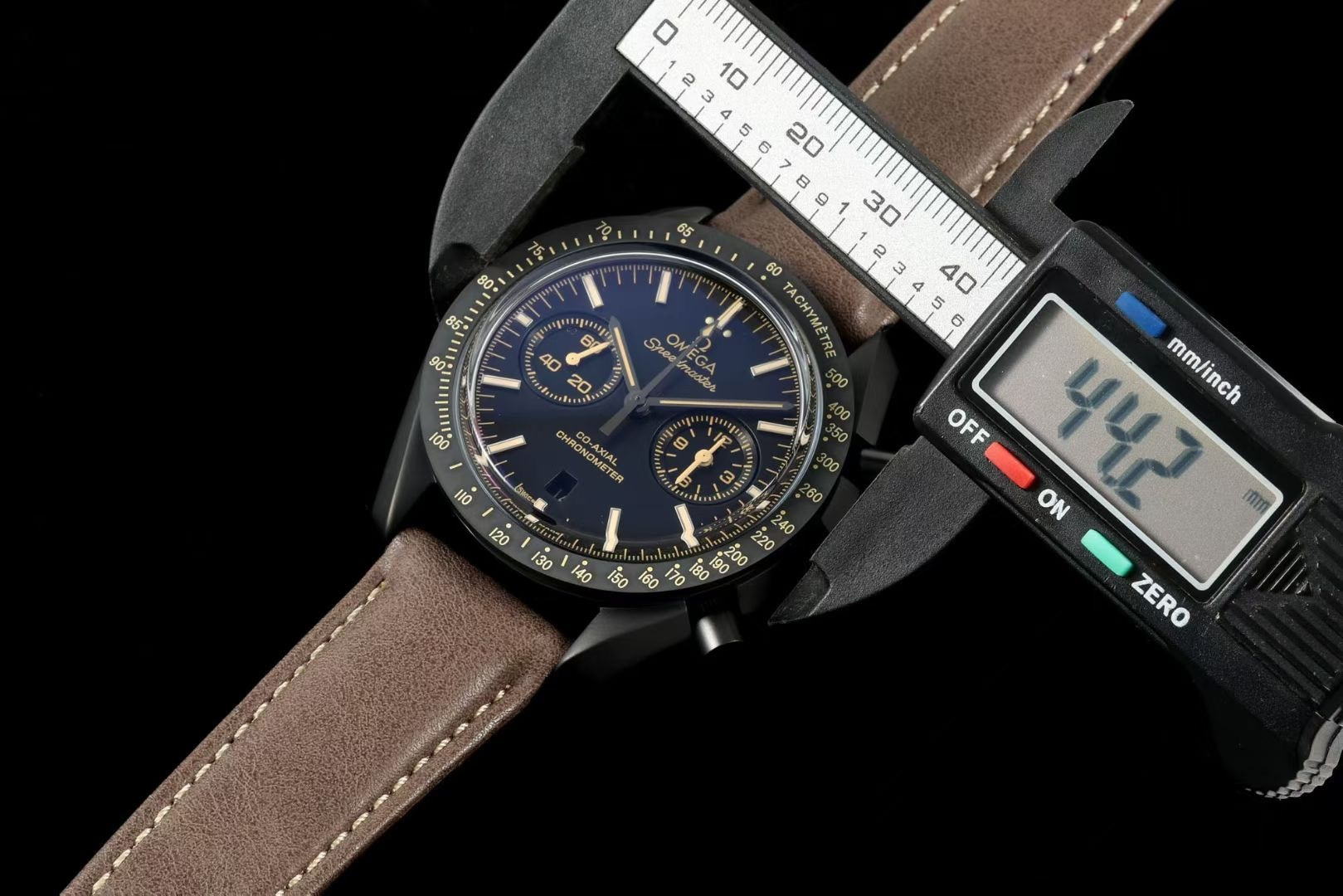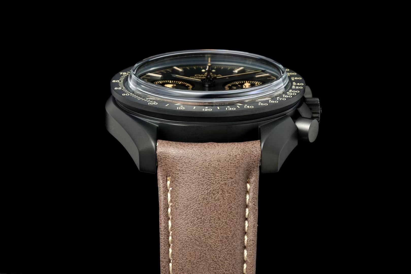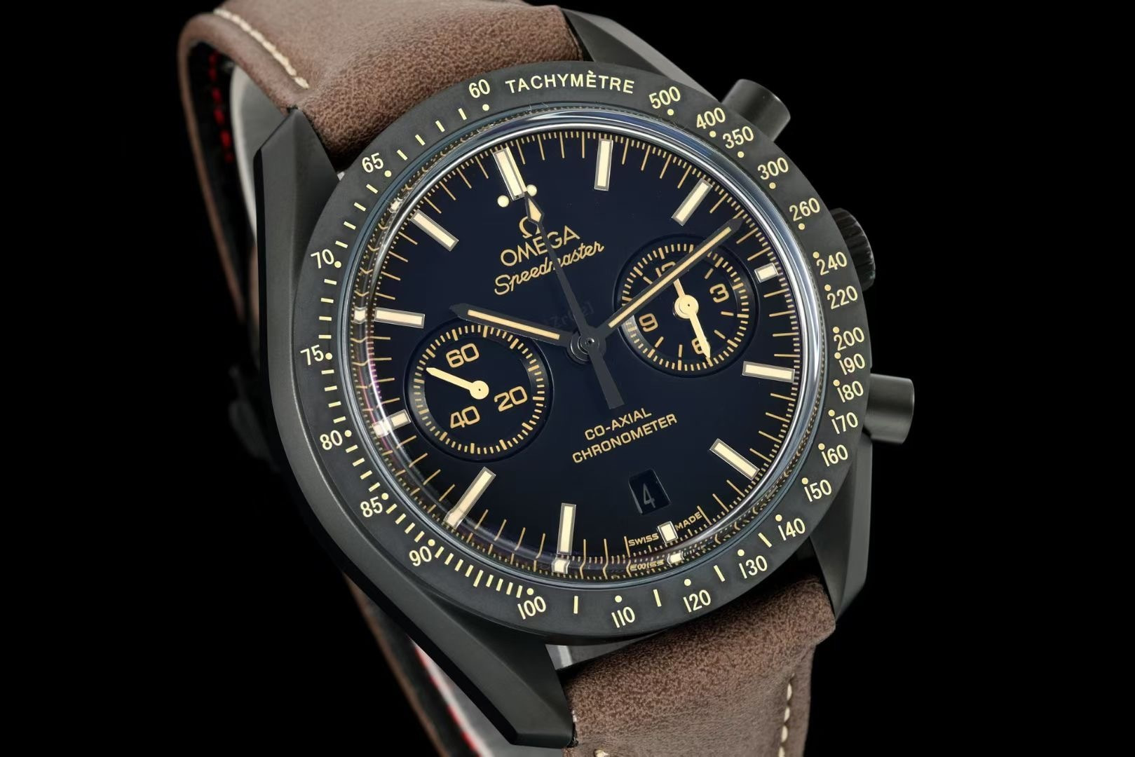 The watch design is a profound celebration of modern materials and craftsmanship. The predominant use of black ceramic not only reinforces the thematic ‘Dark Side’ but also provides exceptional durability and scratch resistance. This ceramic is further enhanced by an intense luminescent bezel, ensuring legibility in low-light conditions—a critical feature inherited from its lunar expedition legacy. The polished ceramic dial proudly hosts blackened sub-dials paired harmoniously with white gold hour markers, offering a sophisticated contrast.