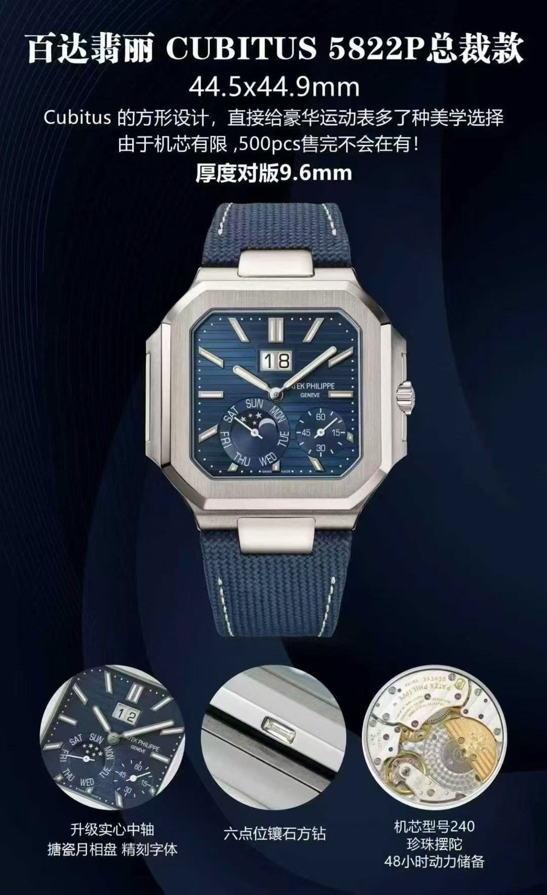 At the heart of the CUBITUS 5822P lies the Caliber 240 movement. It is a marvel of engineering, comprising 353 parts and 52 jewels, operating at a frequency of 21,600 vibrations per hour. The movement offers a 48-hour power reserve, supported by a micro-rotor and an upgraded solid central wheel. The intricacy extends to the enameled moon phase disc, featuring finely engraved lettering—a nod to traditional craftsmanship that resonates with watch connoisseurs.