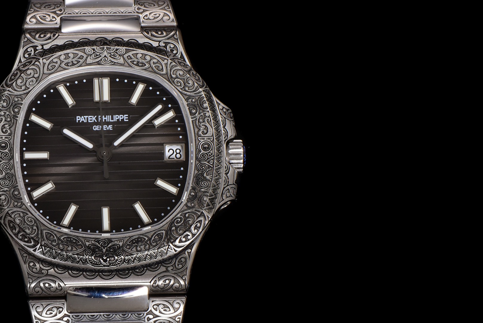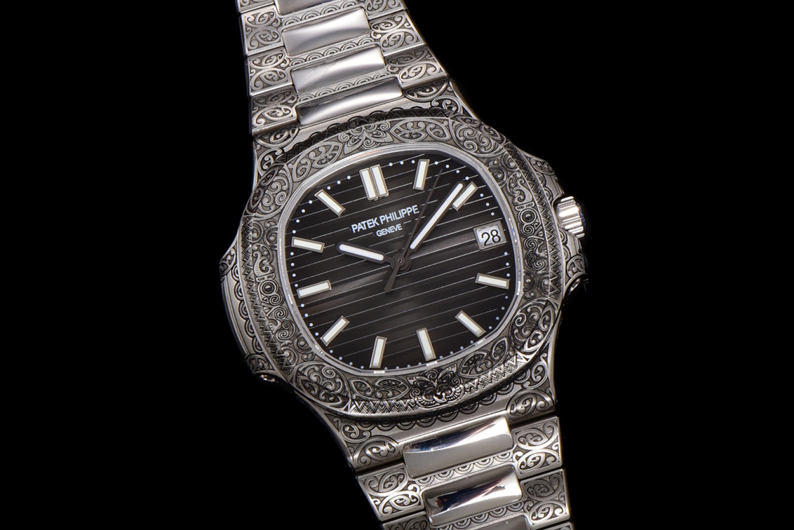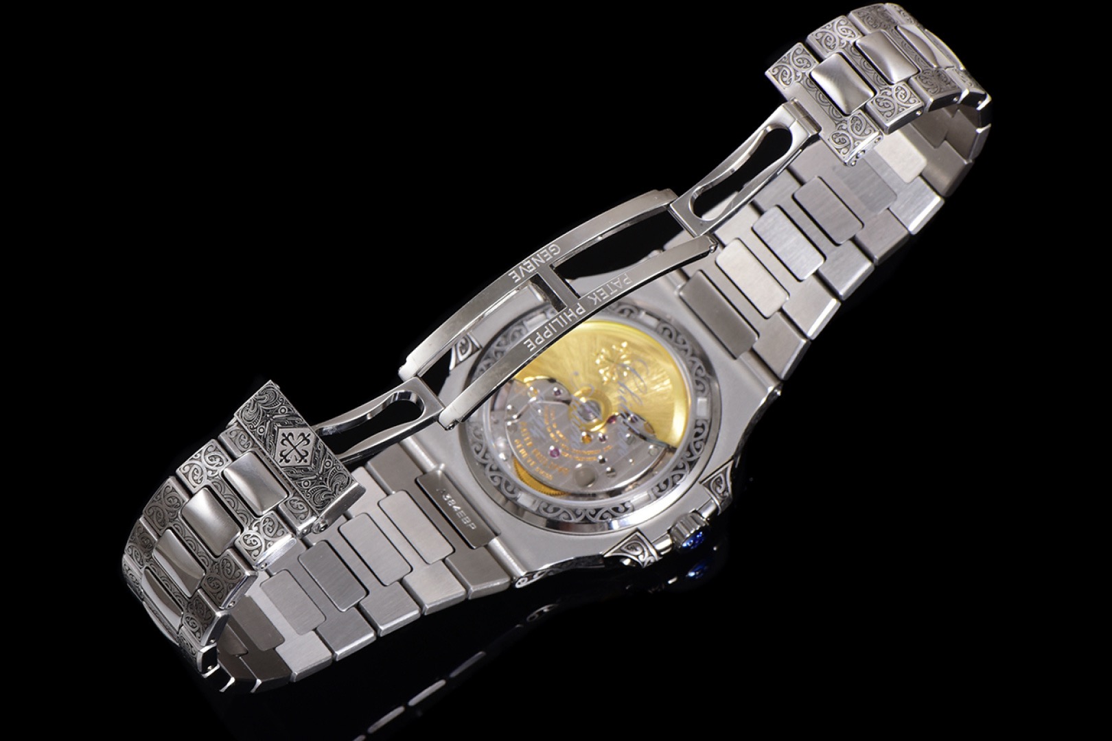 The 40mm stainless steel case maintains a slim profile at just 8.3mm thick, preserving the iconic 12-sided bezel outline that defines the Nautilus aesthetic. The case, bezel, lugs, and bracelet are each meticulously engraved, offering a tactile depth rarely seen in the watchmaking world. The deep grey dial complements these engravings, presenting a classical yet striking appearance. Standard three-hand layout with a small date window at three o’clock provides utility without compromising on elegance. Luminous material enhances the grey-finished hour hands and markers, ensuring both legibility and a sense of three-dimensionality.