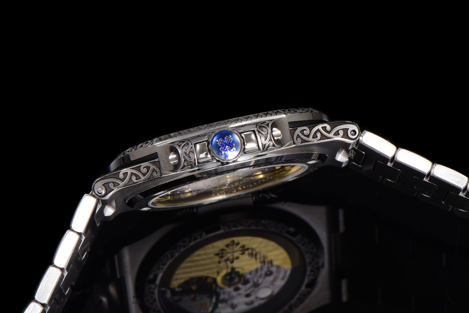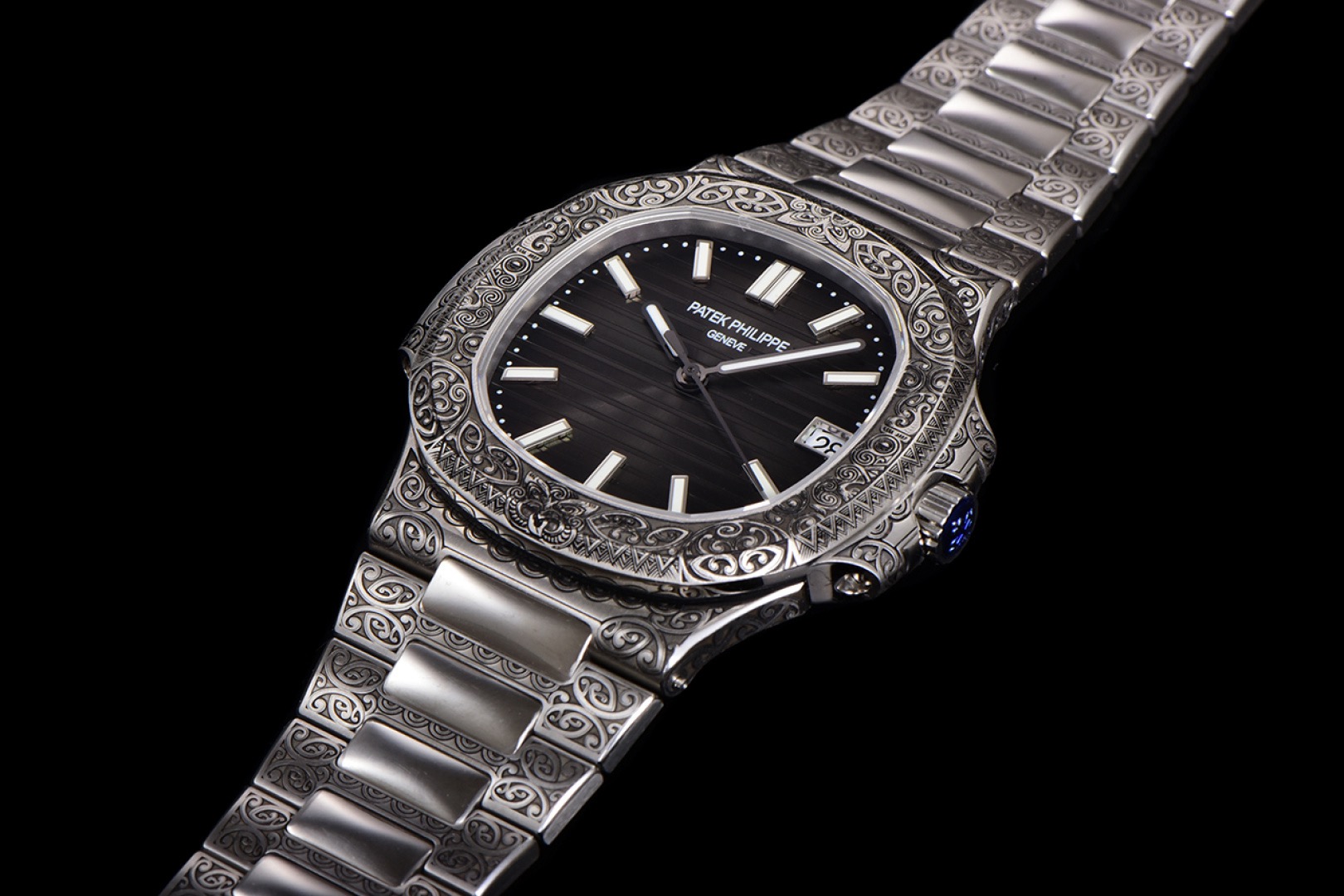 The Nautilus Ref. 5711/1500A retains the iconic design elements that have defined the Nautilus series, featuring a 40mm stainless steel case with a svelte thickness of just 8.3mm. Its hallmark twelve-sided bezel contour is flawlessly integrated with the case, while the entire watch—case, bezel, lugs, and bracelet—is meticulously hand-engraved. This intricate engraving not only enhances its visual allure but also imbues the watch with a sense of antiquity and modernity that captivates the observer.