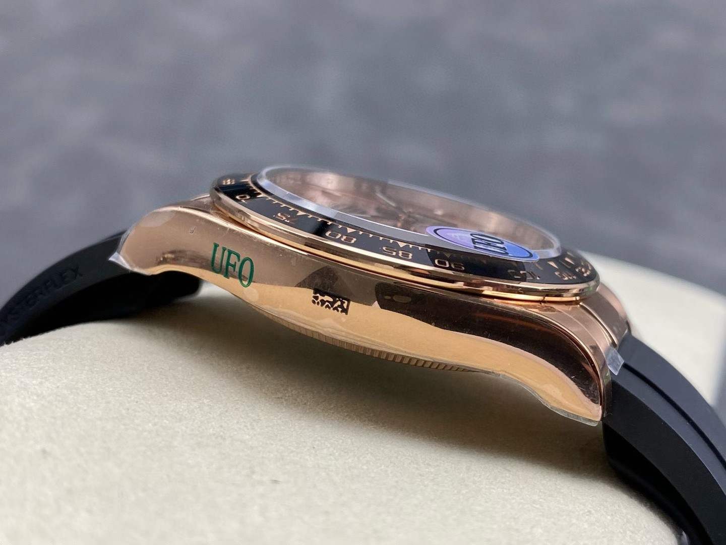 The UFO No Card 4131 lacks the famous hallmark of authorized Rolex pieces, yet it sets a ‘new bar’ in material quality for replicas. With a weight of 157 grams, the piece mirrors the feel of authentic models, showcasing an impressive degree of craftsmanship. The strap, often a giveaway in replica models, has been meticulously designed to match the visual and tactile qualities of genuine Daytona rubber straps. By achieving such feats, this watch blurs the lines between originality and reproduction, challenging the long-standing notion of replicas as ‘inferior goods.’