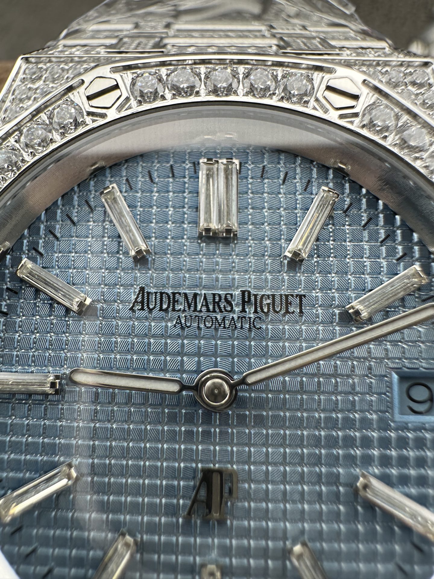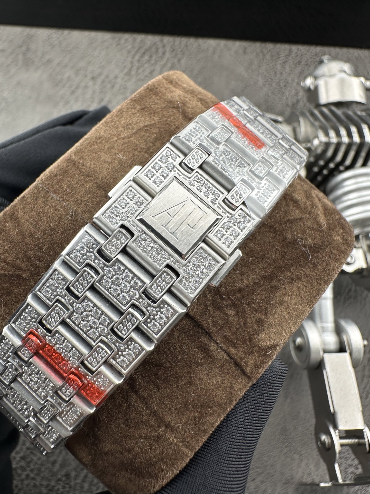 SPX Factory has employed a meticulous process of electroplating platinum followed by intricate diamond setting, ensuring the Royal Oak VIP Hidden Edition boasts an unparalleled metal texture—smooth and radiant yet robust in construction. This technique not only enhances the aesthetic appeal but achieves a perfect balance between weight and comfort, a testament to the advanced engineering that goes into such creations. Coupled with an anti-reflective sapphire crystal, the watch maintains optimal clarity and brilliance, allowing wearers to admire the detailed nuances of the dial without hindrance.