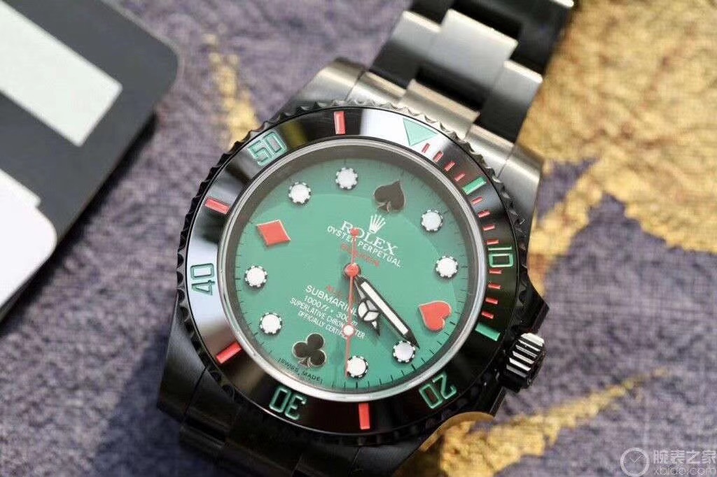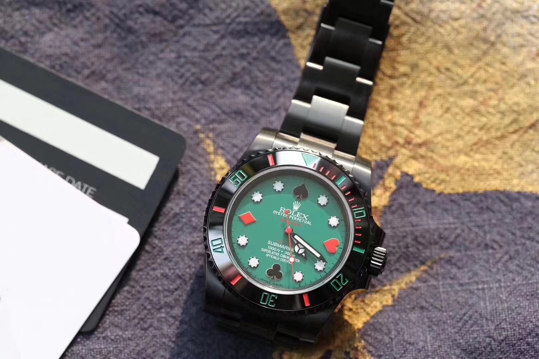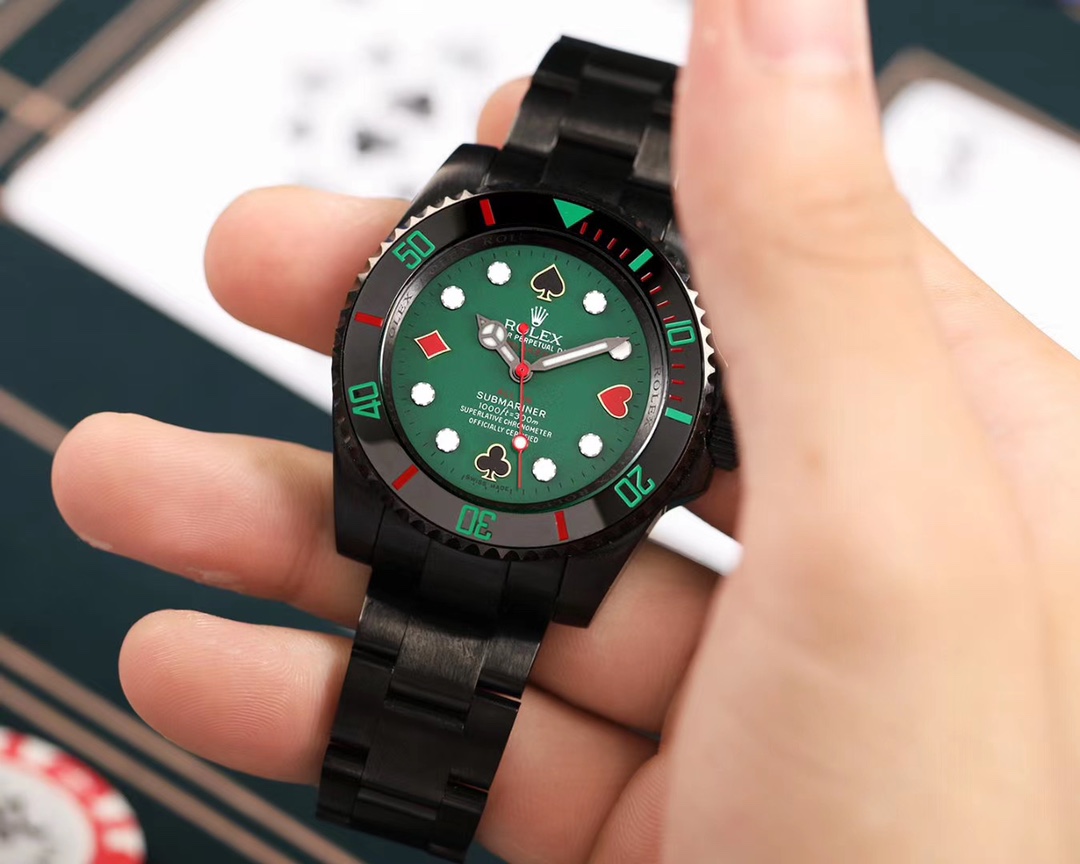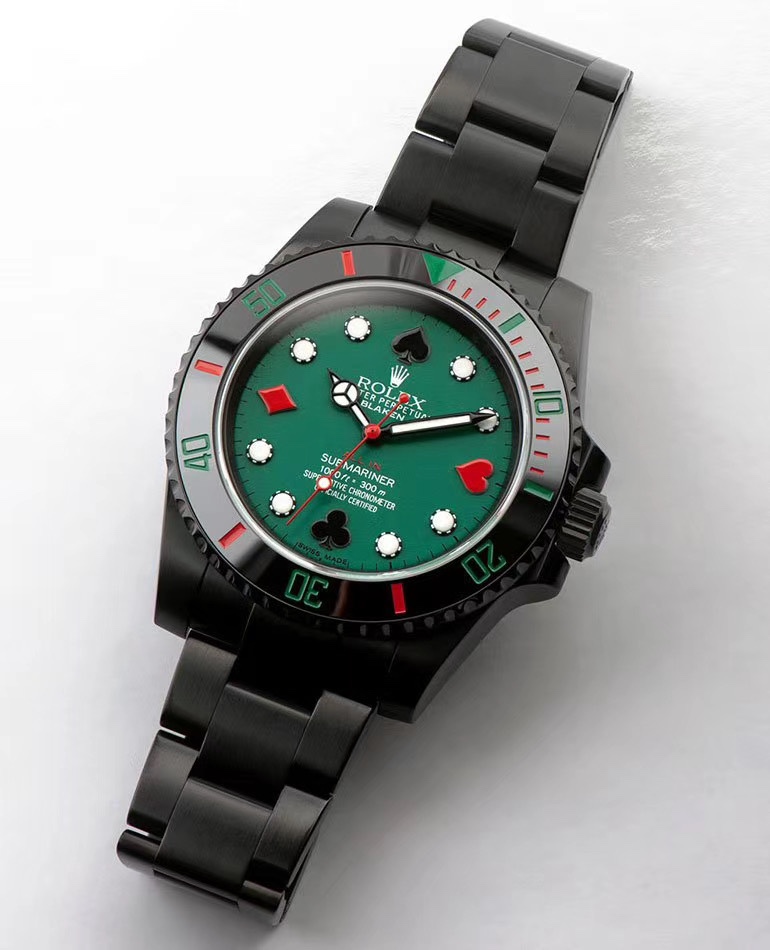 BLAKEN, renowned for its expertise in modifying classic Rolex models, presents an innovative fusion of the iconic ‘Hulk’ and ‘Black Submariner’ designs. This 40mm masterpiece incorporates poker-themed elements, marrying tradition with playful creativity. At its core is the reliable ETA2836 automatic mechanical movement, enveloped in a durable 904L stainless steel case enhanced with a deep DLC coating. Known for its scratch-resistant properties, DLC—or Diamond-Like Carbon—coating ensures that this timepiece withstands the rigors of daily wear while maintaining an elegant, polished appearance.