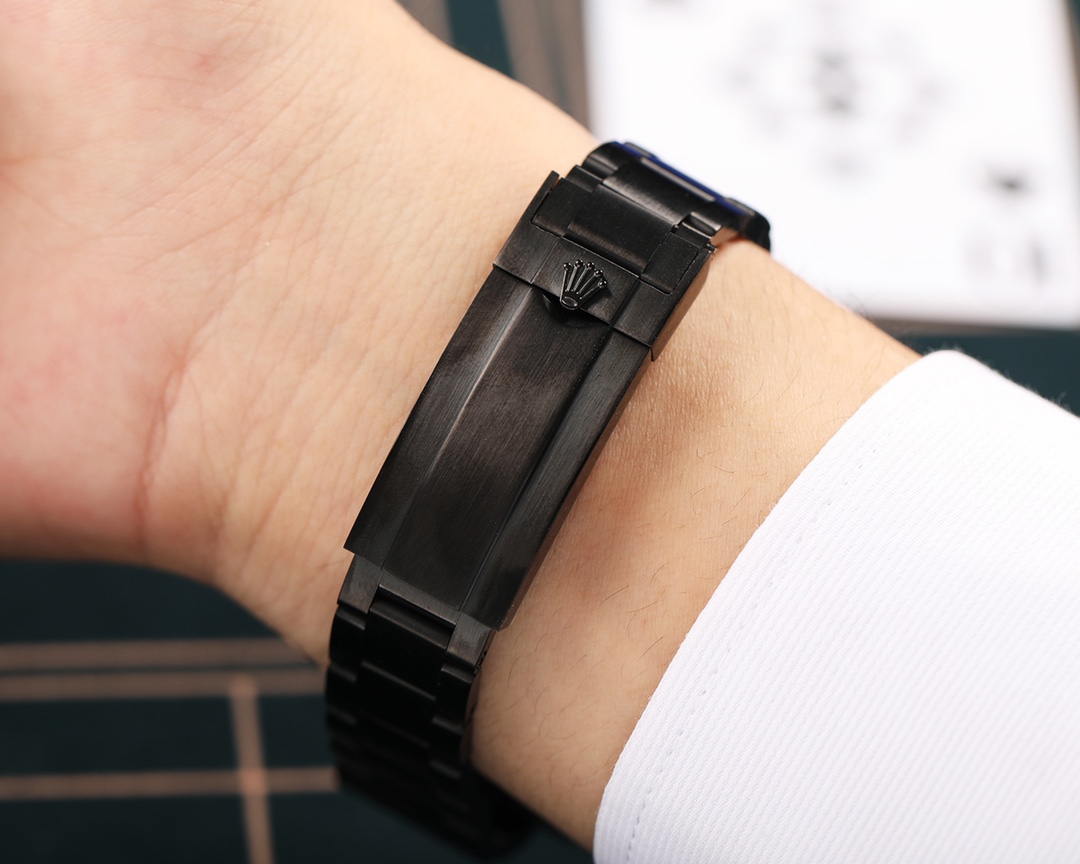 The meticulous craftsmanship of this BLAKEN special edition Submariner is evident in every detail. At a standard 40mm size, it houses the ETA2836 automatic mechanical movement, a stalwart known for its reliability and precision in the world of premium replicas. The case, crafted from 904L stainless steel, is enveloped in a deep DLC (Diamond-Like Carbon) coating, renowned for its formidable scratch resistance. This combination of materials creates a watch that’s not only aesthetically striking but also built to withstand the rigors of daily wear.