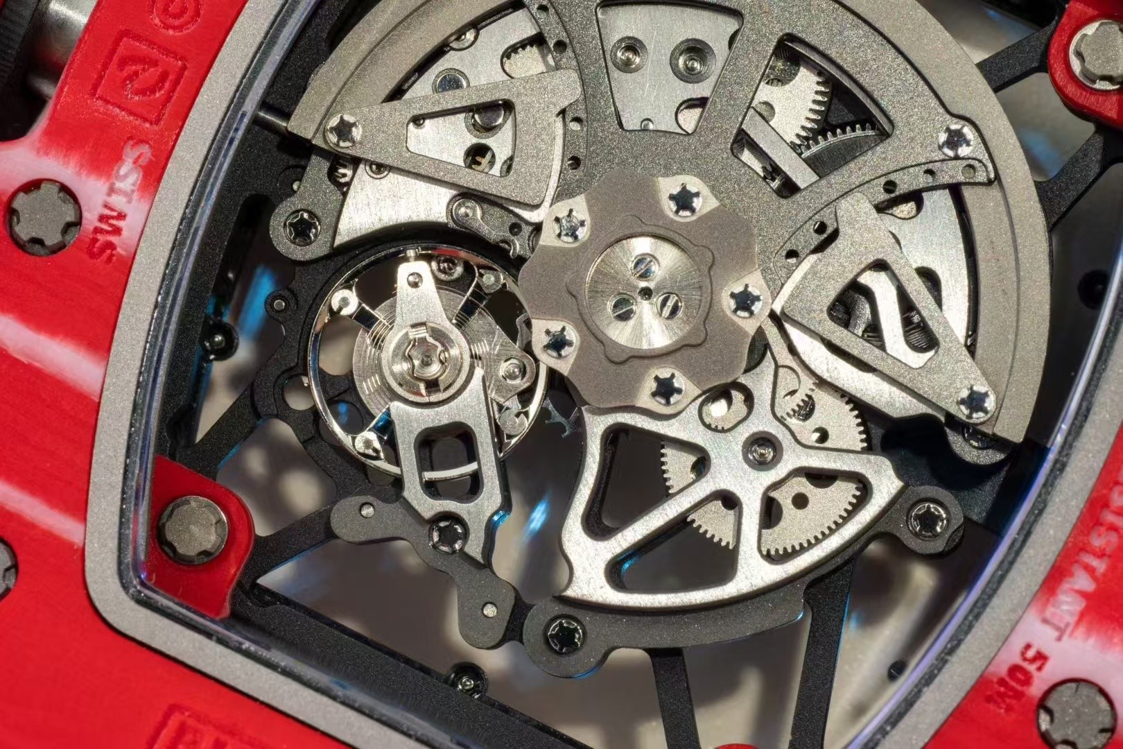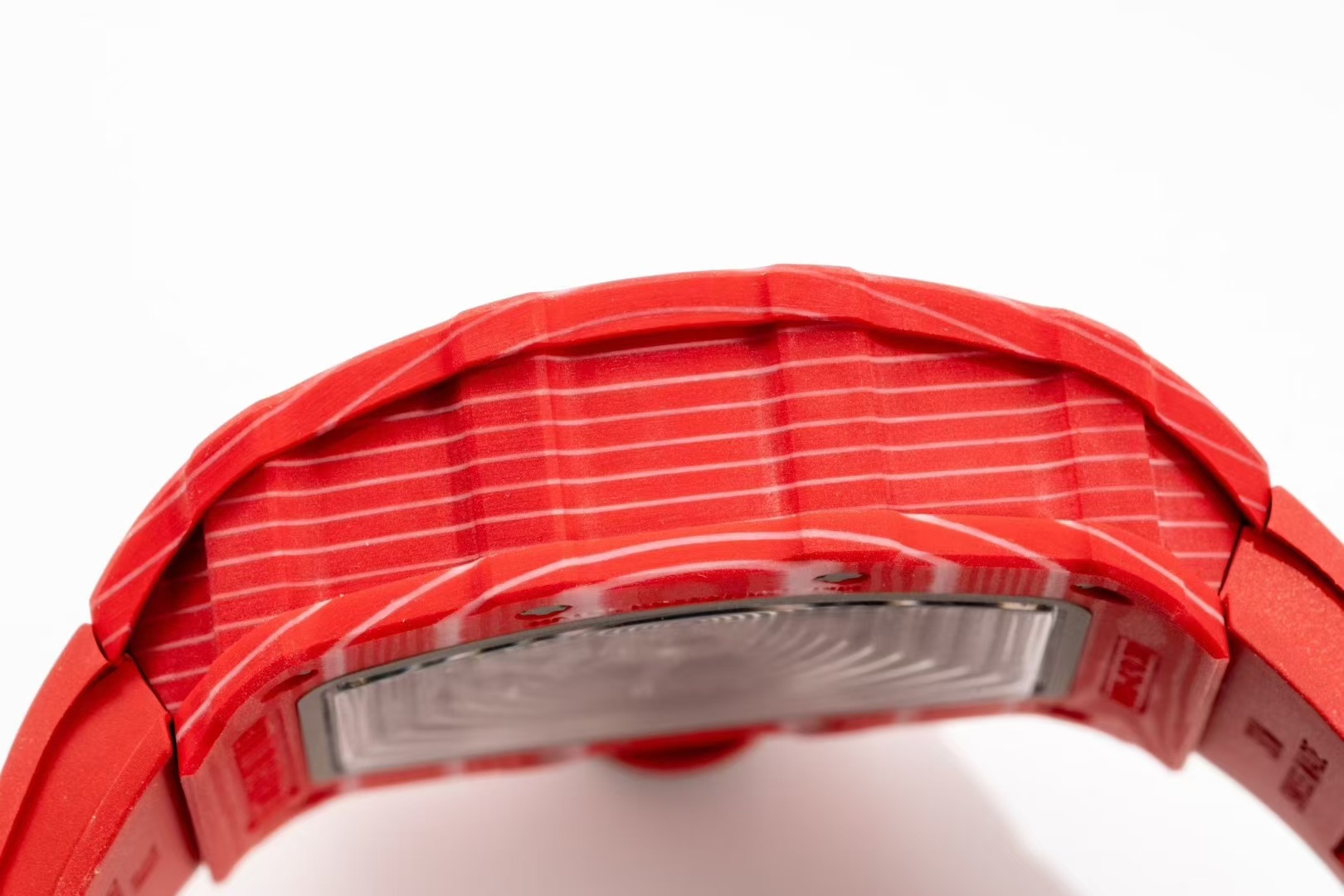 At the heart of the APS RM35-02 is the use of NTPT carbon fiber, a material renowned for its exceptional lightness and durability. The APS replica embraces the brand’s ethos of “extreme lightweight” and “impact resistance,” while also ensuring the design remains faithful to the original model’s bold aesthetics. NTPT carbon fiber is characterized by its pronounced textural pattern, akin to the larger, more dynamic version of the RM055 models, offering both a tactile and visual appeal that is unmistakably Richard Mille.