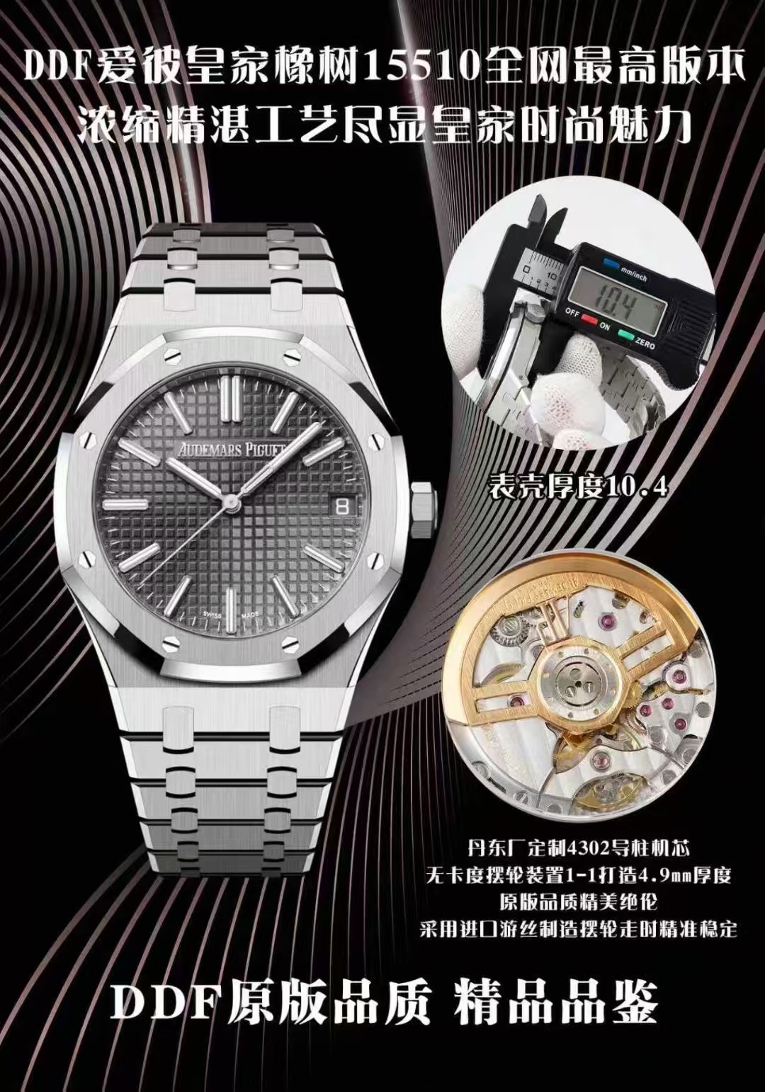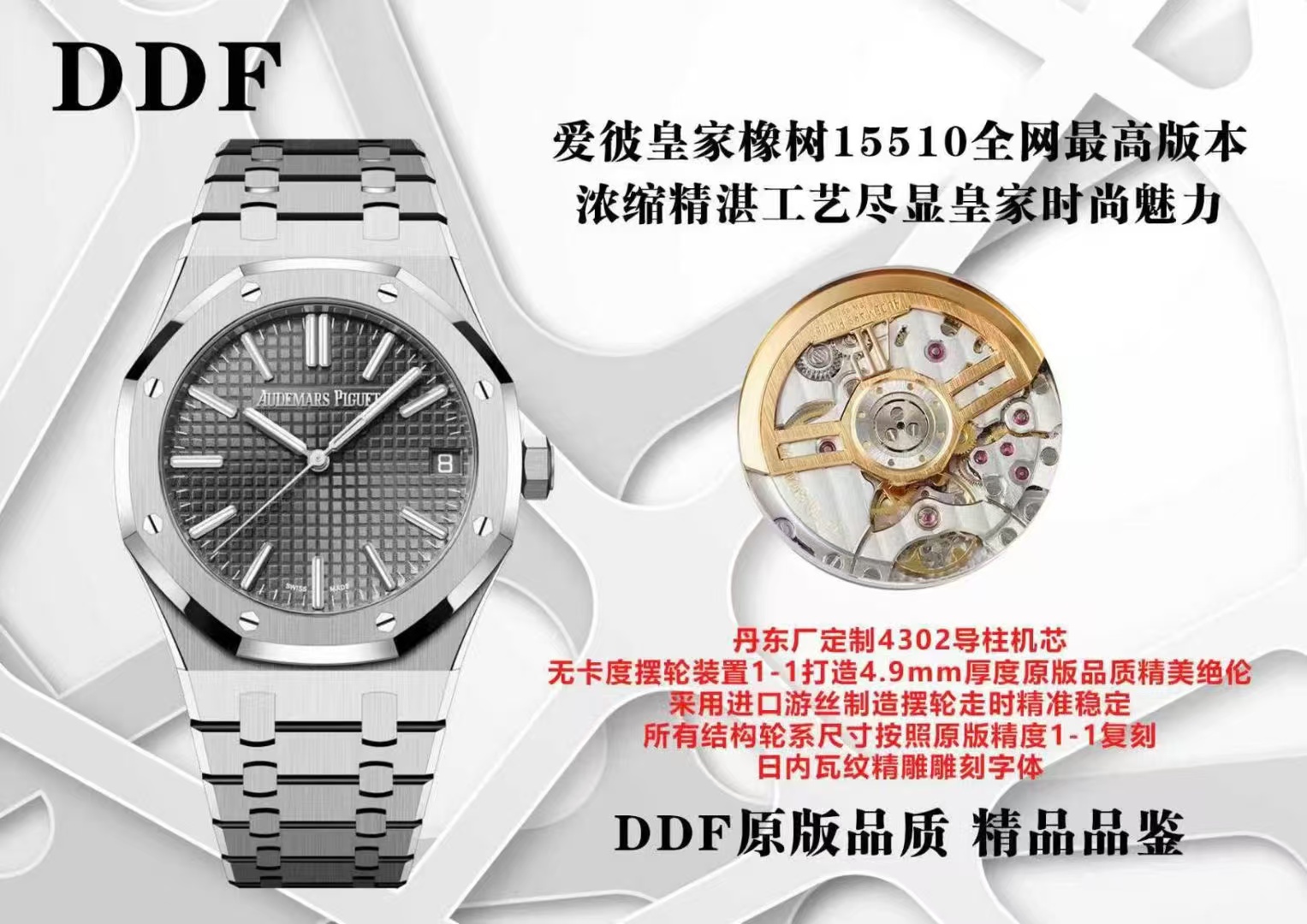 The replica’s fidelity extends to its design details. The hour and minute hands adopt a slightly slimmer profile, while the second hand exceeds the length of the original by 0.5mm. The dial maintains the iconic Audemars Piguet logo with precision, featuring finely sculpted characters that match the original specifications—such as the elongated foot of the ‘A’ and the subtle angle in the middle line of the ‘E’. The dial’s waffle pattern is amplified to provide a uniform, three-dimensional texture true to the original, while the date window is laser-cut for sharp, pristine edges.