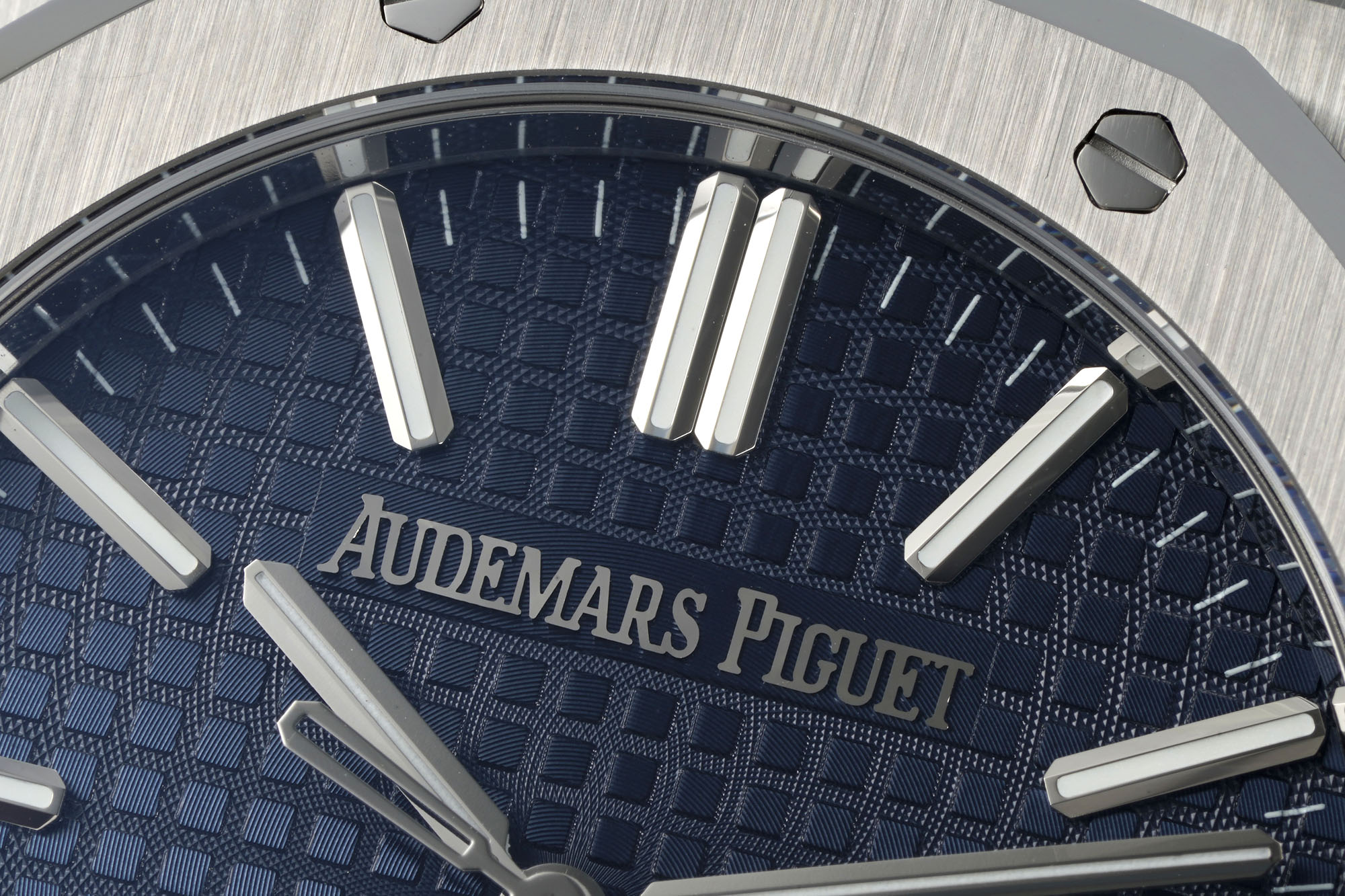 The Royal Oak’s aesthetic appeal is further captured in the replica’s date window, intricately laser-engraved with four-axis precision, presenting a cohesive blend of upper 3D formation and clean, smooth lower surfaces. The hexagonal bezel screw placements are refined to perfection, offering a polished, high-gloss appearance devoid of blemishes. This detail underlines the replica’s adherence to luxury design standards, creating a seamless transition between form and function.