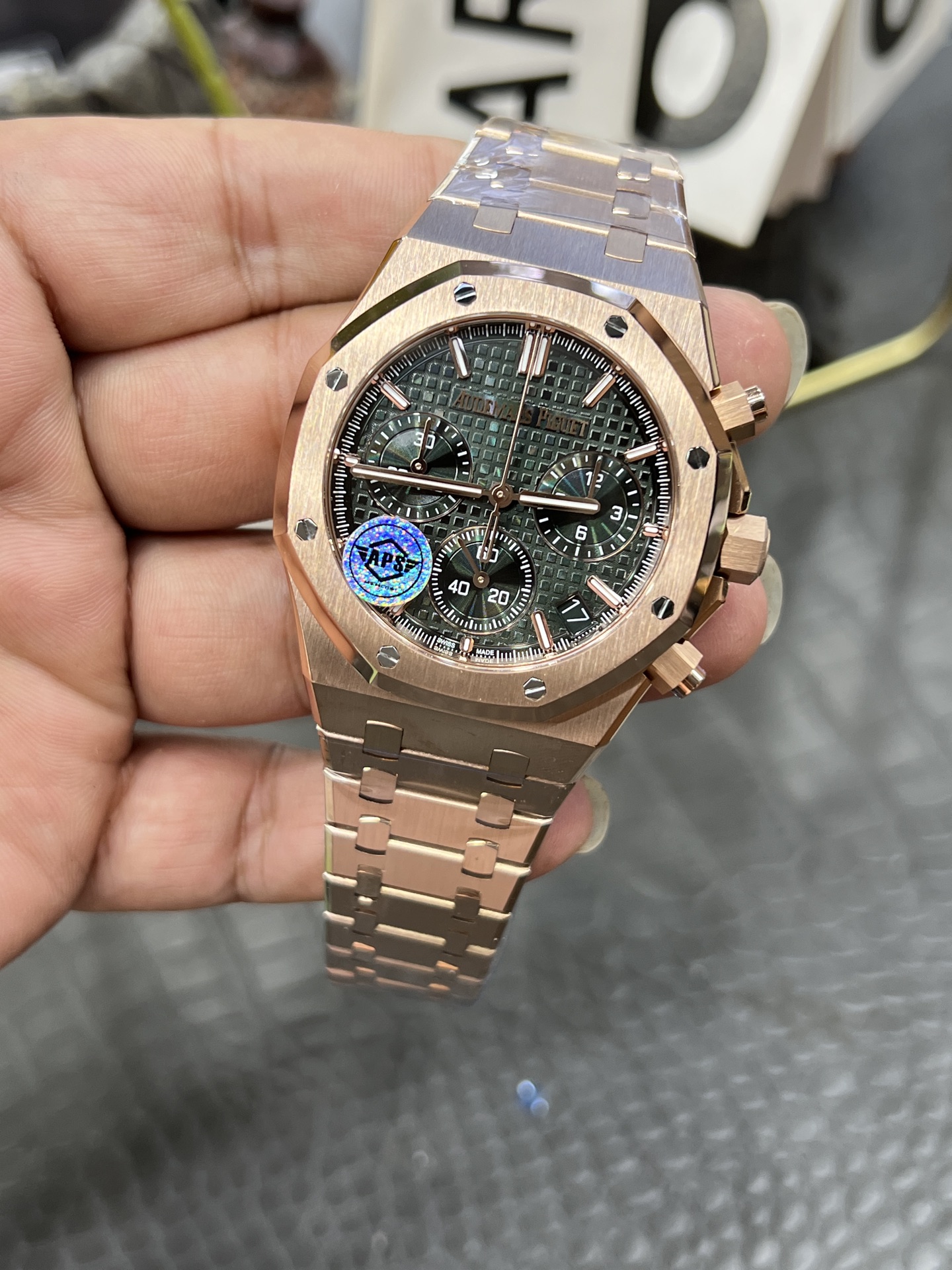 The choice of rose gold is a deliberate nod to elegance and status, embodying Audemars Piguet’s signature style that combines luxury with functionality. The 41mm case size strikes a balance between boldness and wearability, making it suitable for a variety of occasions, from formal events to daily wear. The green dial offers a refreshing contrast against the warmth of rose gold, capturing light and providing a dynamic look that is bound to attract admiring glances.