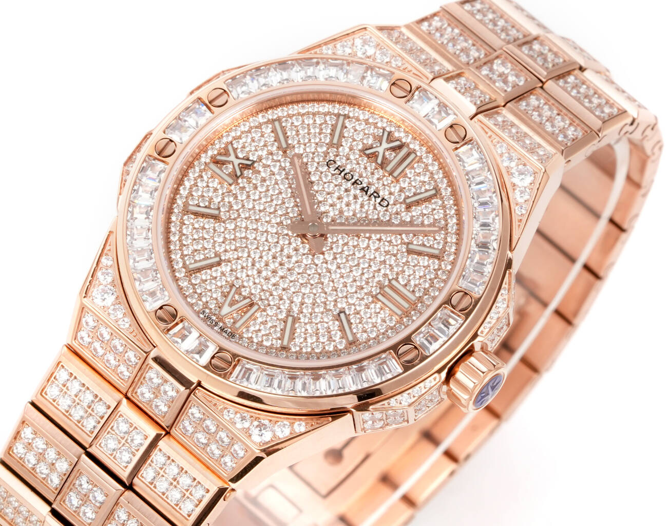 At first glance, the watch captivates with its rugged yet elegant 41mm x 9.7mm dimensions, harmonizing the mountain-inspired design with metropolitan sophistication. The dial, reminiscent of rocky textures, is skillfully embedded with rhodium-plated Roman numerals, while the hour and minute hands are enhanced with Super-LumiNova® X1, ensuring visibility in dim conditions. The bracelet, designed from a mold that replicates the original golden brick pattern, speaks to Chopard’s commitment to melding form with function, presenting an integrated design that feels both substantial and refined.