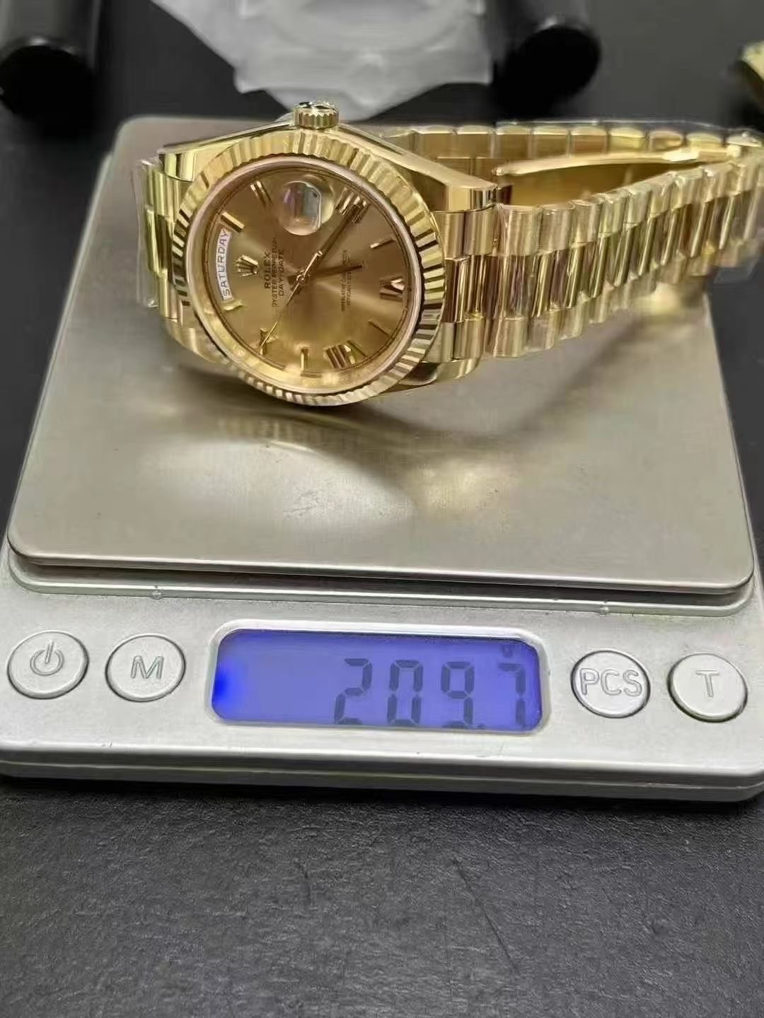 The latest version of the replica Rolex Day-Date sets itself apart with its meticulous attention to detail and quality. Weighing approximately 209 grams, this model achieves an unprecedented level of realism, mirroring the heft and feel of the original Day-Date. The use of an advanced, non-peeling plating technology ensures that the watch’s gold finish remains intact, offering durability that rivals that of the genuine article. This model also boasts the ability to reapply gold plating without elongating the bracelet links, a feature that further enhances its authenticity and longevity.