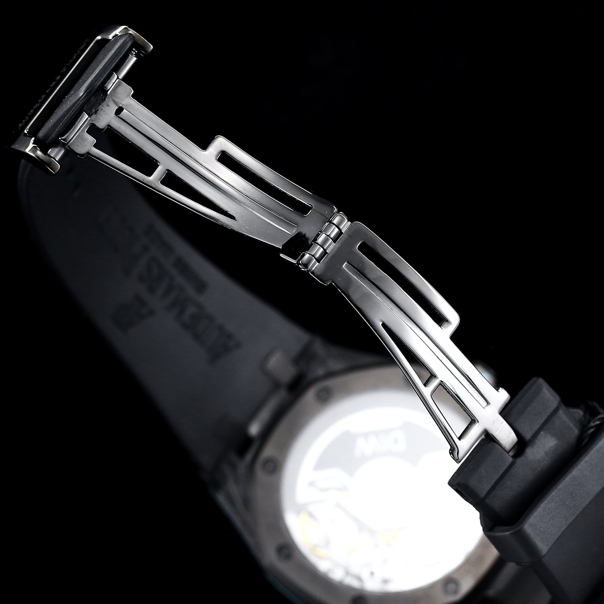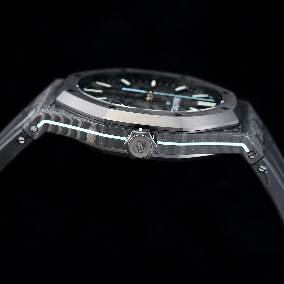 The Audemars Piguet Royal Oak 15500 has long been celebrated for its distinctive design and mechanical prowess. However, the VOIDLINE AP series redefines its physical characteristics by adopting NTPT carbon fiber, a material known for its exceptional strength-to-weight ratio. At a mere 85 grams, the DiW Carbon Royal Oak stands as a testament to the transformative potential of modern materials in luxury watchmaking. The 41mm carbon fiber case and DLC-coated elements not only reduce weight but elevate durability without compromising the iconic aesthetics of the Royal Oak design.