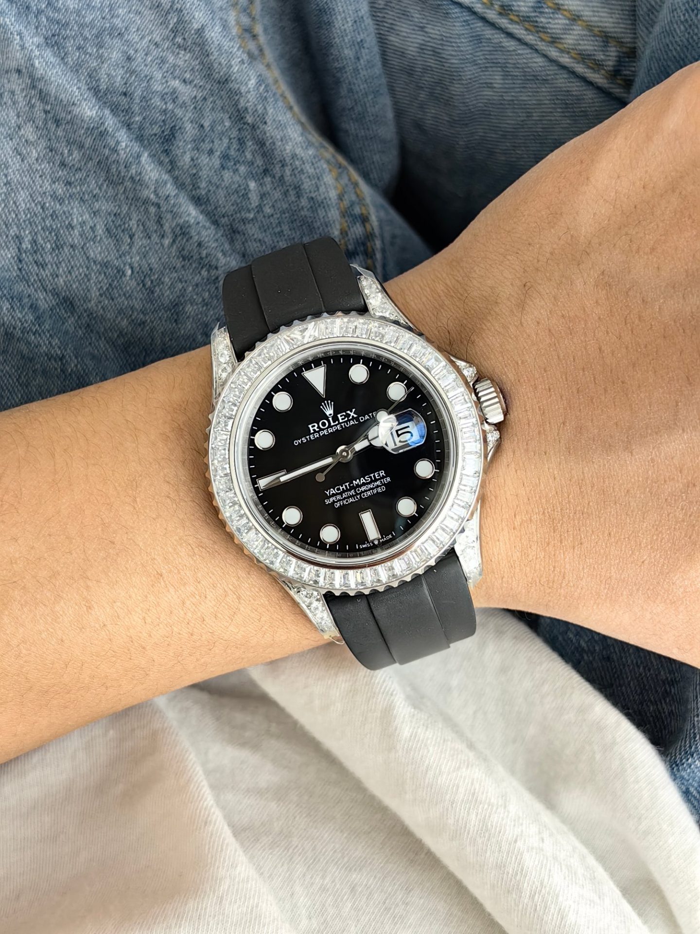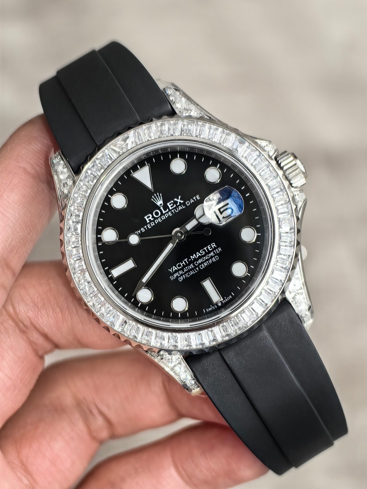 Under the hood, the Yacht-Master is powered by the latest version of the fully automatic Caliber 3235, offering robust performance and a 72-hour power reserve. This sophisticated movement, renowned for its reliability in the original Rolex line-up, underscores the technological integration and precision craftsmanship invested in this replica. Such mechanics challenge preconceived notions about the capabilities of replica watches, offering a substantial experience that competes with authentic movements.