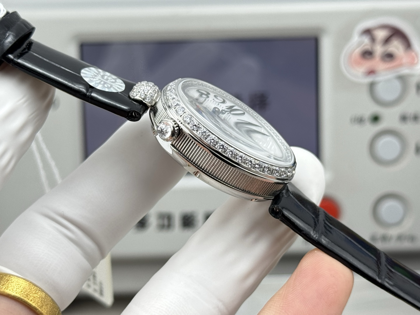 The GR replica maintains the Reine de Naples’ distinctive shape, featuring a smaller 33 x 25 millimeter case that echoes elegance and grandeur. This oviform case is adorned with a coin-edge design, a nod to Breguet’s aesthetic heritage. Around the bezel and case, 117 Swarovski crystals, approximately 0.99 carats in total, add a subtle yet undeniable sparkle. The crown is accentuated with a pear-shaped crystal, weighing around 0.26 carats, further enhancing the watch’s luxurious finish.