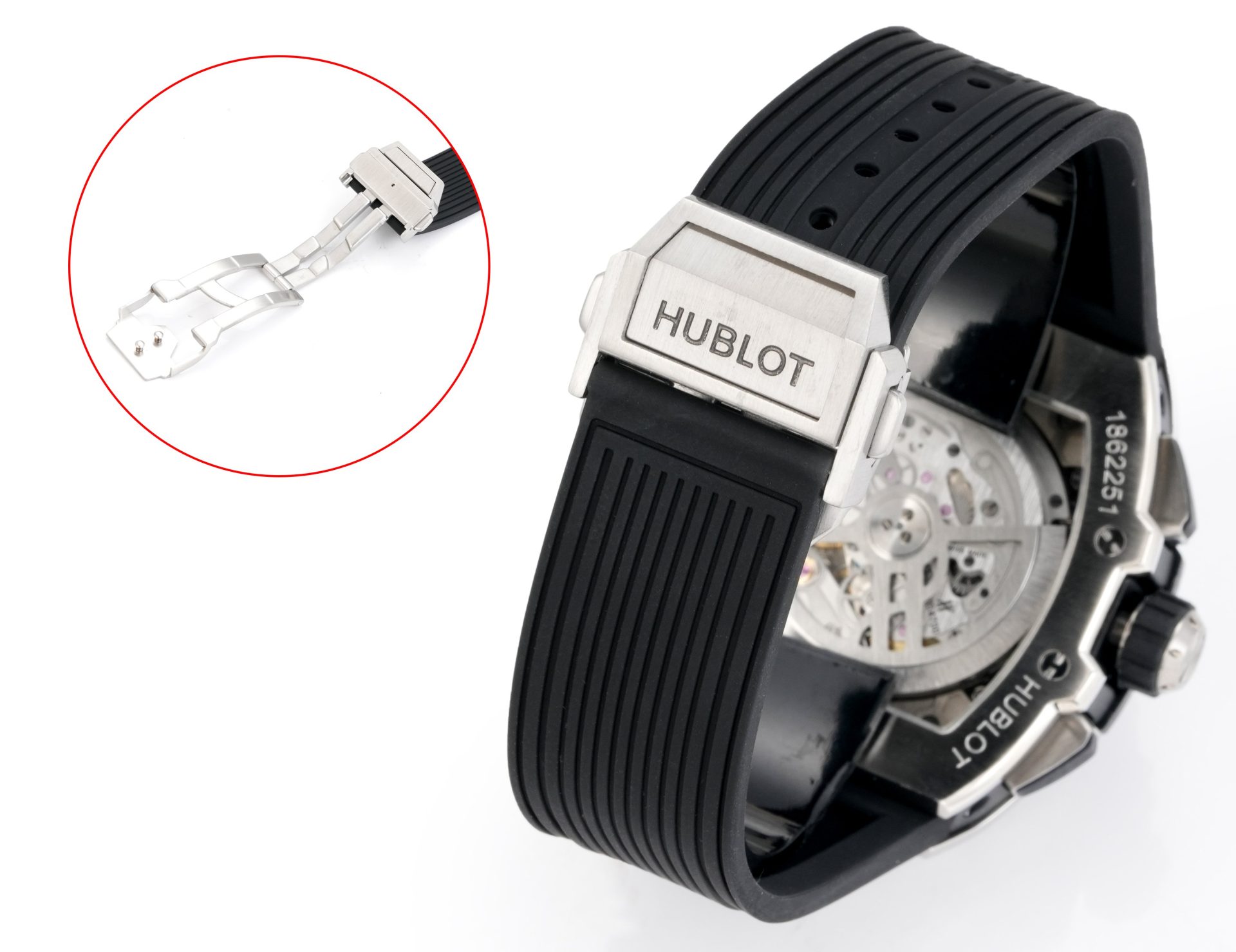 Powered by the meticulously recreated HUB4700 movement, this watch mirrors the technical prowess of its predecessors while introducing enhancements like the upgraded folding clasp. This intricate movement reflects Hublot’s commitment to precision and performance—a dedication that extends to the customized fluoroelastomer strap. The strap, resistant to wear and elements, integrates Hublot’s unique ‘One-click’ strap exchange system, allowing for effortless customization. This feature interconnects convenience with luxury, allowing users to adapt their timepiece to varying occasions and personal styles with a simple mechanism.