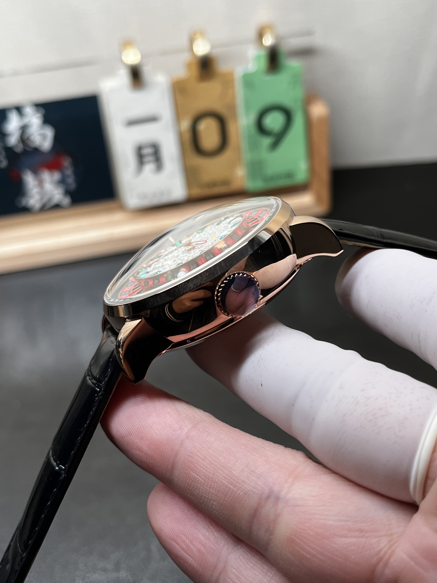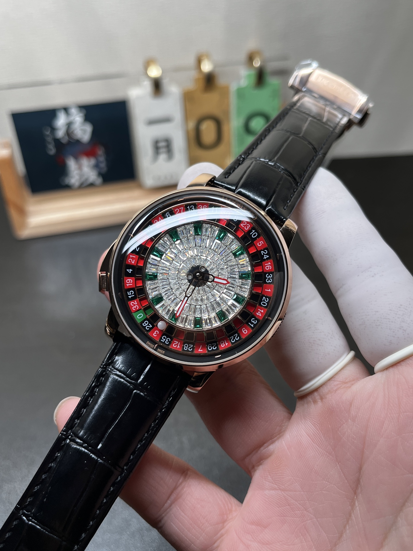 The Casino Tourbillon stands out for its intricate blend of a tourbillon mechanism with a functional roulette wheel. At the heart of this watch is the tourbillon, a complication prized for its ability to enhance accuracy by mitigating the effects of gravity on the watch’s escapement. This function is wrapped in an enticing casino theme, with a roulette setup featuring 37 pockets—comprising a single green, 18 red, and 18 black slots—and a white ceramic ball. The wheel’s rotation is driven by high-quality ball bearings that minimize friction, ensuring smooth, high-speed spins and an optimal degree of randomness. This mechanical feat transforms the traditionally static experience of timekeeping into a dynamic, interactive display akin to the thrill of a Las Vegas roulette table.