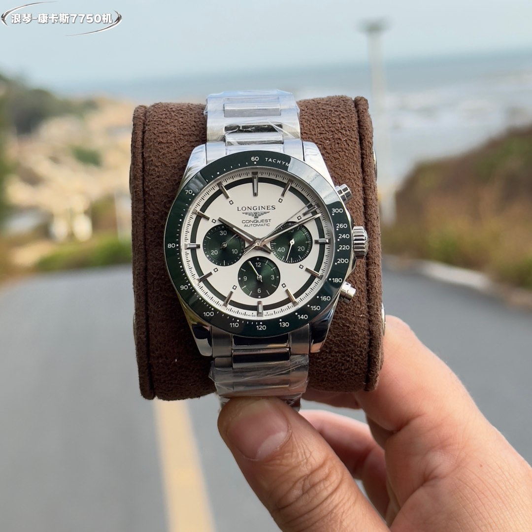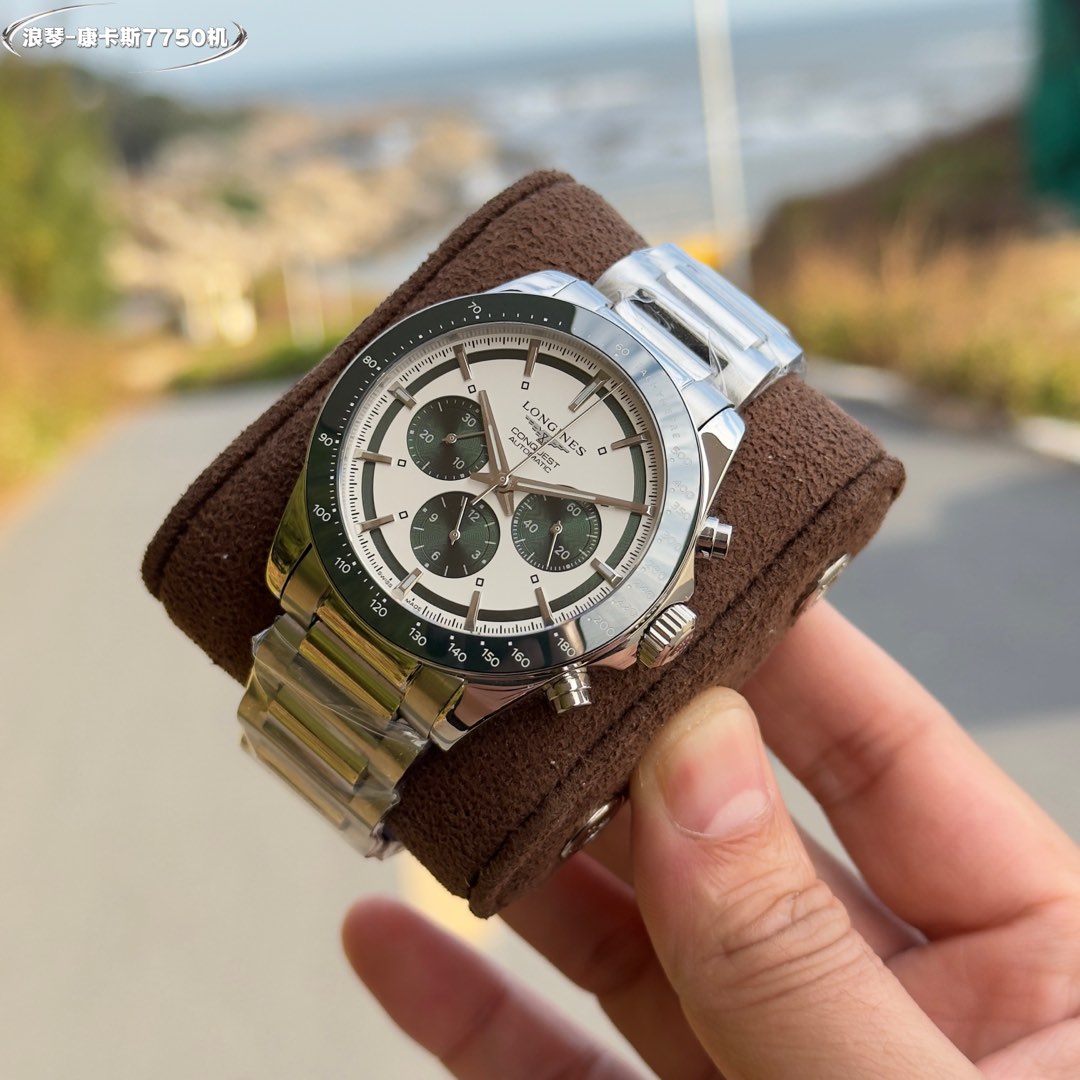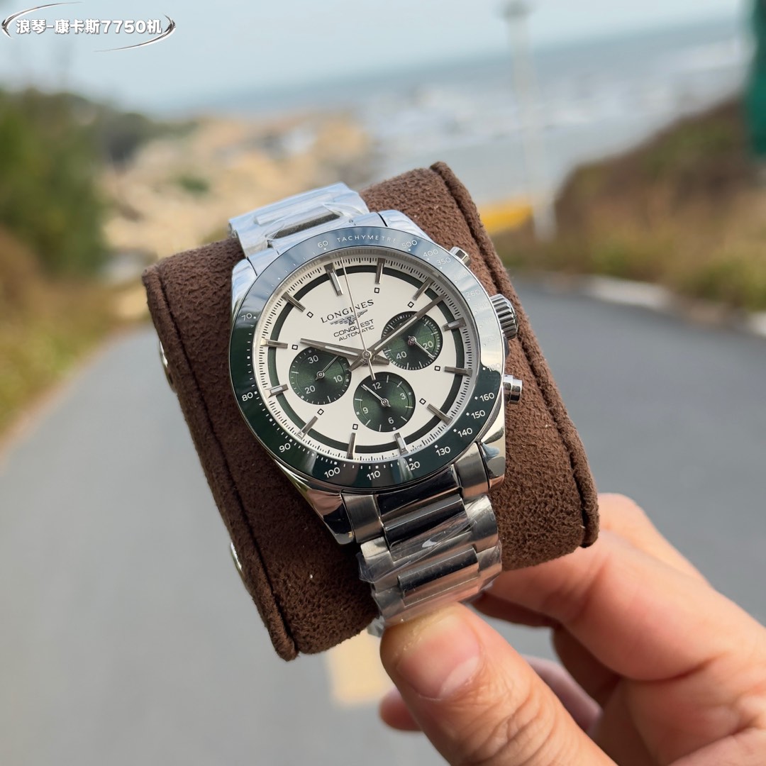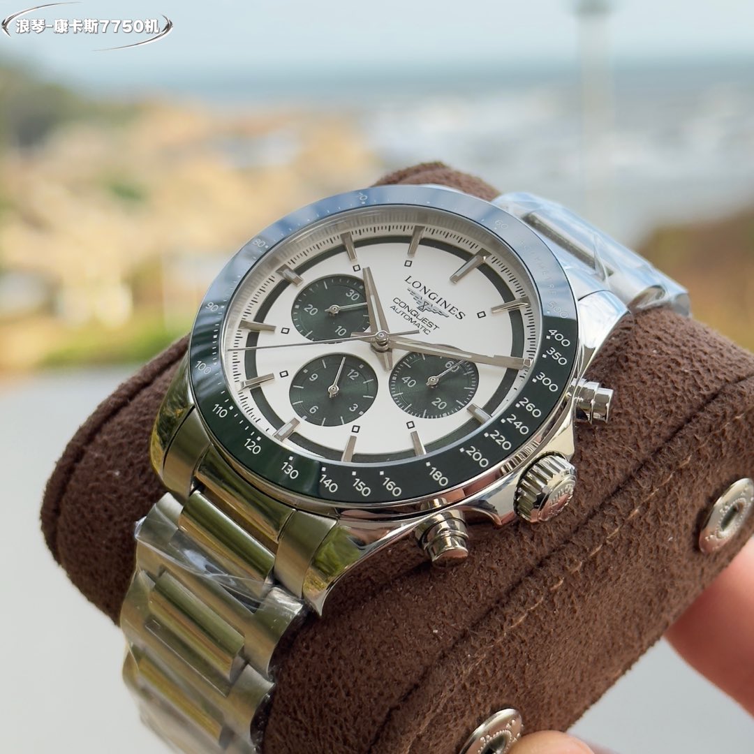 The Conquest V.H.P stands out with its distinctive “panda eye” design—a term that describes the striking contrast in dial colors such as “black and white,” “deep sea blue,” “far mountain green,” and “champagne gold.” This design is complemented by a stylish black ceramic bezel, adding a touch of modernity to its classic allure. The three sub-dials enhance its functionality, providing a robust chronograph feature that appeals to those who appreciate both fashion and technical prowess in a wristwatch.