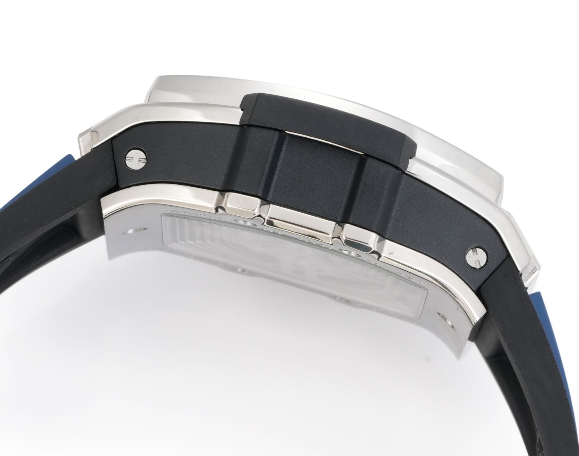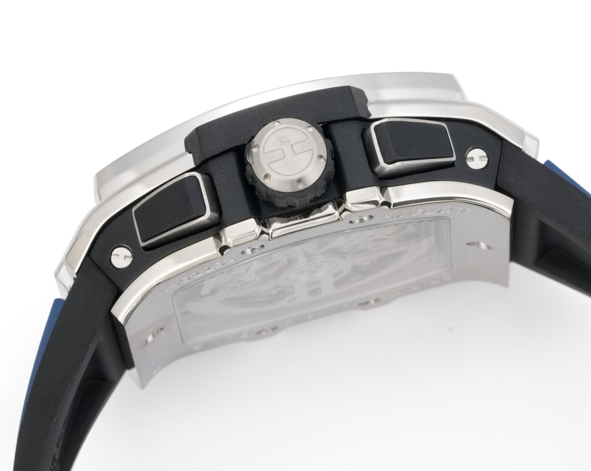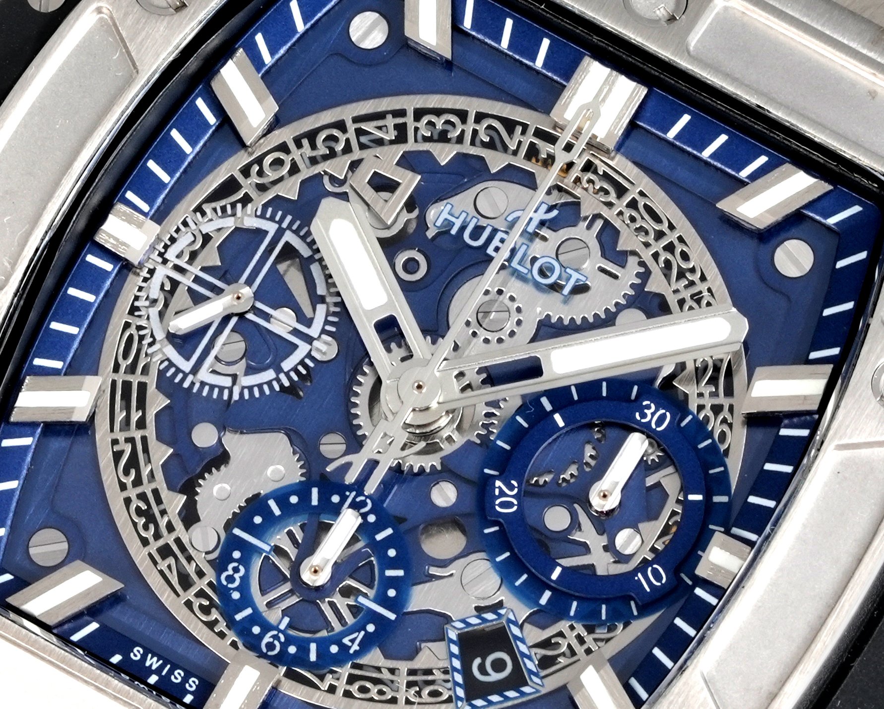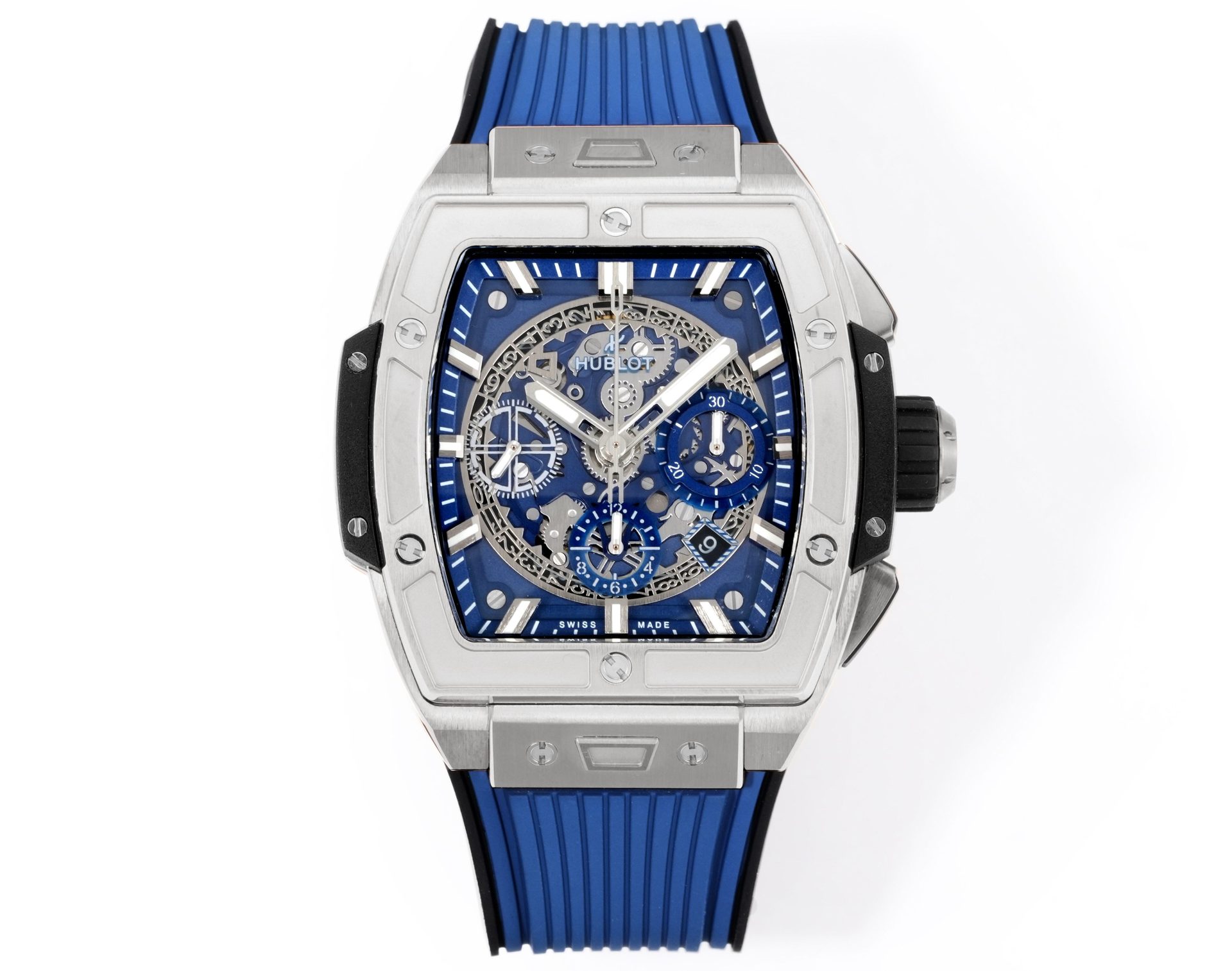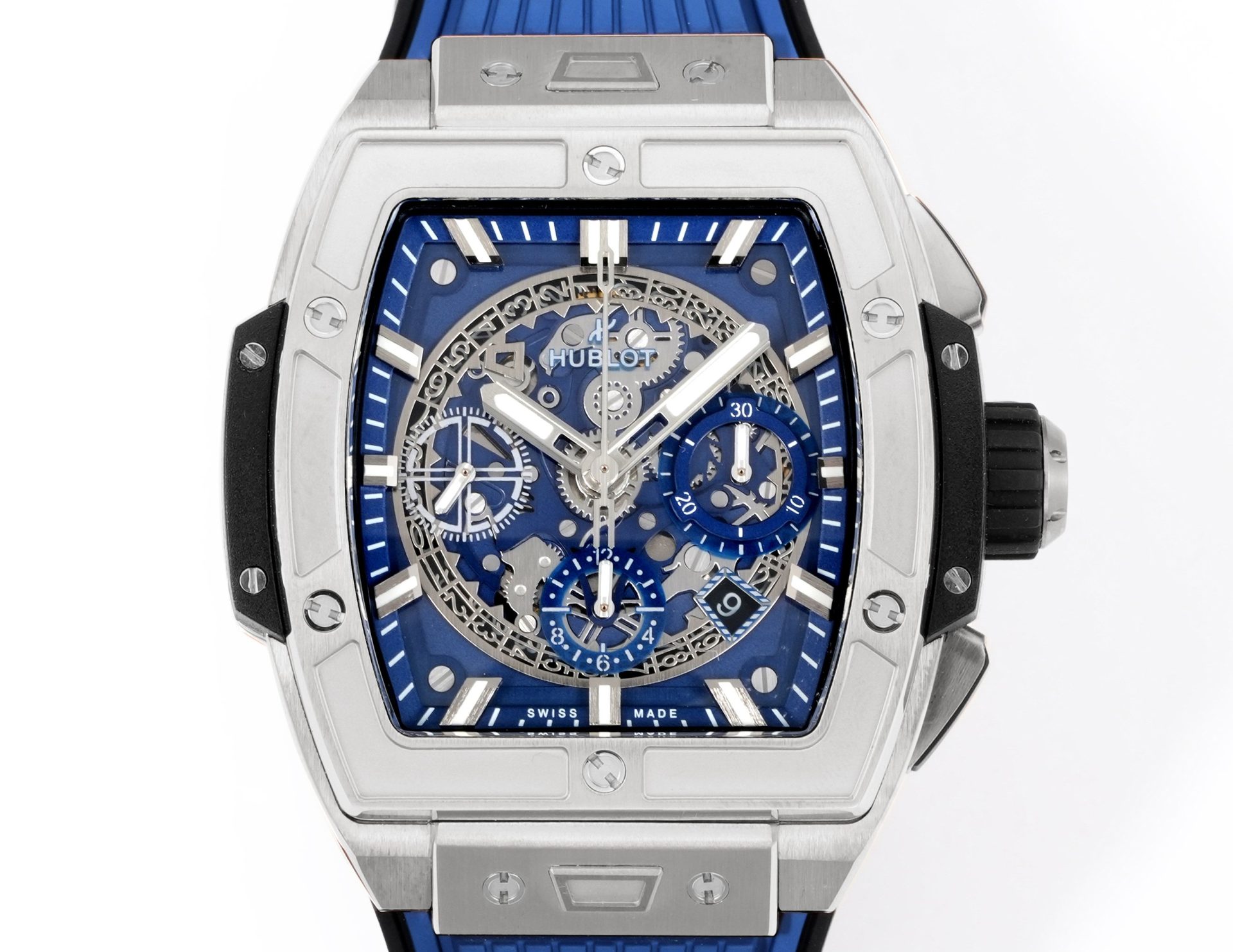 The Spirit of Big Bang’s barrel-shaped case is an engineering marvel, harmoniously marrying titanium and resin. By employing these diverse materials, Hublot achieves a structural ‘sandwich’ design, meticulously held together by six H-shaped screws. This approach not only enhances durability but also pays homage to the brand’s philosophy of melding disparate elements into a cohesive whole. The choice of titanium, known for its strength-to-weight ratio and resistance to corrosion, ensures that the watch remains a lightweight yet robust companion.