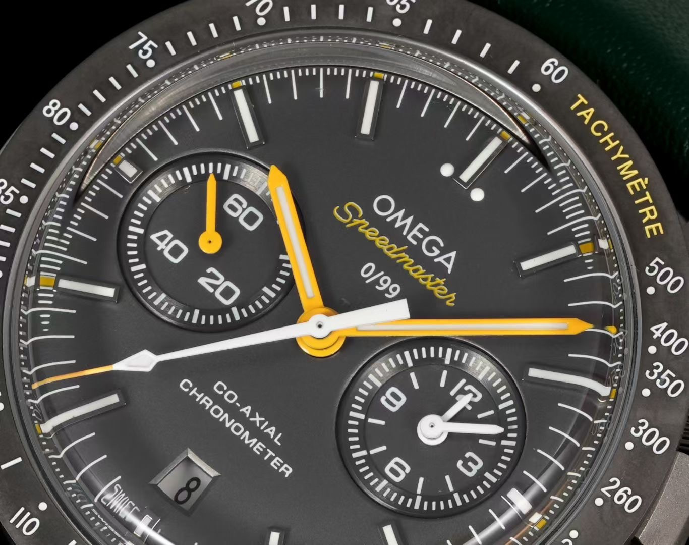 The choice of materials in the ‘Dark Side of the Moon’ reflects Omega’s commitment to durability and style. The ceramic bezel, noted for its robust luster, plays host to luminescent markers that ensure readability in all lighting conditions. This use of black ceramic is not only aesthetically striking but also extraordinarily resistant to scratches—a nod to Omega’s forward-thinking approach to watchmaking.