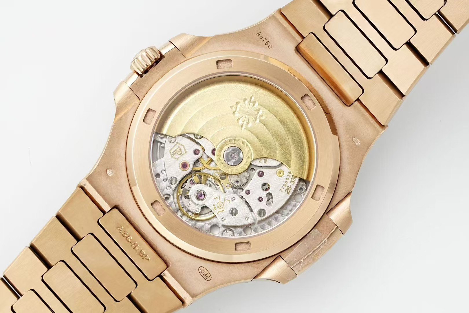 At the heart of the DDF Nautilus is the custom Calibre 330 movement. This replica offers identical calendar functions, typography, and thickness to the original, carving a niche for itself in the realm of functional precision. The rotor weight and finishing, including the intricate leaf pattern and slanted edge, reinforce its status as a near-perfect emulation of the original’s mechanical sophistication.