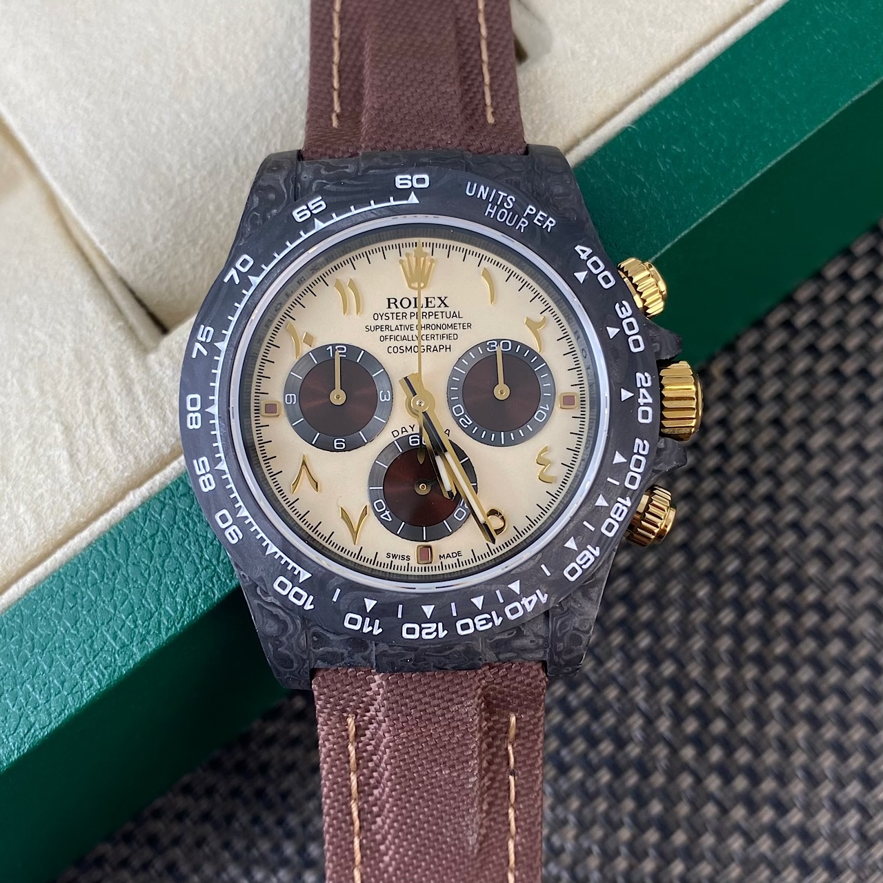 The Rolex GMT-Master II has always been synonymous with robustness and luxury, a timepiece built to accompany globetrotters on their adventures across time zones. However, a recent collaboration with the bespoke brand Diw has birthed a variant that pushes the boundaries of horological innovation—the Rolex Daytona Carbon Fiber Super Limited GMT-Master II. Utilizing the same carbon fiber material found in Lamborghini cars, this model presents a novel exploration into lightweight luxury without compromising the integrity and prestige that Rolex is known for.