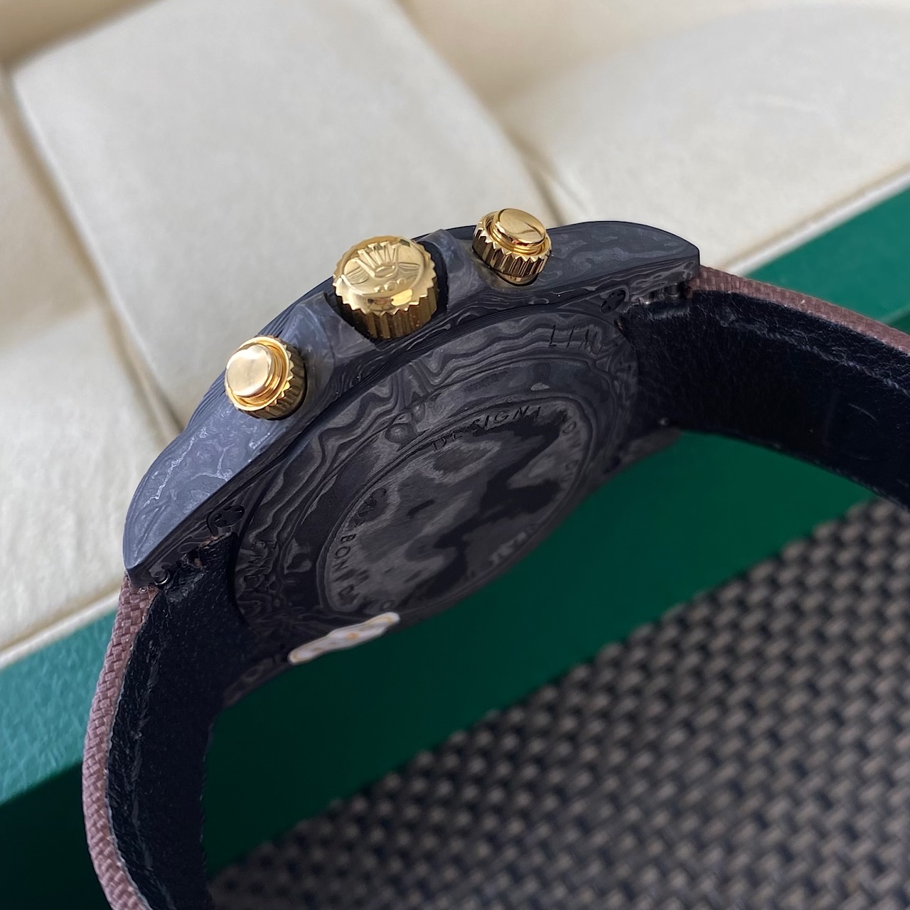 The case of this limited edition is constructed entirely from carbon fiber, offering a significant reduction in weight without sacrificing durability. Carbon fiber is renowned for its strength and for being one of the lightest composite materials, a trait that makes it highly coveted in both automotive and aeronautical engineering. The watch also features a carbon fiber bezel and dial, each characterized by the distinctive irregular texture of the material. This aesthetic not only sets it apart but also speaks to the uniqueness of each piece, as no two watches will have the same pattern.