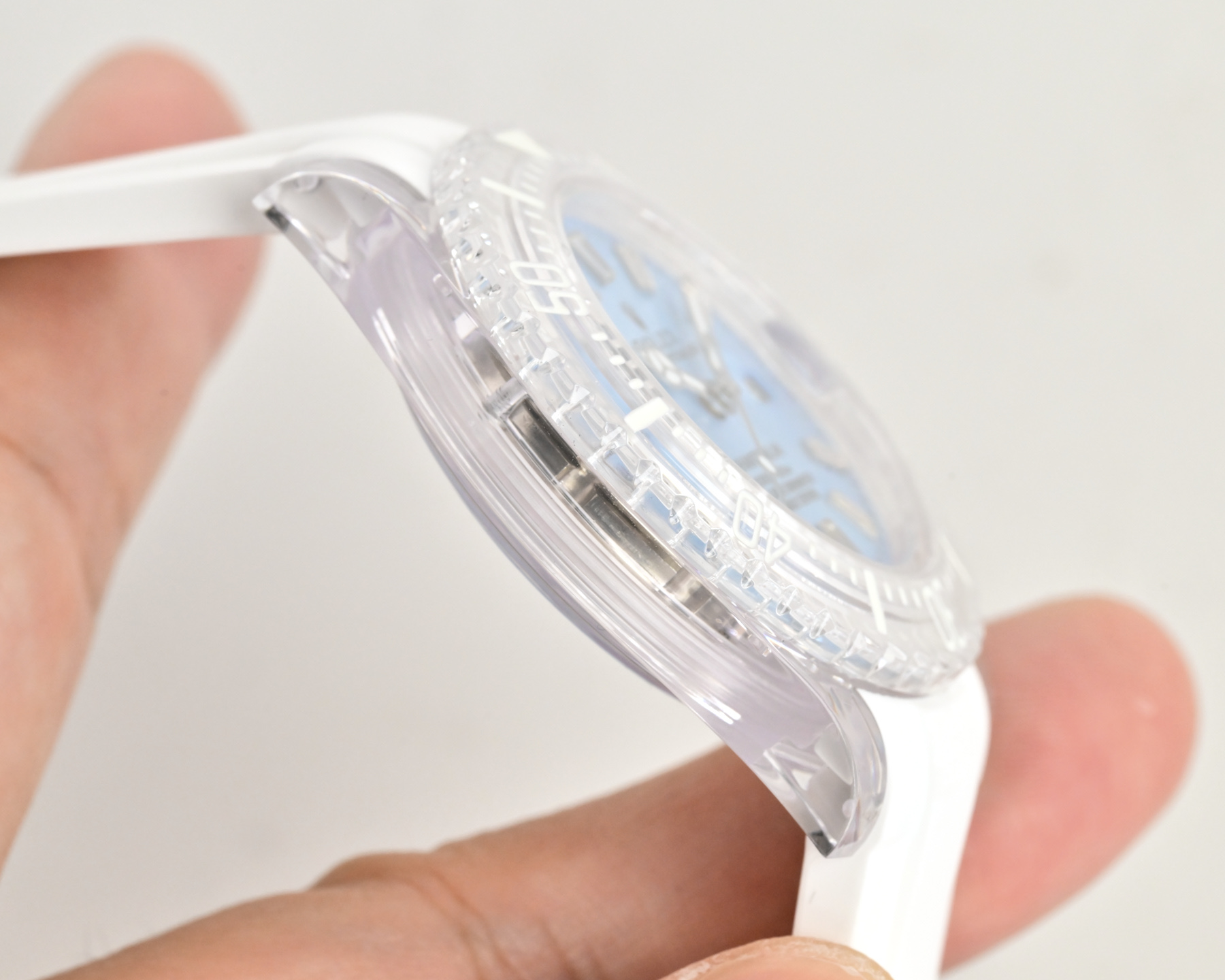 One cannot overlook the distinct 80mm case diameter, a size that breaks free from gender norms and caters to a universal audience. This bold dimension is crafted from “Frosted Polycarbonate-PMMA,” a material celebrated for its remarkable attributes: resistance to yellowing, clarity akin to a pristine crystal, and exceptional scratch resistance. This choice of material marks a significant departure from conventional watchmaking materials, inviting a broader discussion on sustainability and material innovation within the industry.