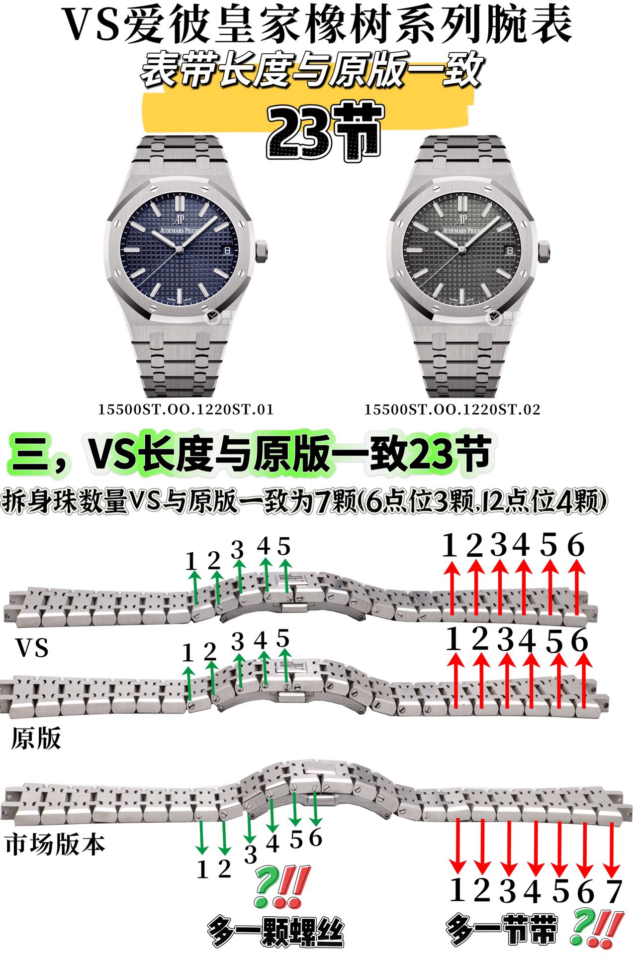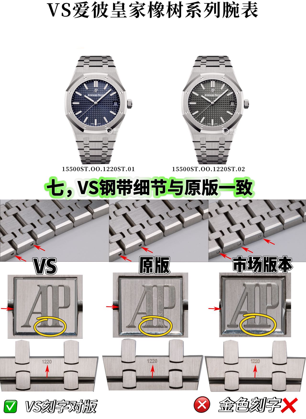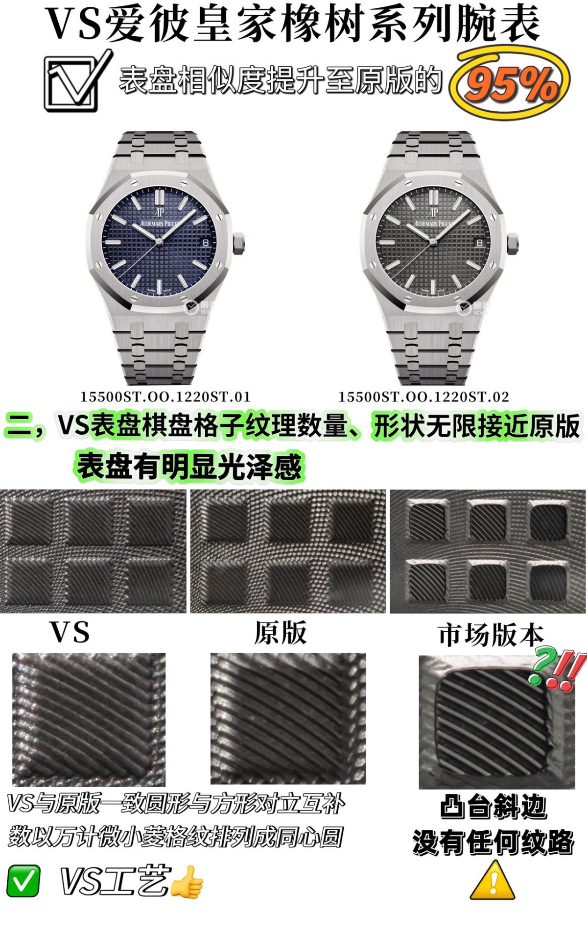 Aesthetic accuracy is another hallmark of this release. The VS AP15500’s dial closely mimics the chessboard texture of its original, boasting a likeness exceeding 95% in similarity, with fine sheen contributing to its delicate allure. The bracelet, precisely fabricated to match the 23 links of the original rather than the 24 commonly seen in lower-tier replicas, showcases the meticulous attention to detail that distinguishes this model. Such design fidelity not only challenges the visual exclusivity of luxury brands but also invites a re-examination of the emotional and status-driven motives behind luxury watch ownership.