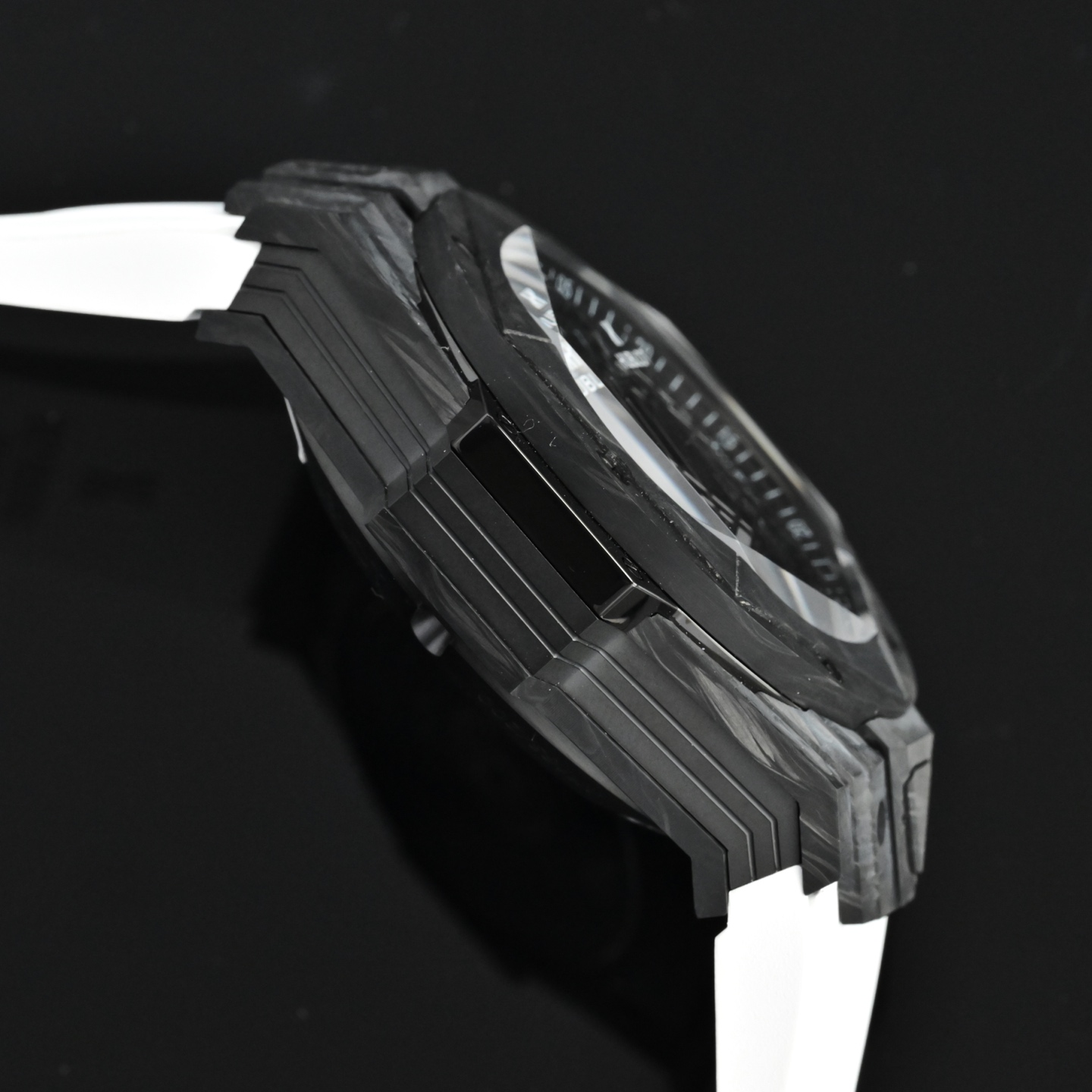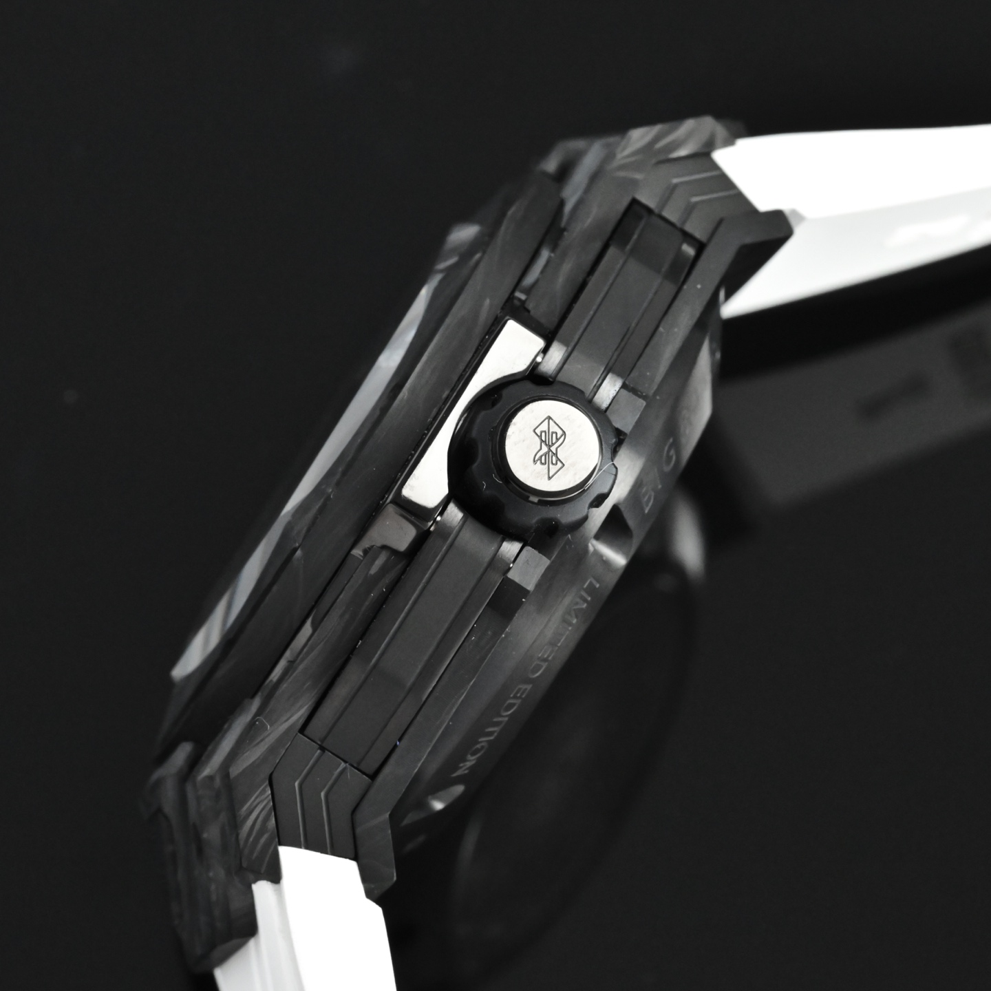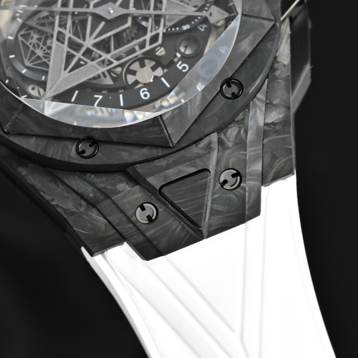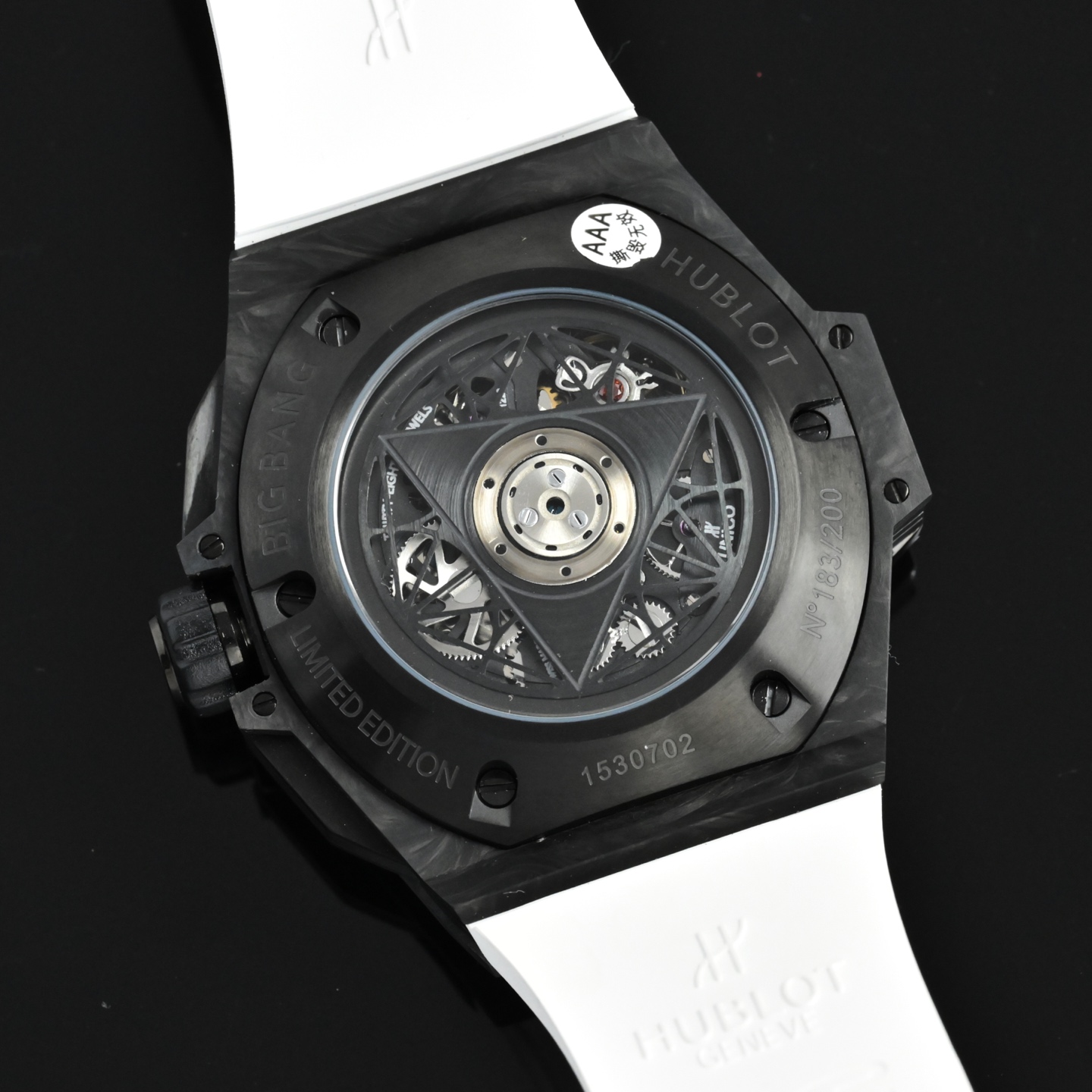 The Big Bang Sang Bleu II continues the geometric legacy of its predecessors, featuring hexagonal and diamond-shaped patterns that are quintessential to the Sang Bleu line. The use of black carbon fiber, however, revolutionizes its appearance. The choice of this material is not merely aesthetic; it represents a strategic maneuver to enhance wearability and endurance. Carbon fiber offers a matte finish with a unique textural depth, ensuring that the watch remains light on the wrist, an essential characteristic for larger-sized timepieces.